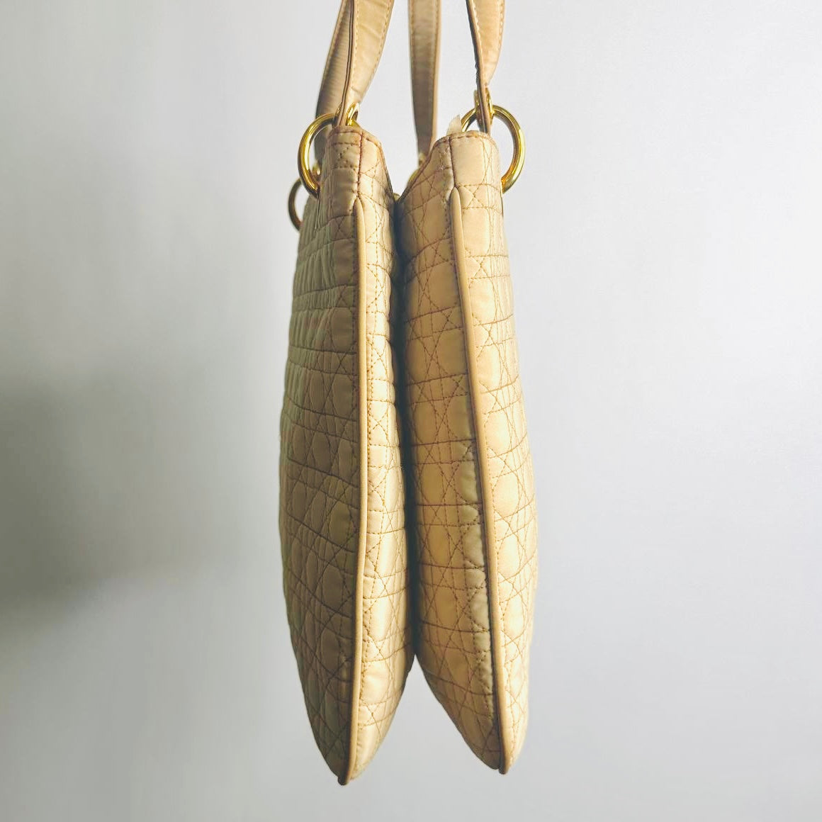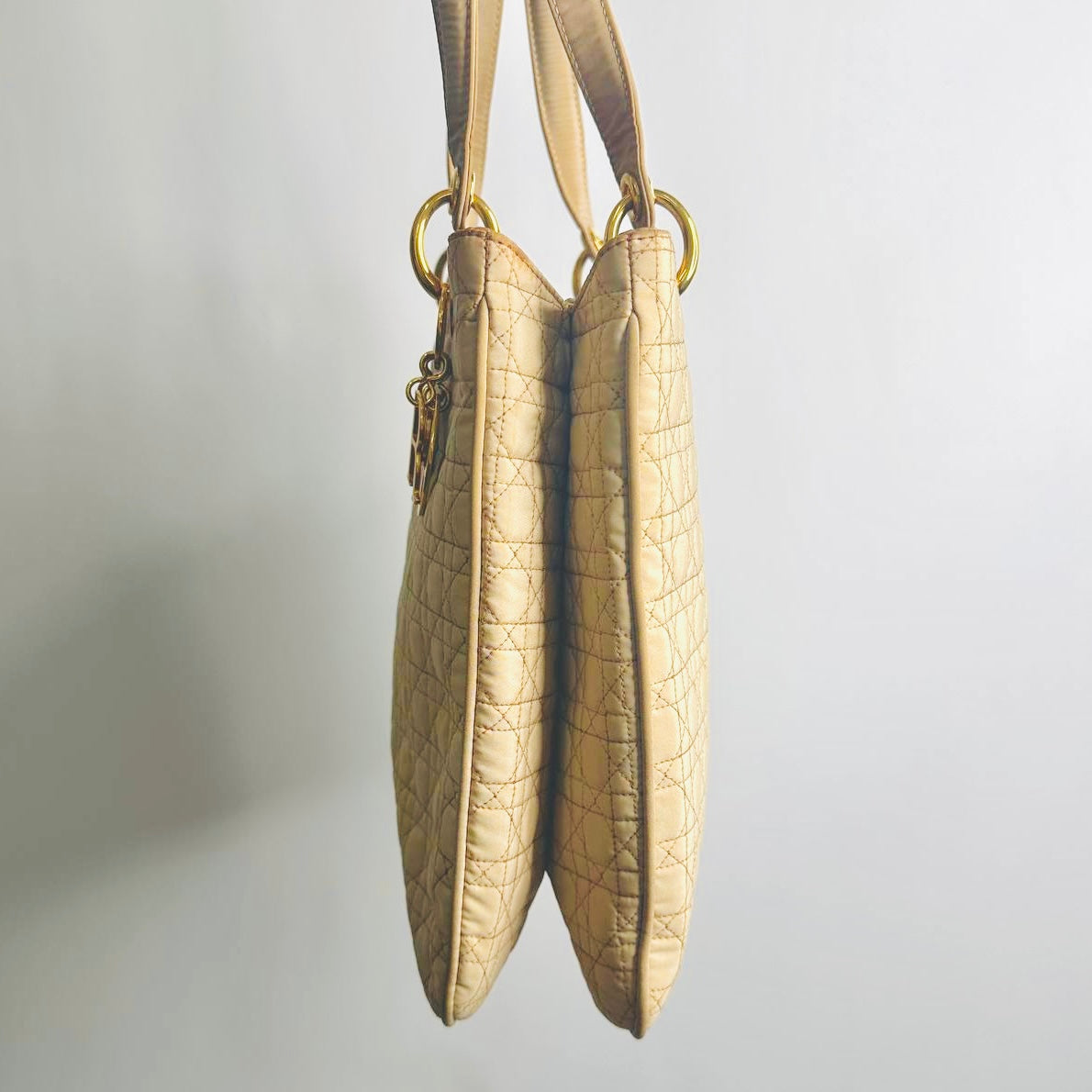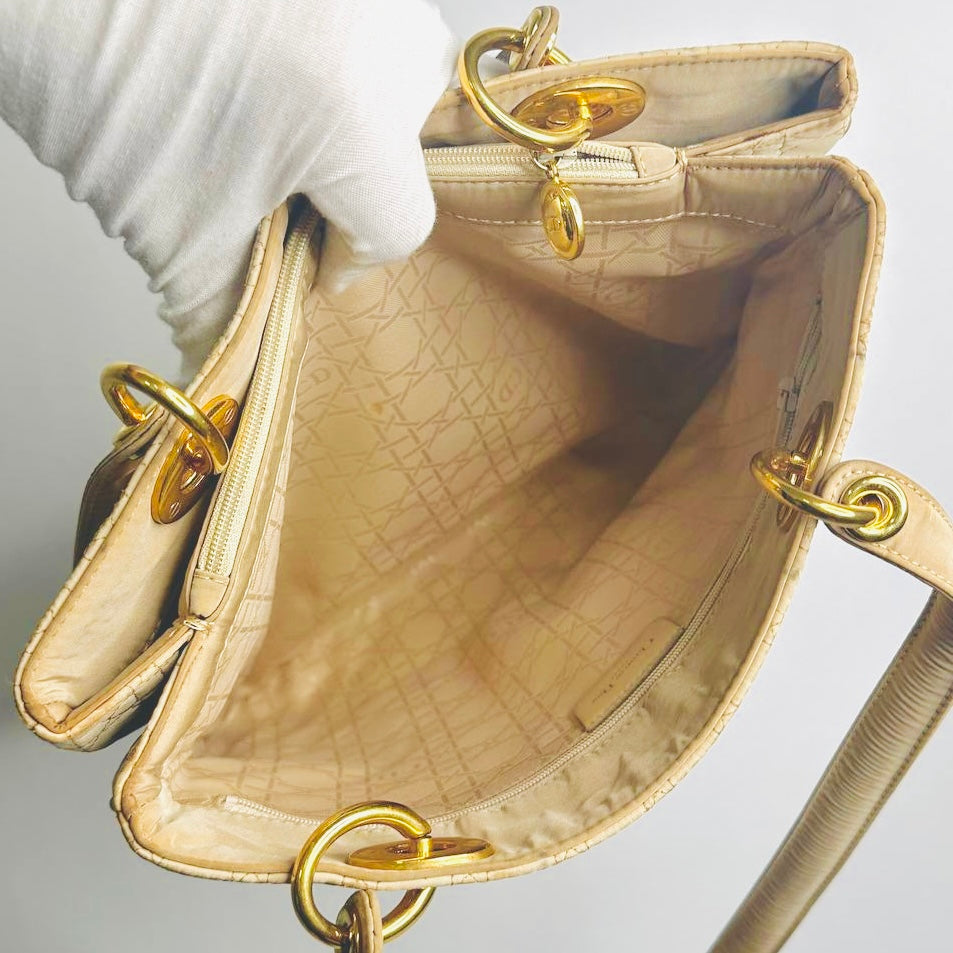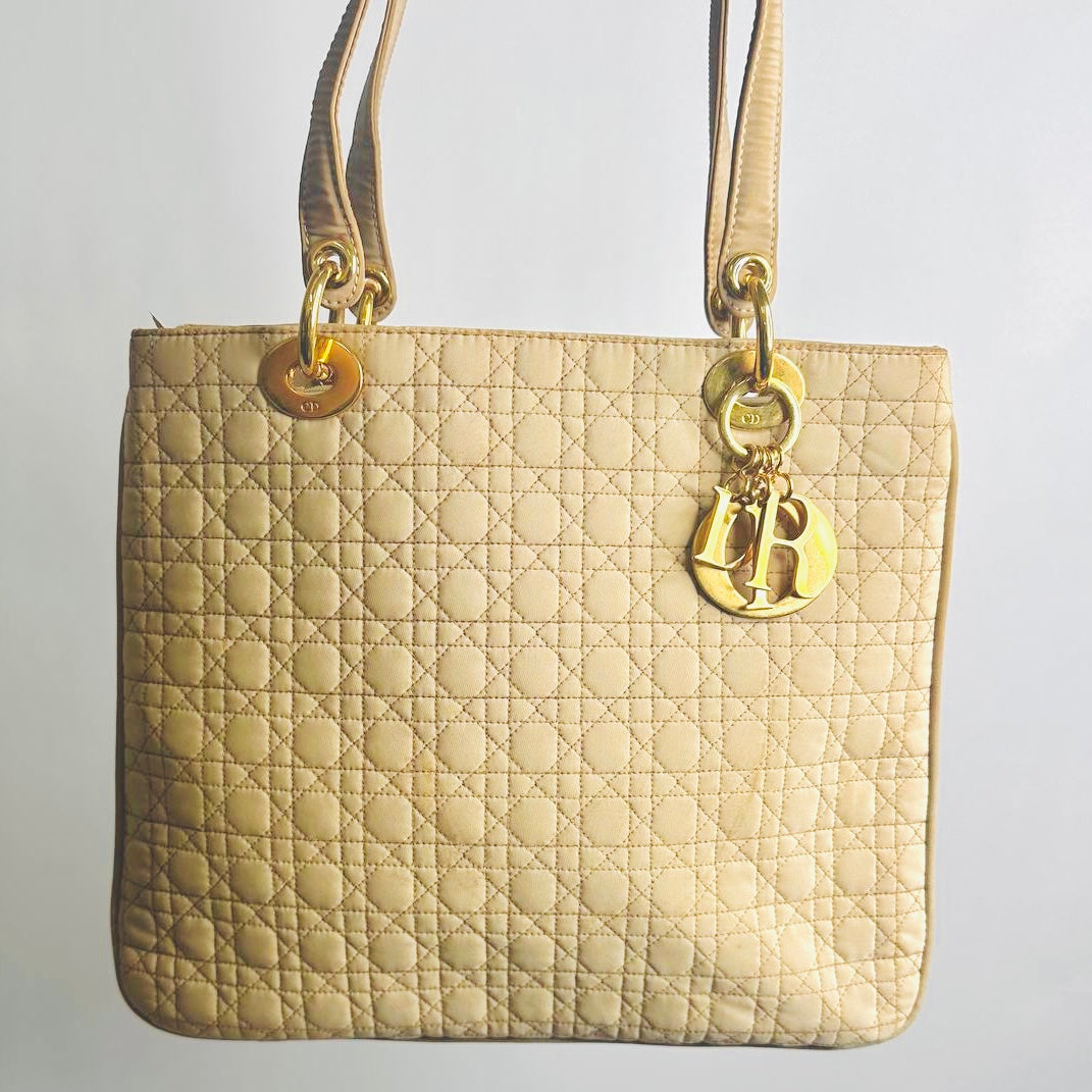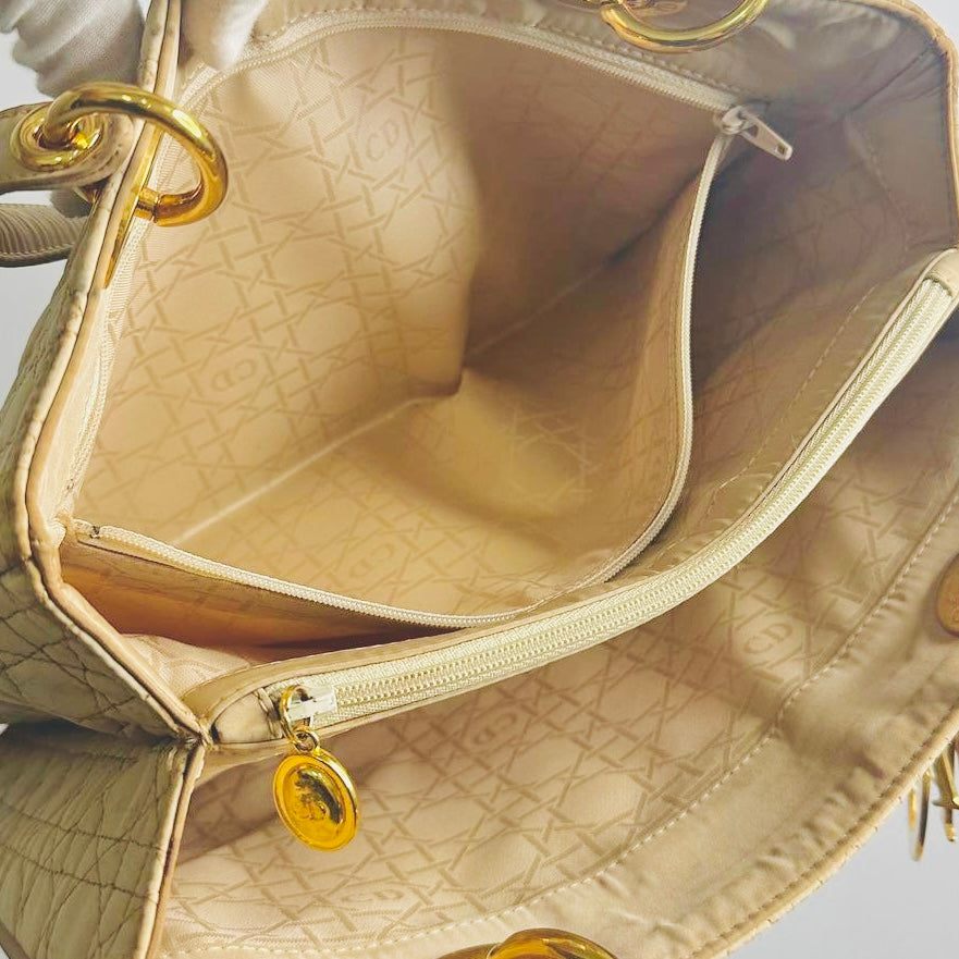 Christian Dior CD Warm Beige GHW Lady Dior Cannage Quilted Fabric Monogram Logo Shoulder Shopper Tote Bag