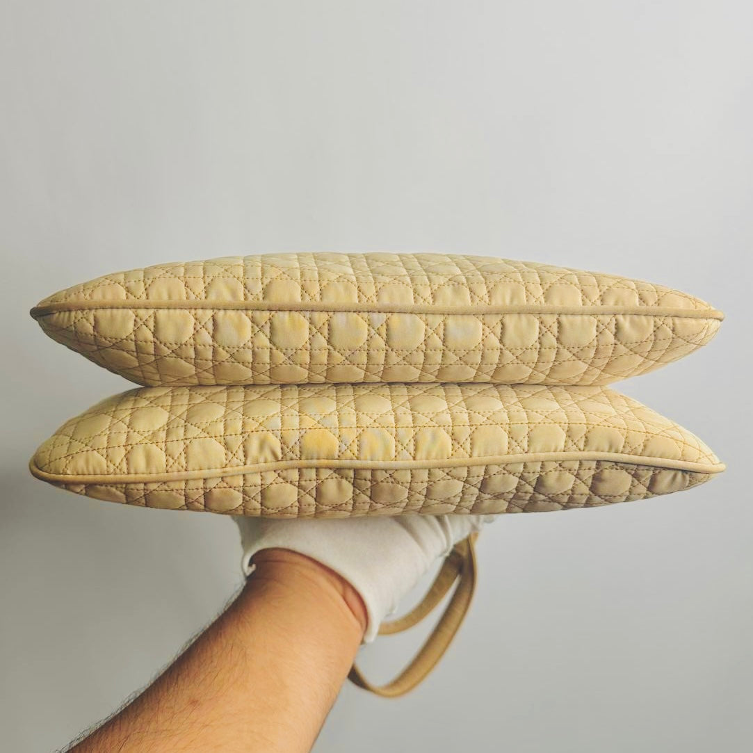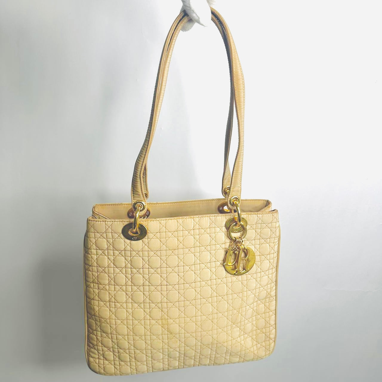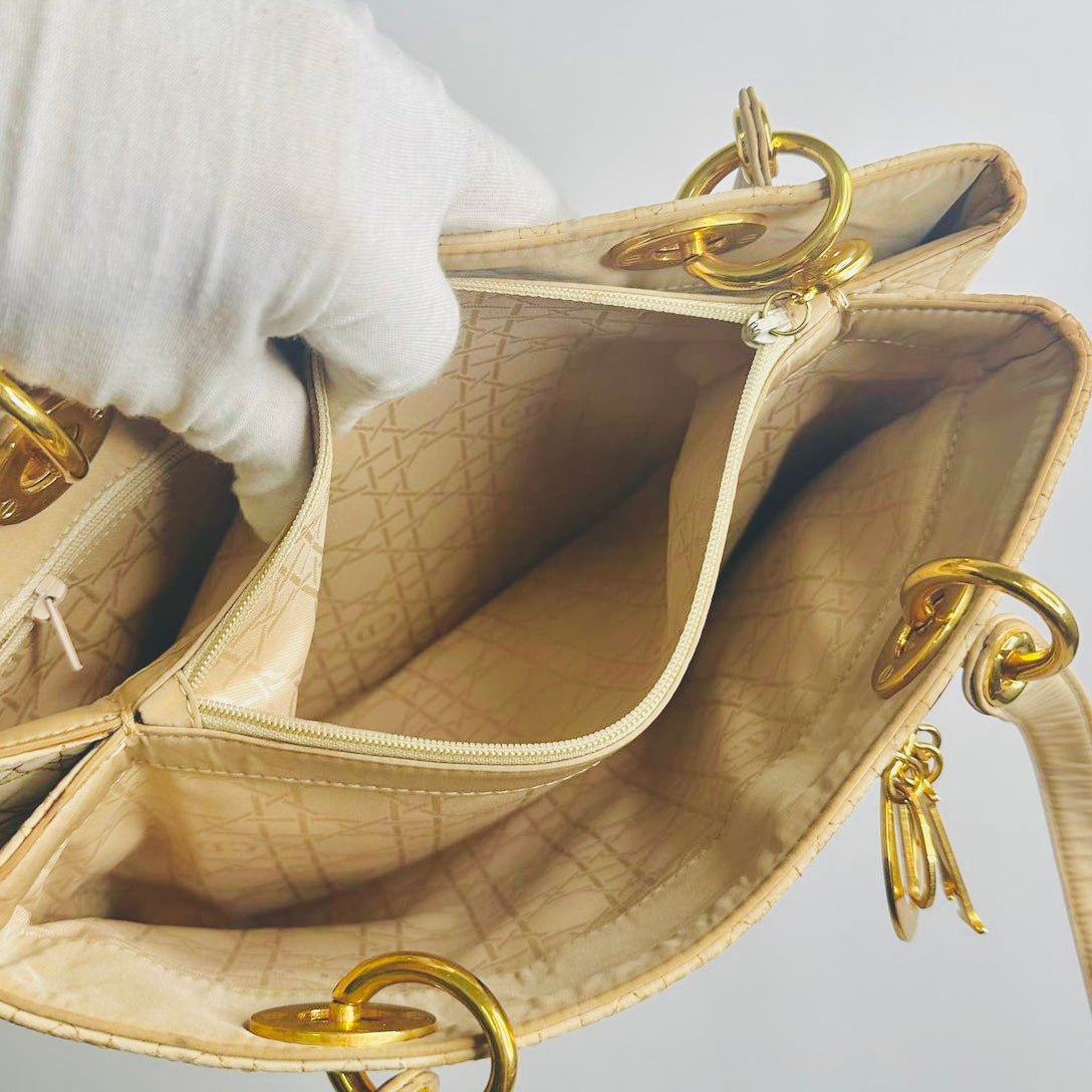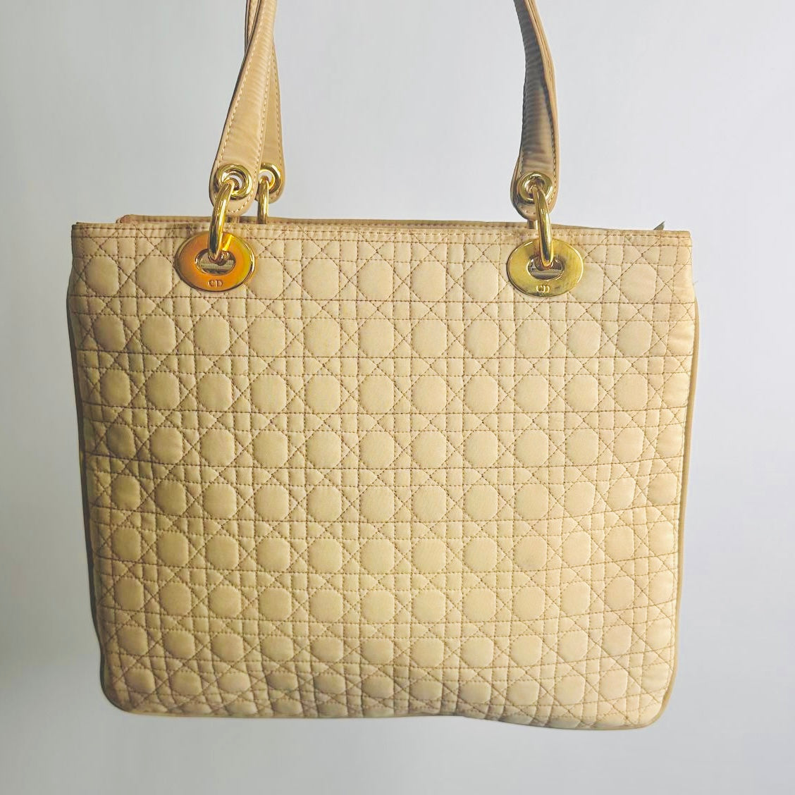 Christian Dior CD Warm Beige GHW Lady Dior Cannage Quilted Fabric Monogram Logo Shoulder Shopper Tote Bag