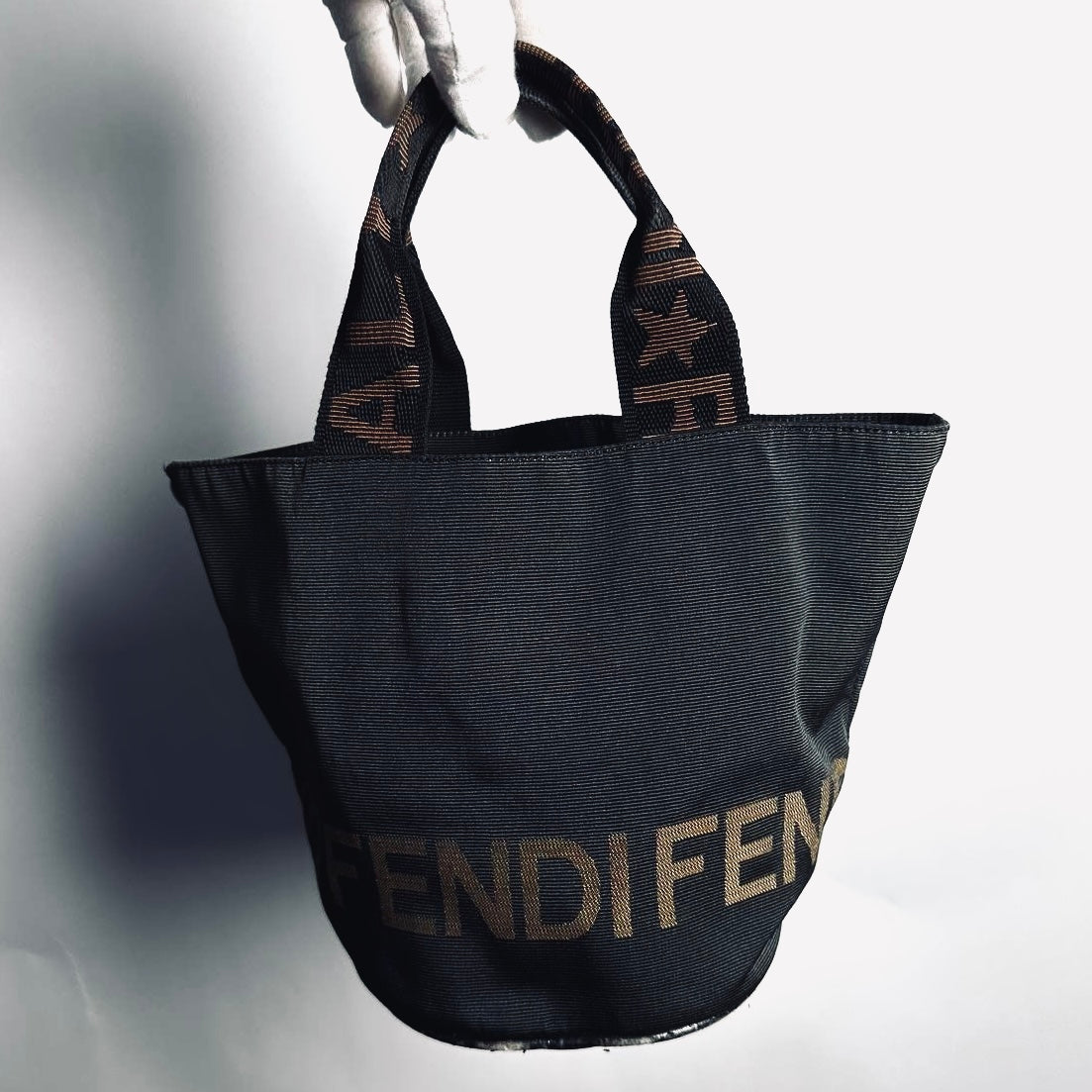 Fendi Black Zucca FF Roma Monogram Logo Bucket Small Shopper Vertical Tall Tote Bag