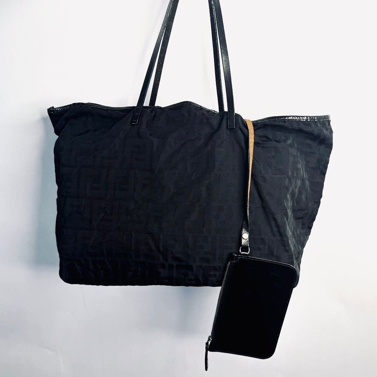Fendi Black Zucca Zucchino FF Monogram Logo Shoulder Shopper Tote Bag With Pouch
