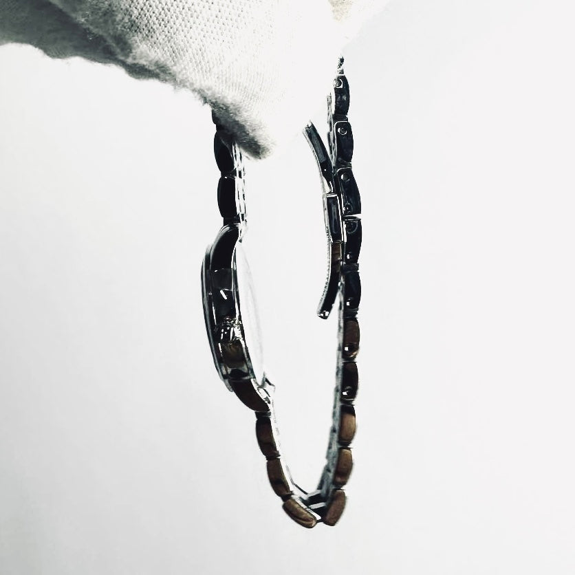 16.5cm wrist size, can be resized. This comes with holder, box, extra links, number and clear hardware engravings.