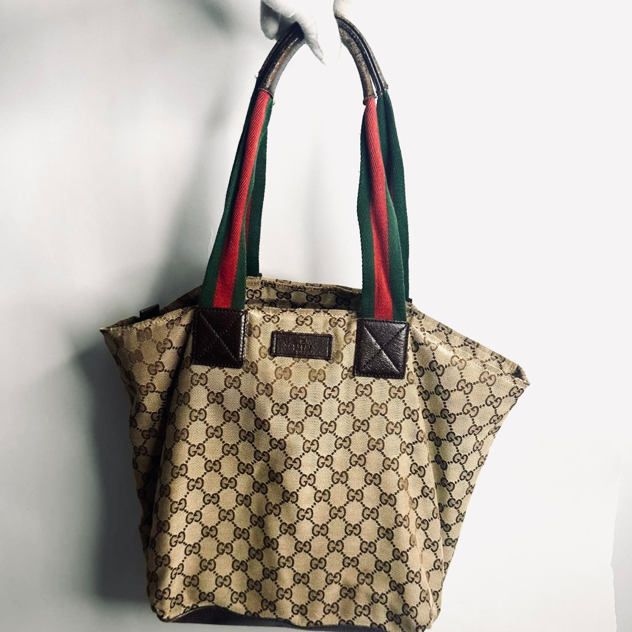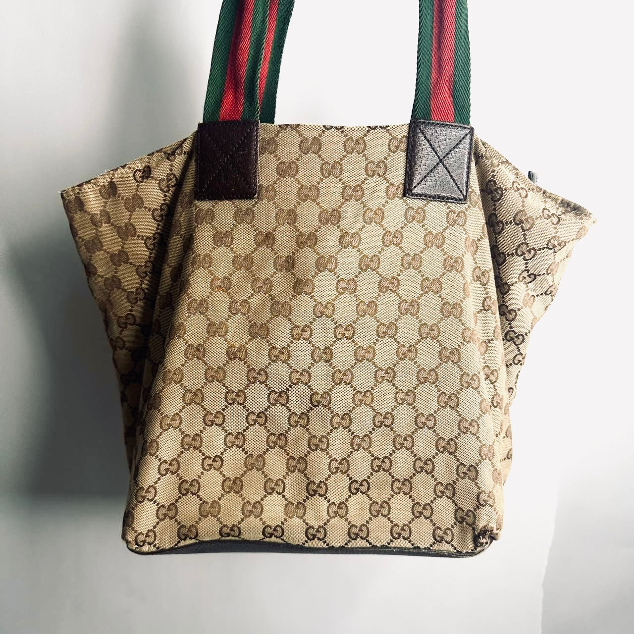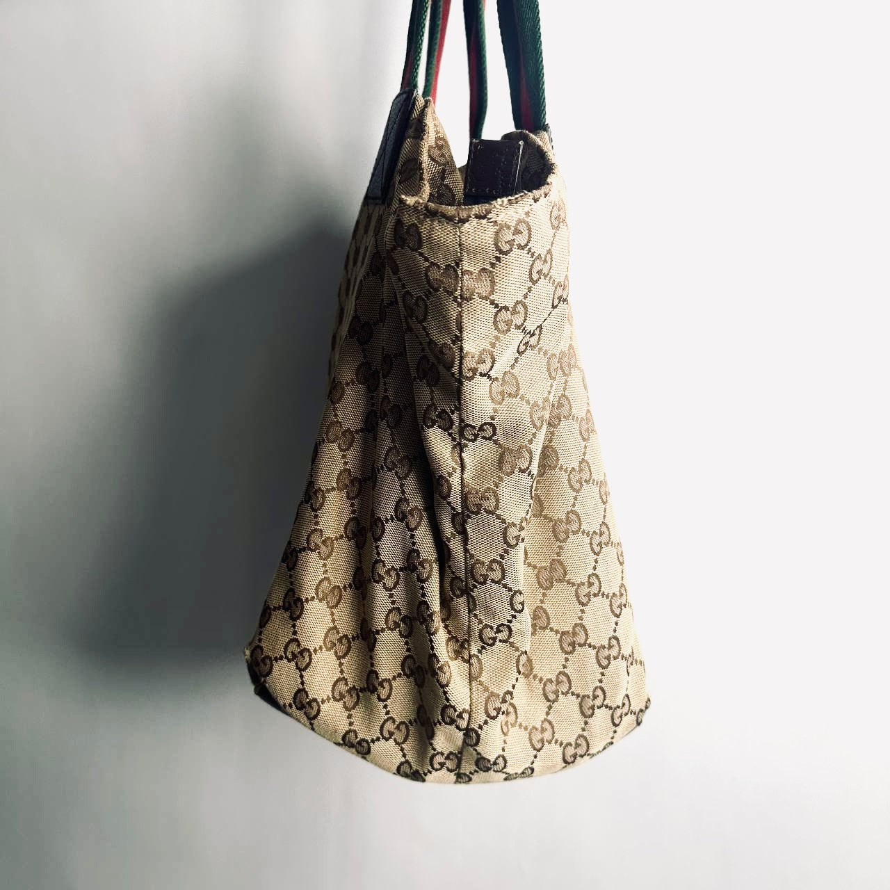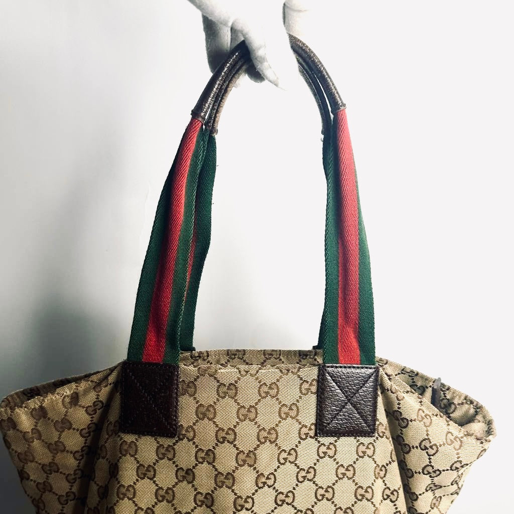 Gucci Beige GHW GG Monogram Logo Sherry Web Striped Shopper Shoulder Bucket Tote Bag