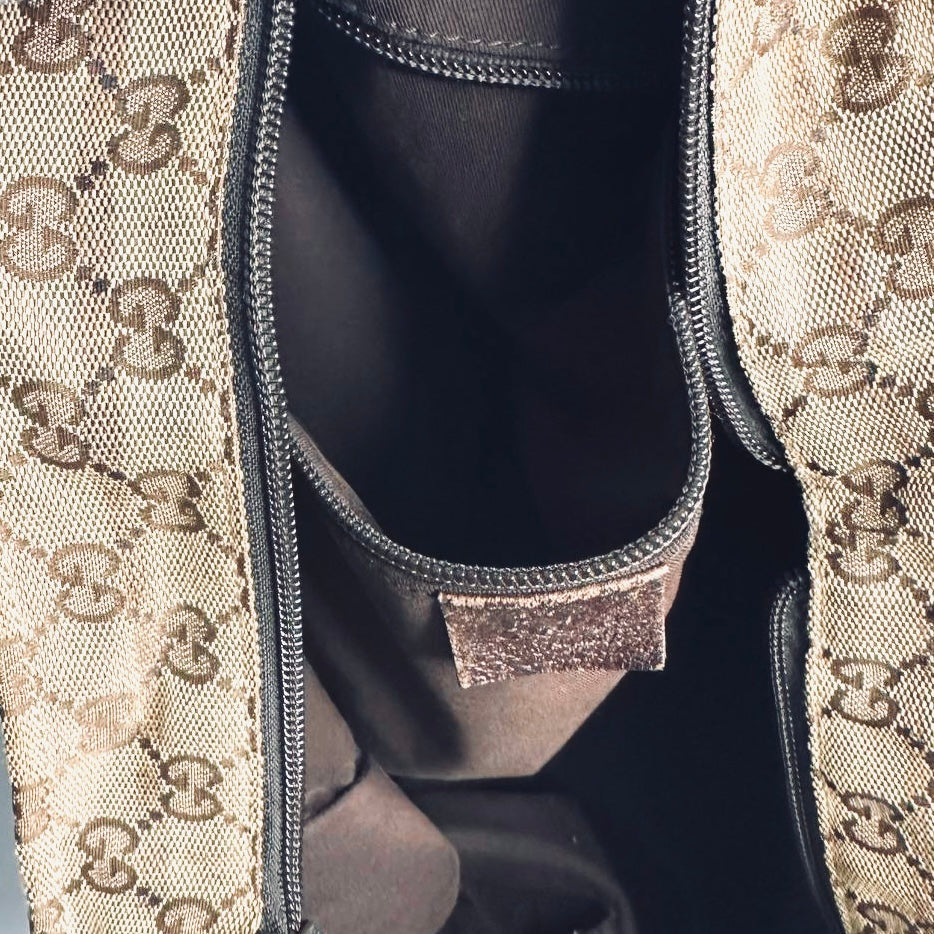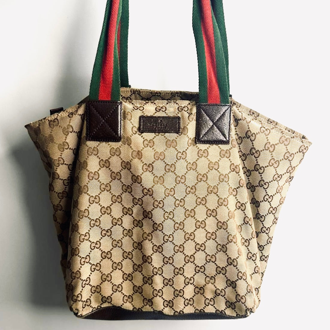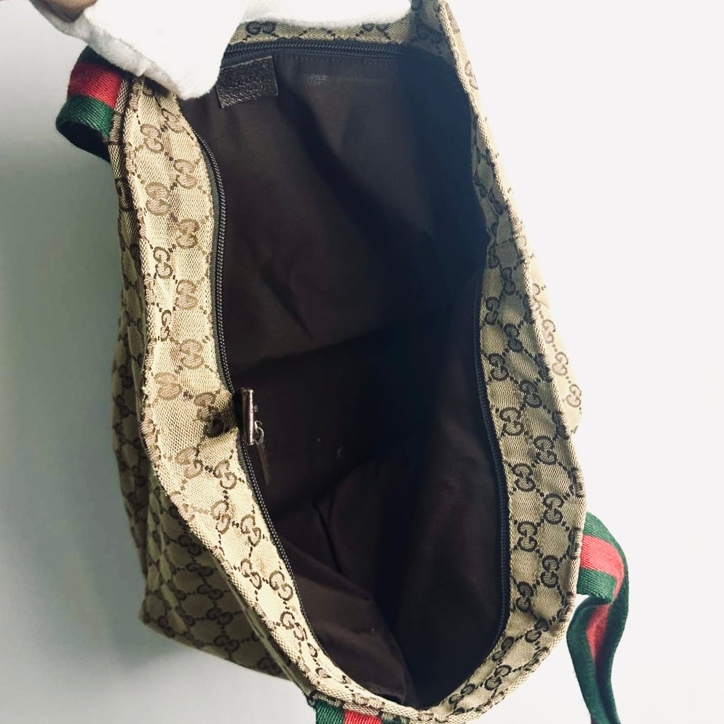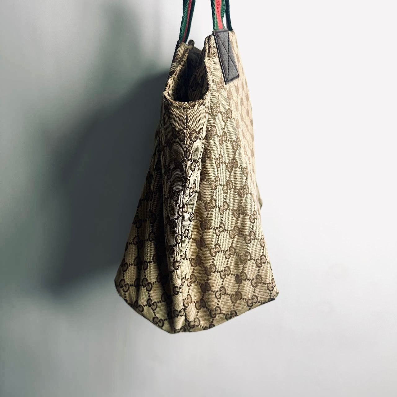 Gucci Beige GHW GG Monogram Logo Sherry Web Striped Shopper Shoulder Bucket Tote Bag