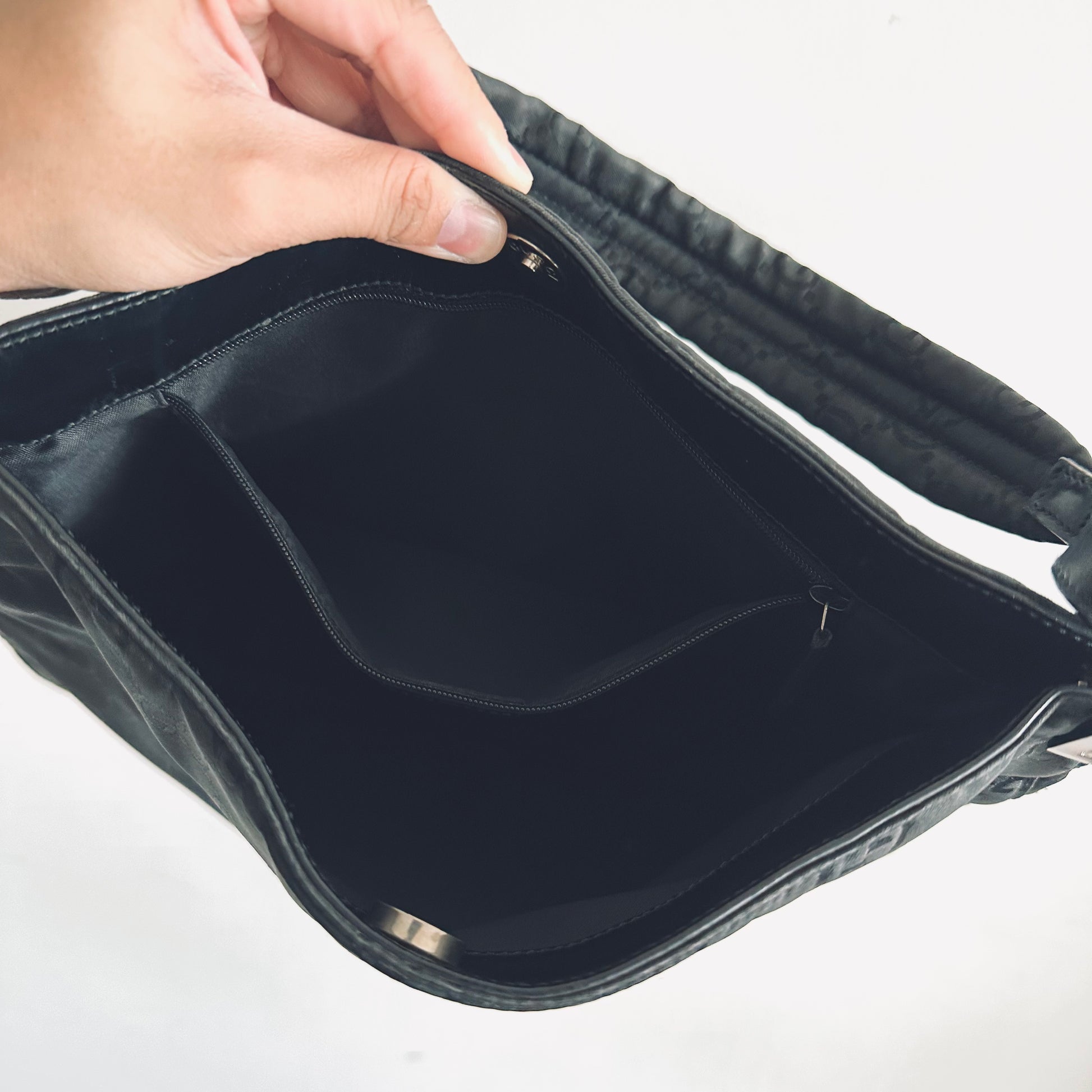 Preloved 9.6/10. This has a magnetic button closure, central compartment and zip pocket. This measures 33x30x6cm.