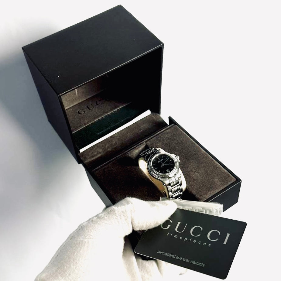 Gucci Black Round Dial Monogram Logo Stainless Steel 26MM 9040L Watch