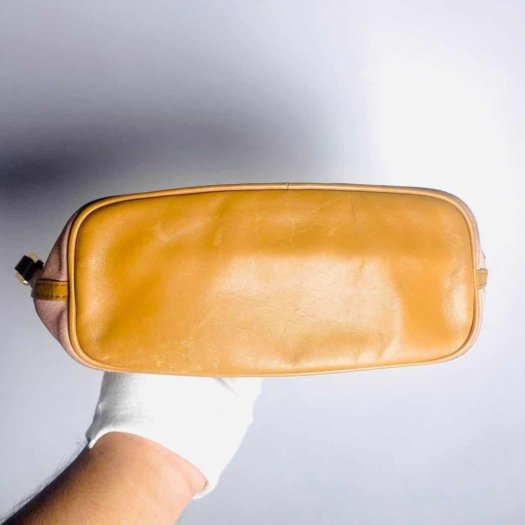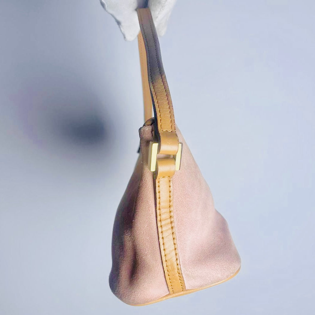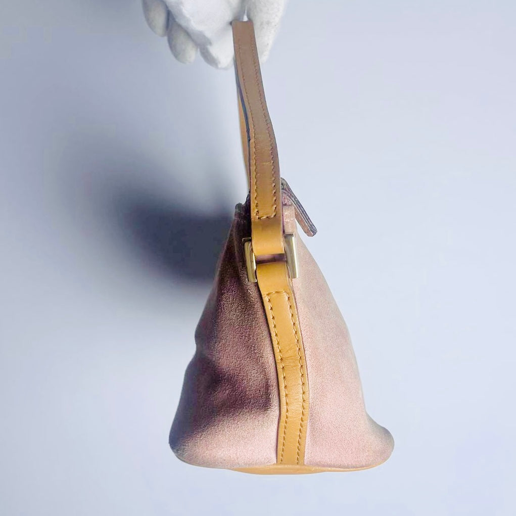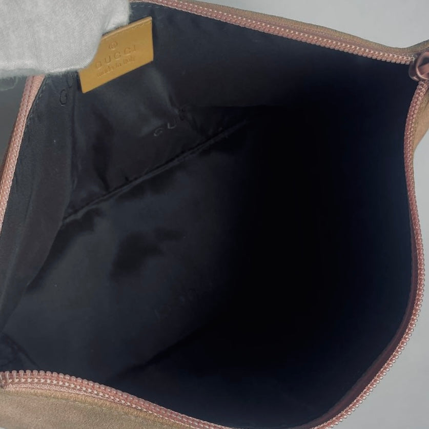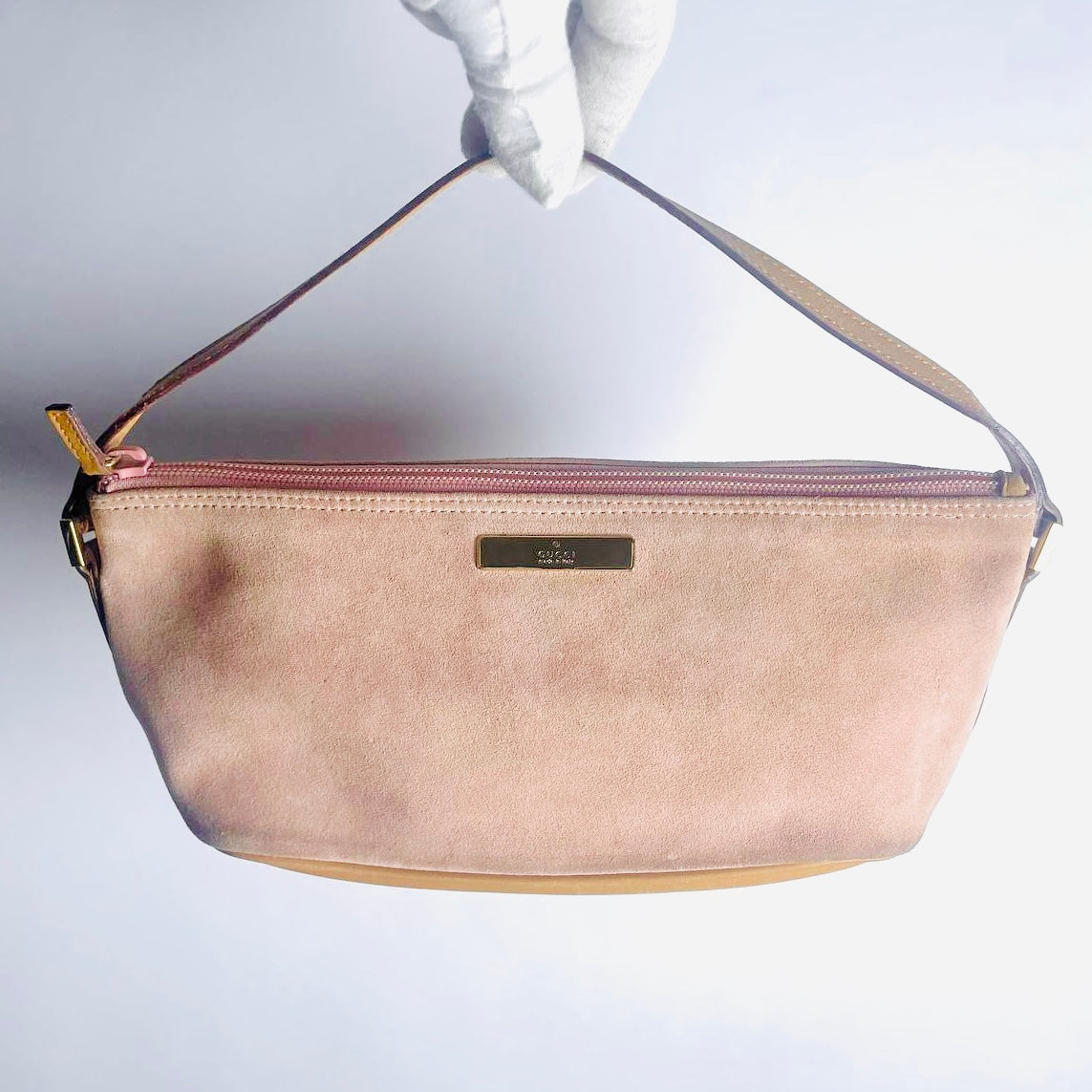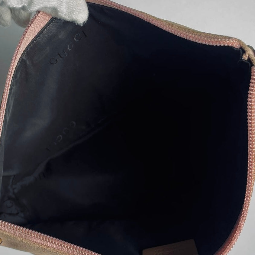 Gucci Blush Pink / Tan Suede Monogram Logo GHW Mini Pochette Accessories Hobo Shoulder Bag