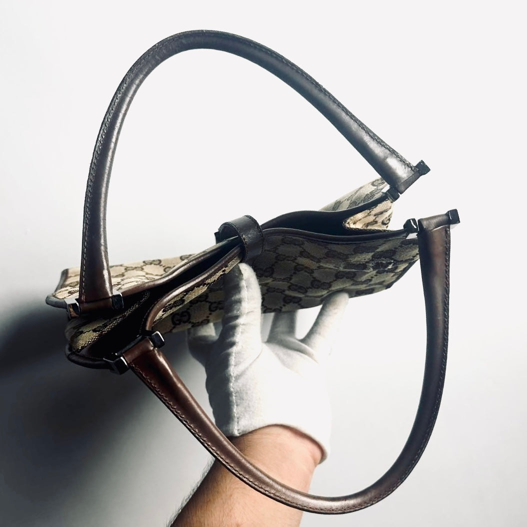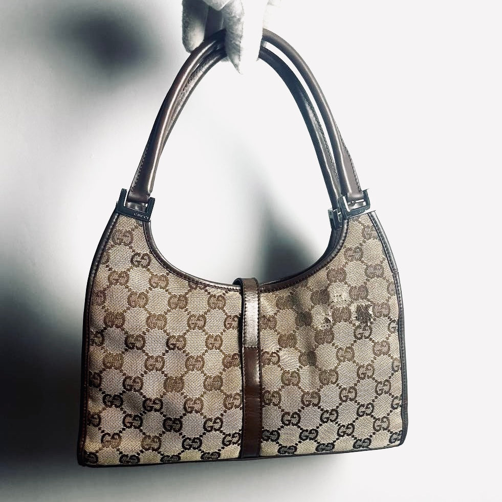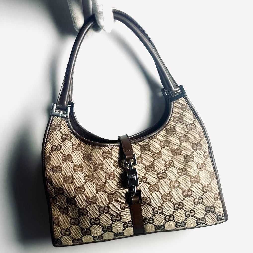 Gucci Brown / Beige Jackie GG Monogram Logo Vintage Baguette Hobo Shoulder Bag