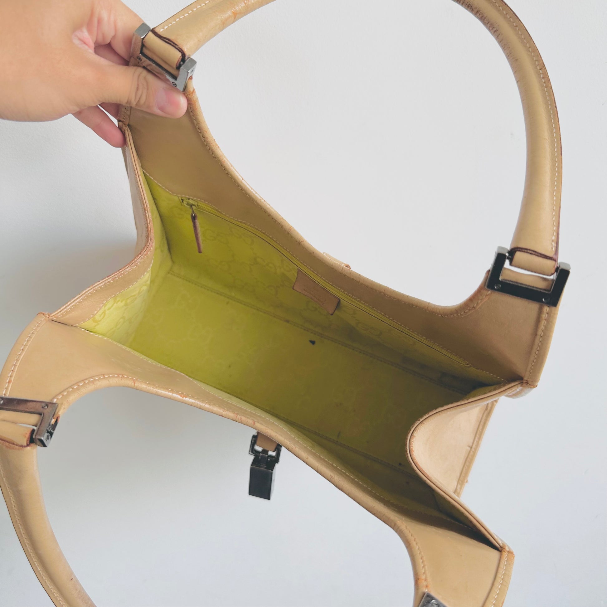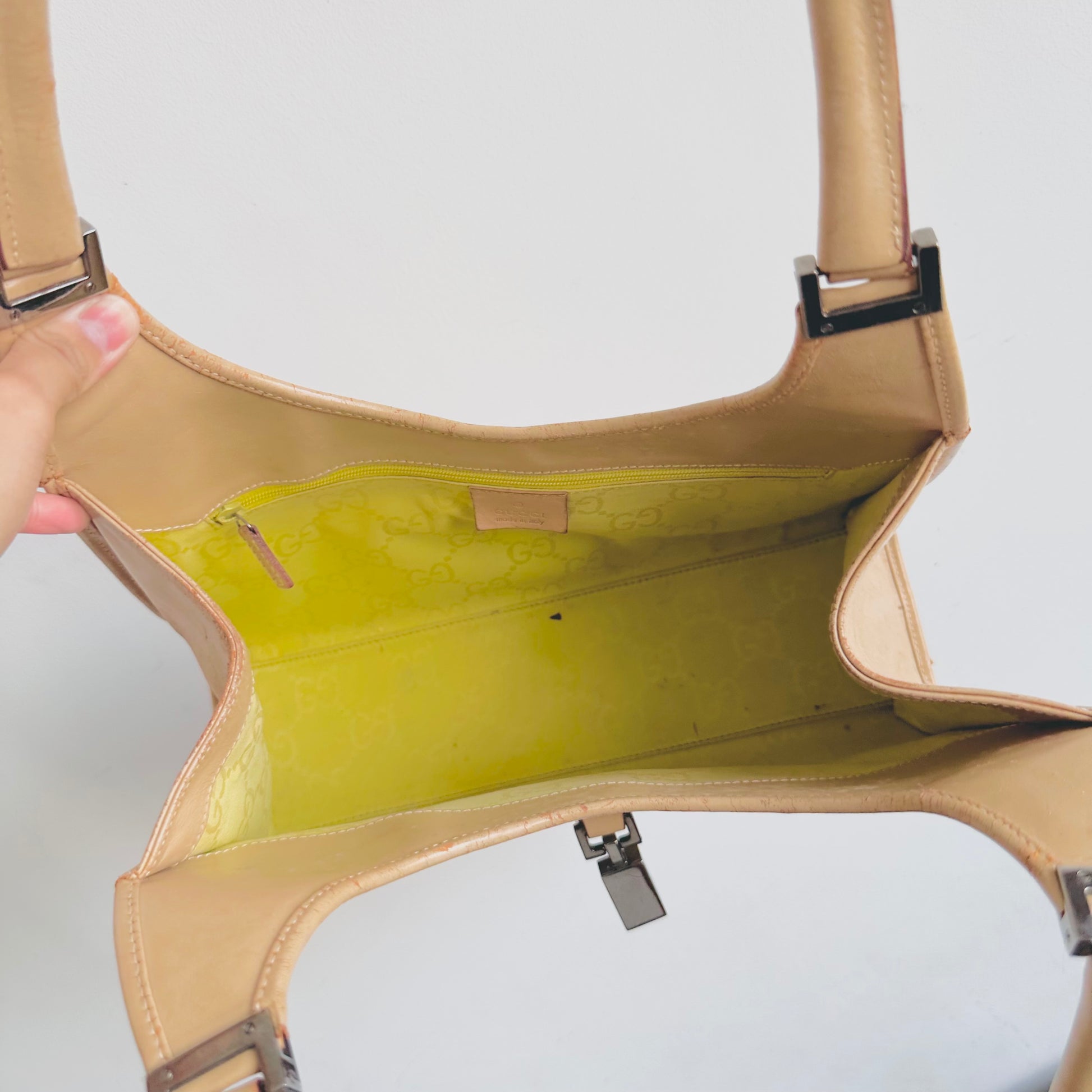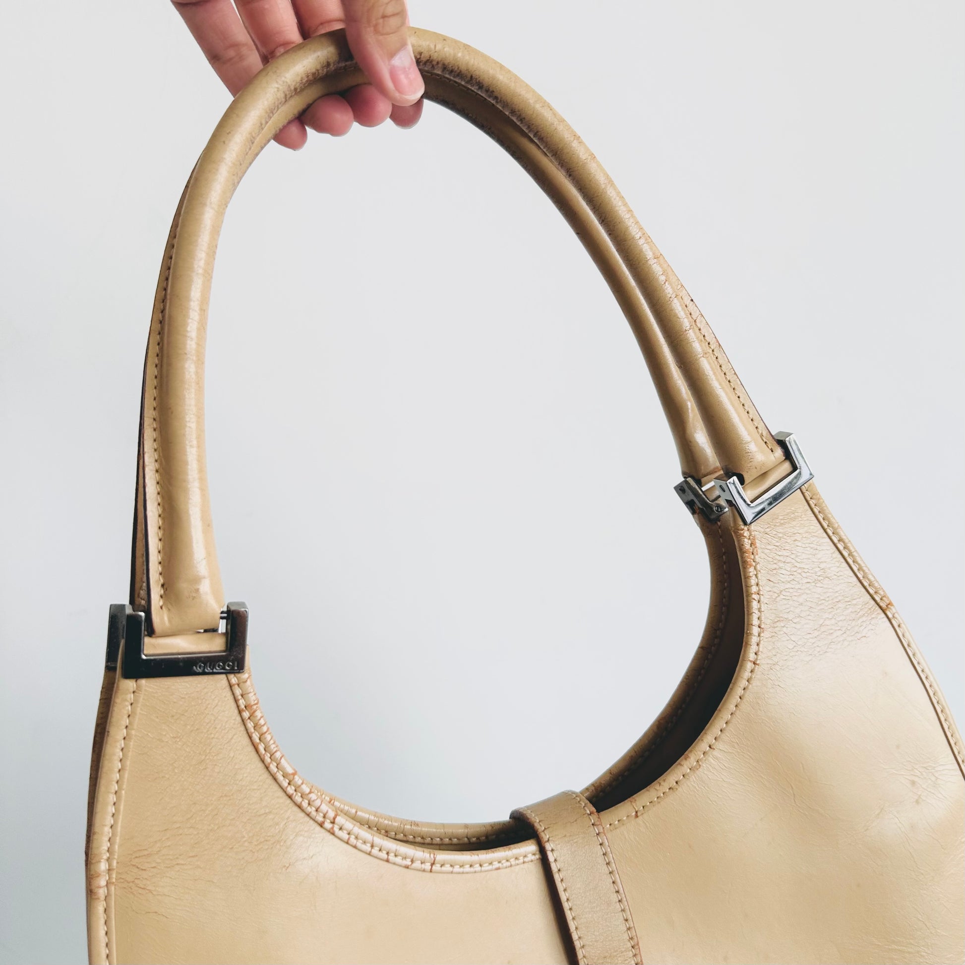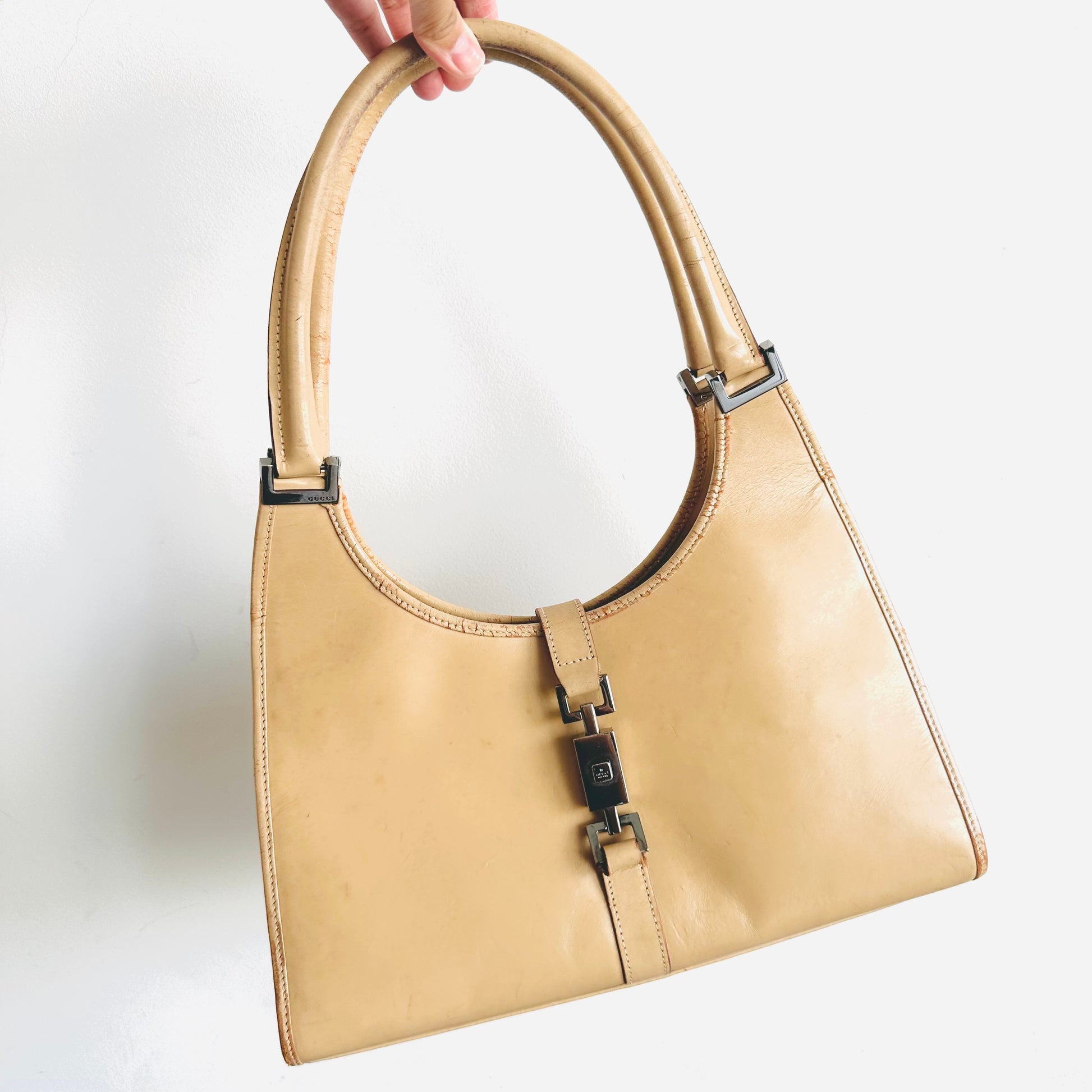 Gucci Jackie Beige Leather Monogram Logo Flap Vintage Hobo Shoulder Bag