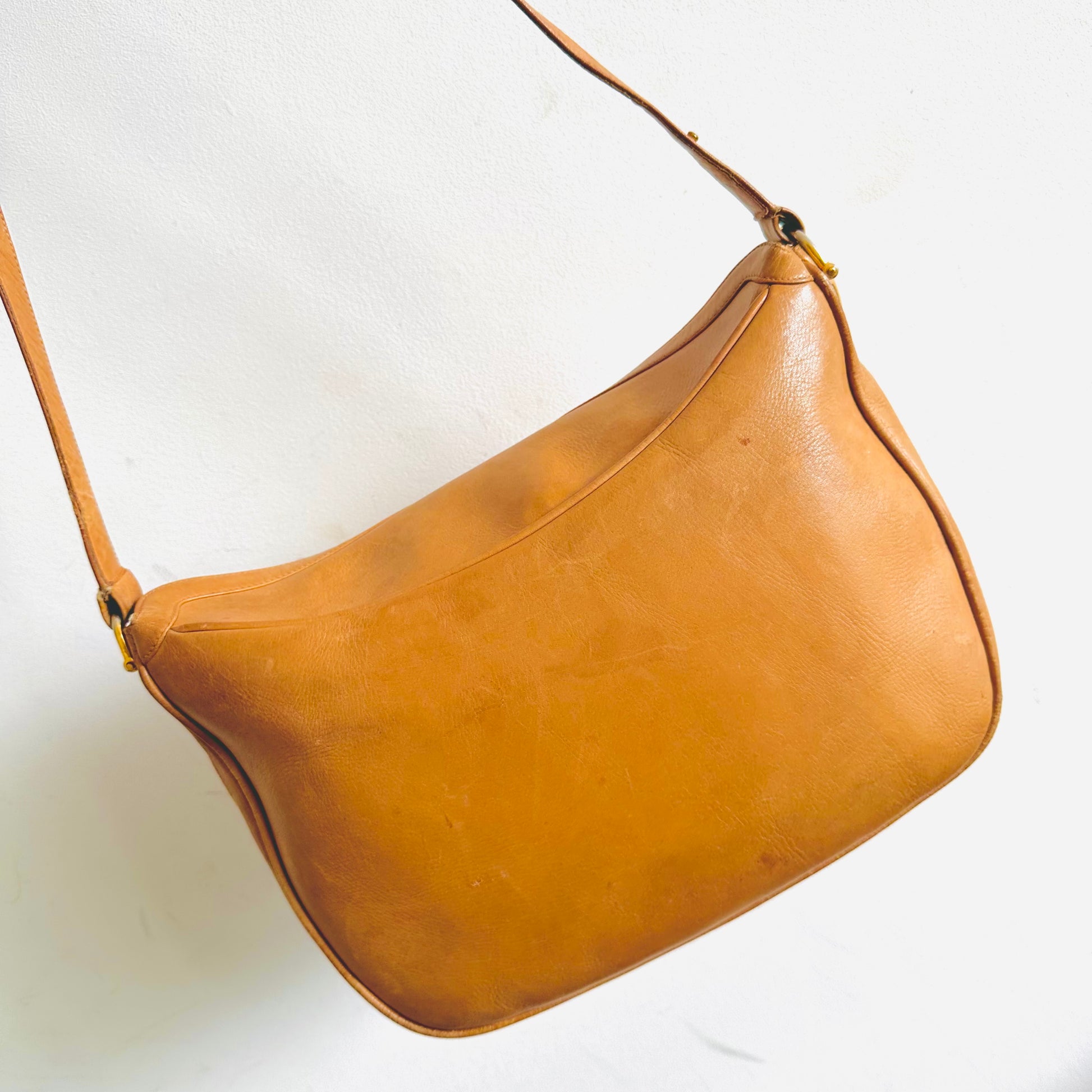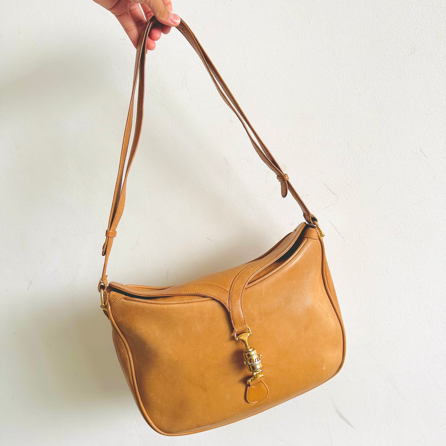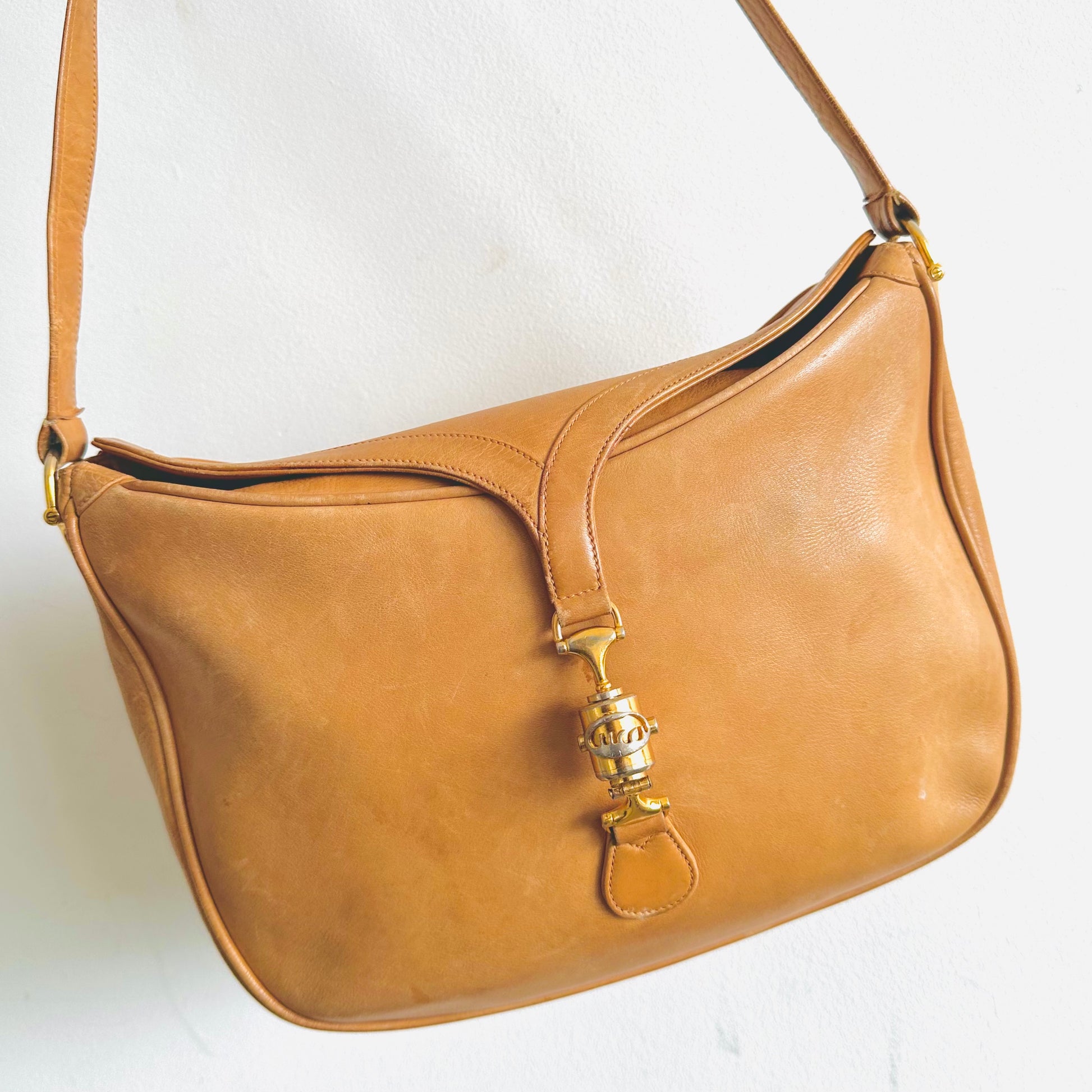 Gucci Jackie Caramel Tan Brown Leather GHW Monogram Logo Vintage 2-Way Flap Hobo Shoulder Sling Bag
