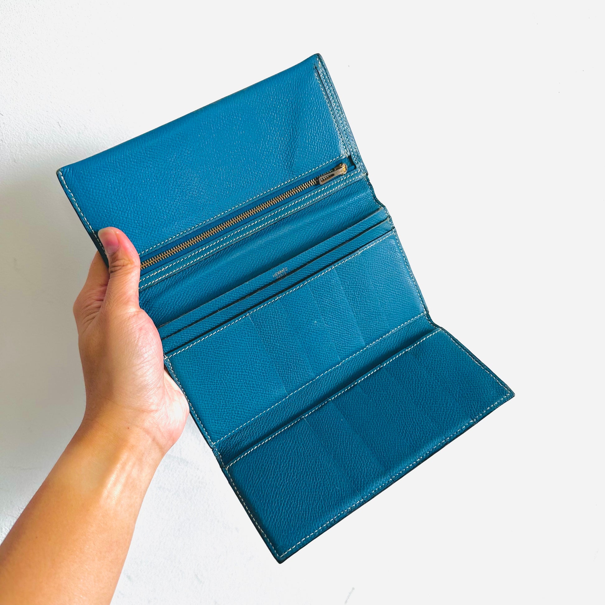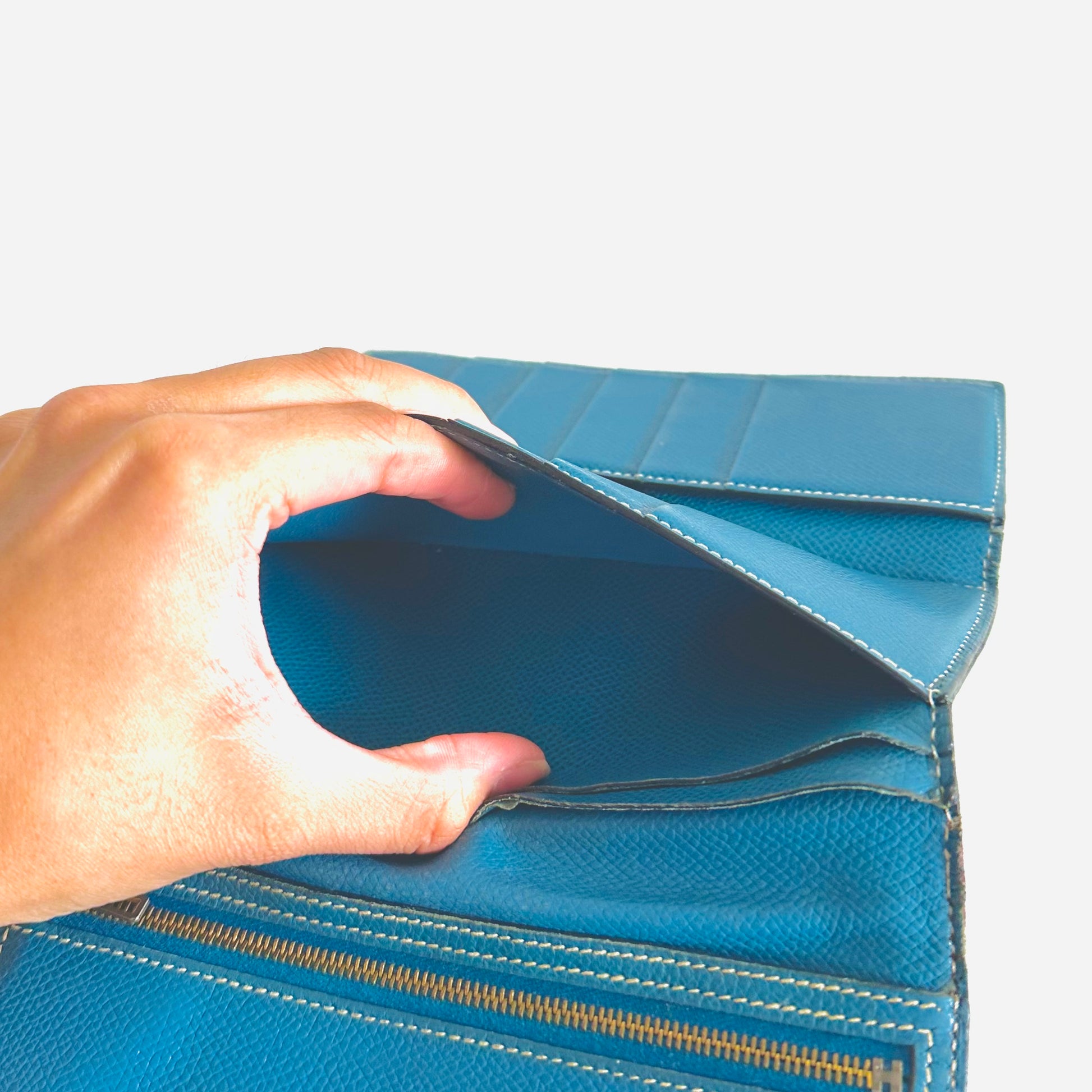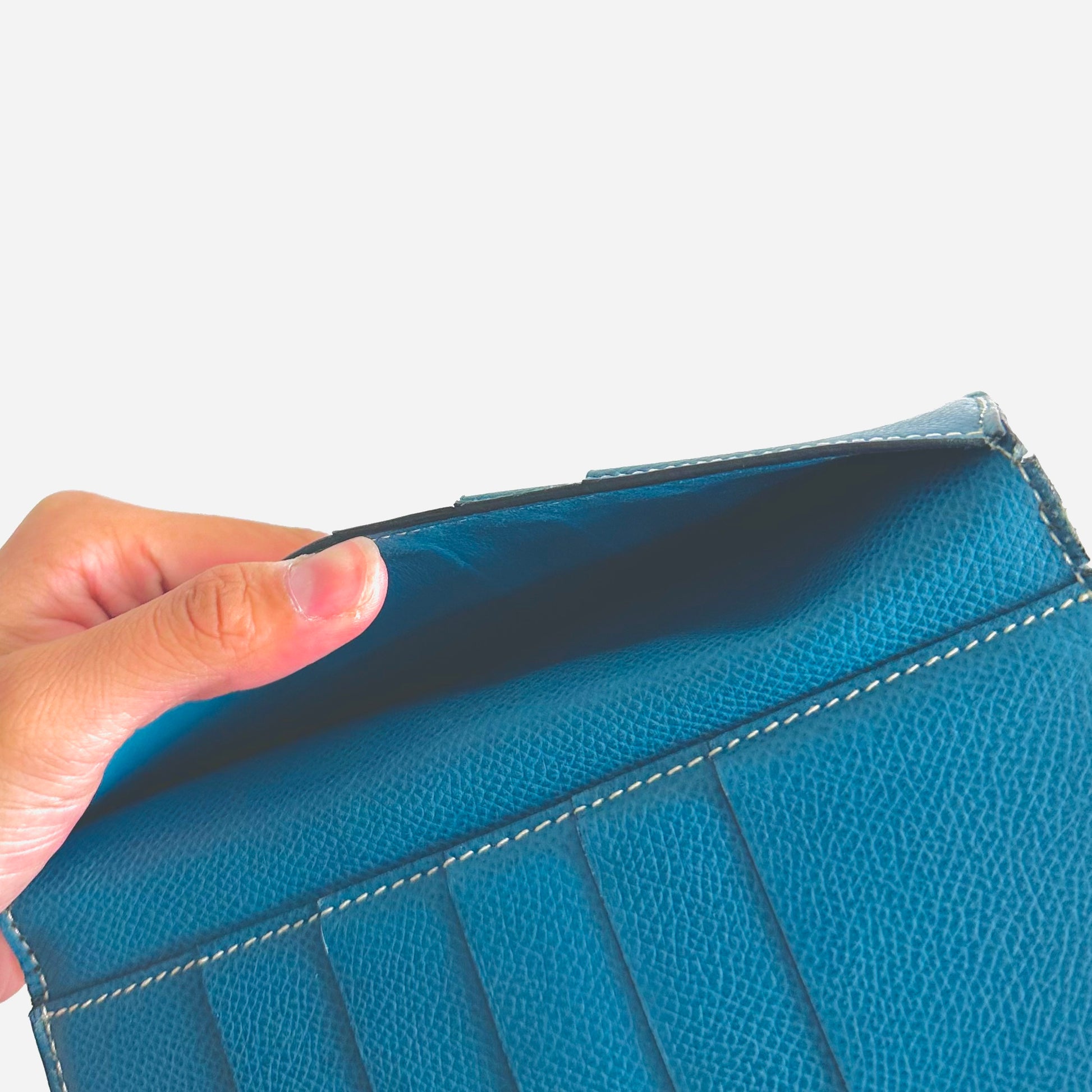 Hermes Bearn Blue Bleu Jean GHW H Logo Epsom Grained Leather Trifold Flap Long Wallet