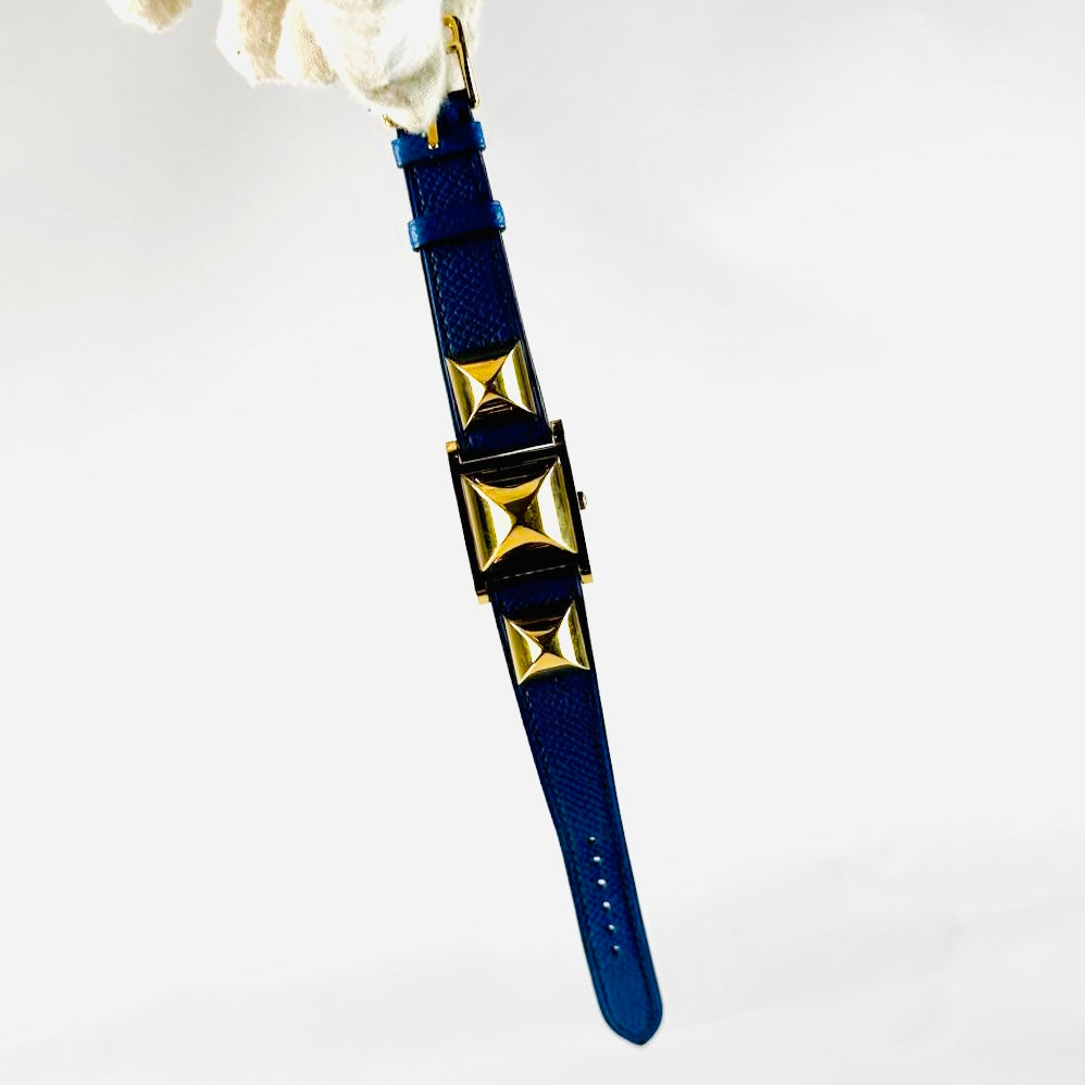 Hermes Medor Studded Blue & Gold GHW Stainless Steel Leather Strap 24MM Quartz Watch