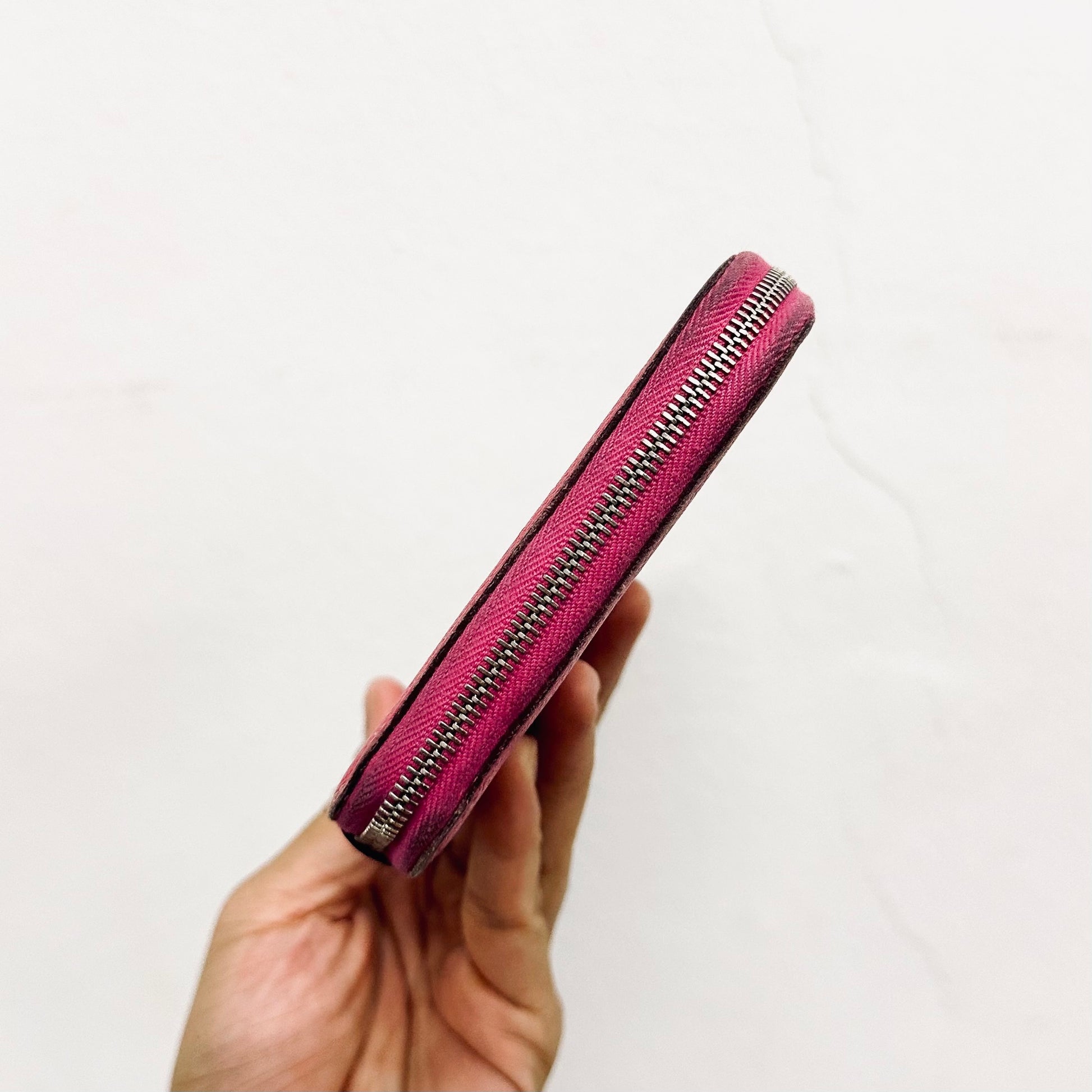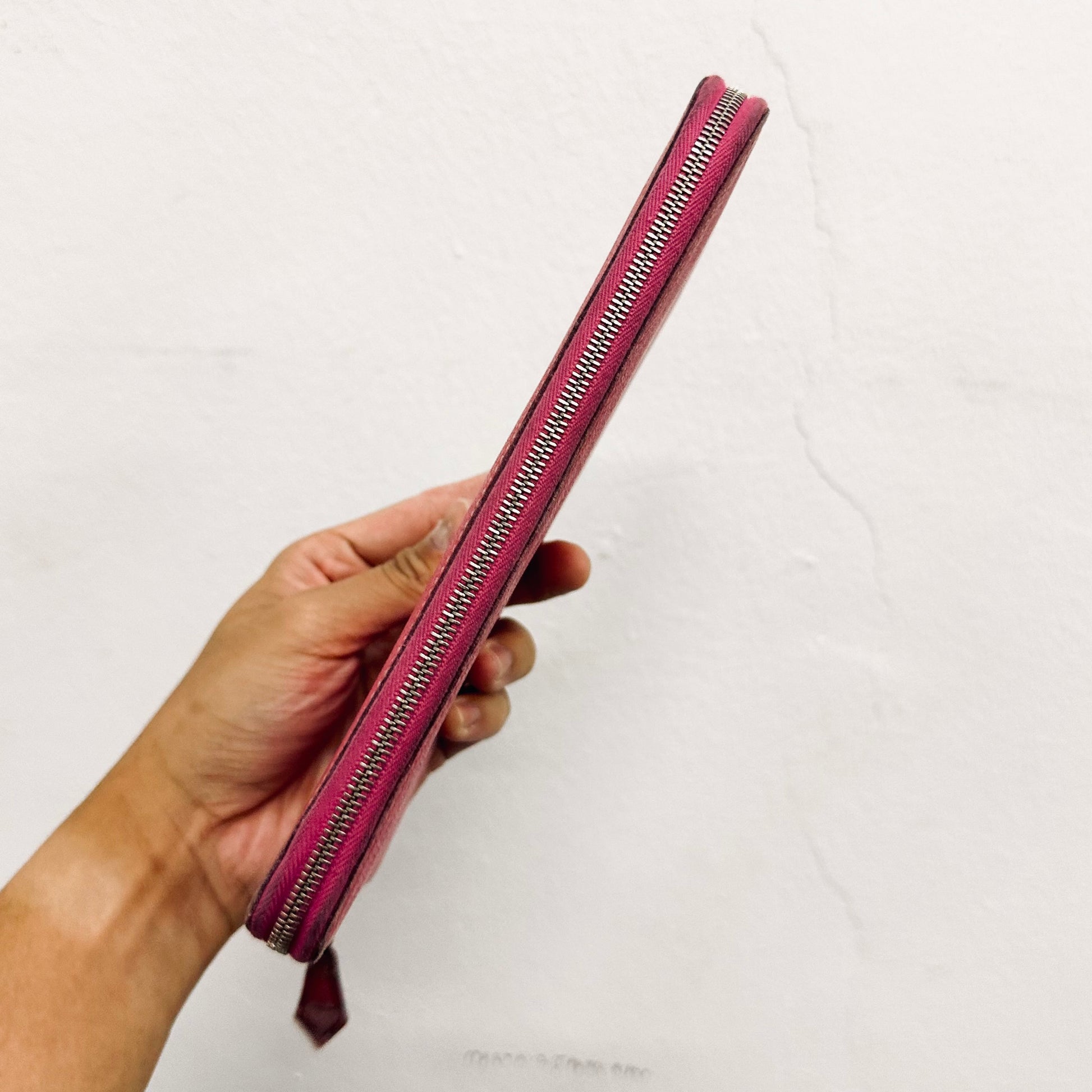 Preloved 9.3/10. This has a zip around closure, card slots, slip pockets, two divided central compartments and zip pocket. This measures 20x11.5x1.5cm.