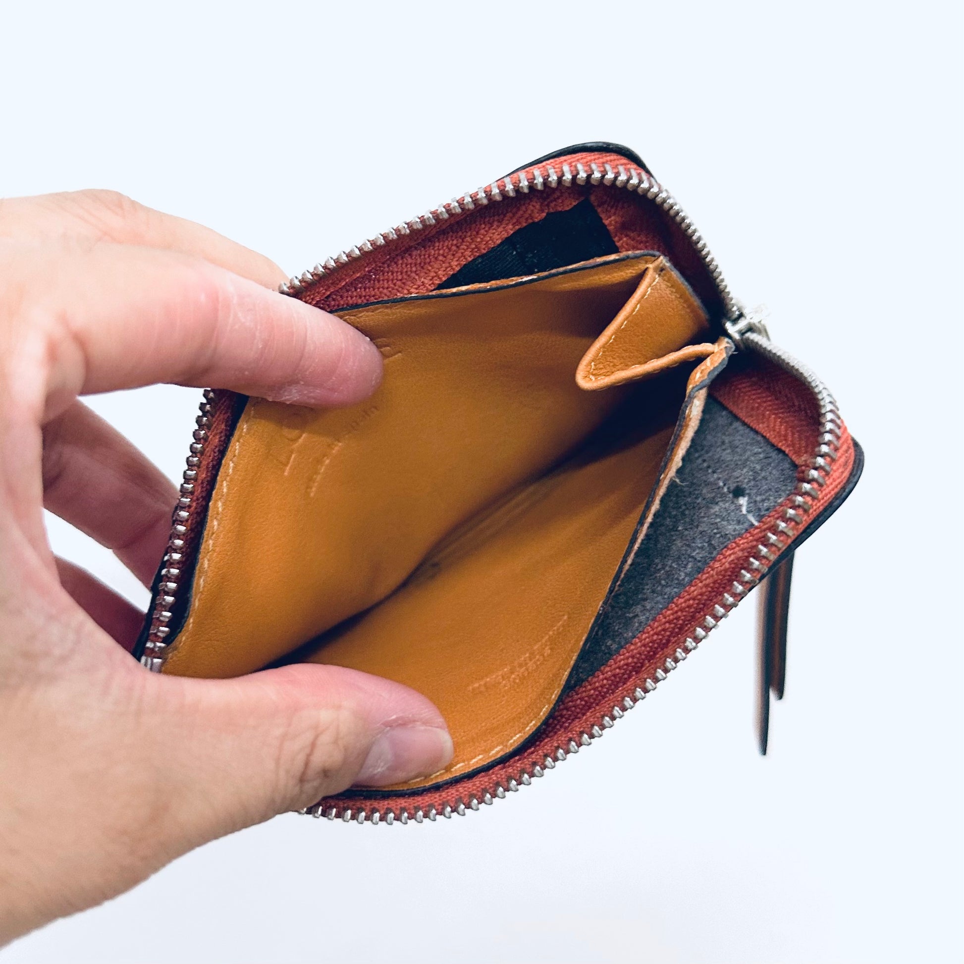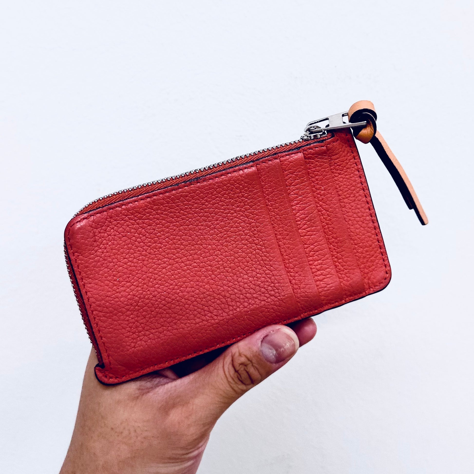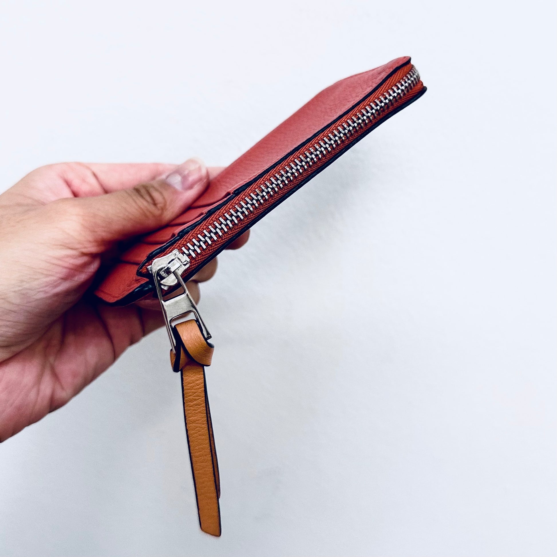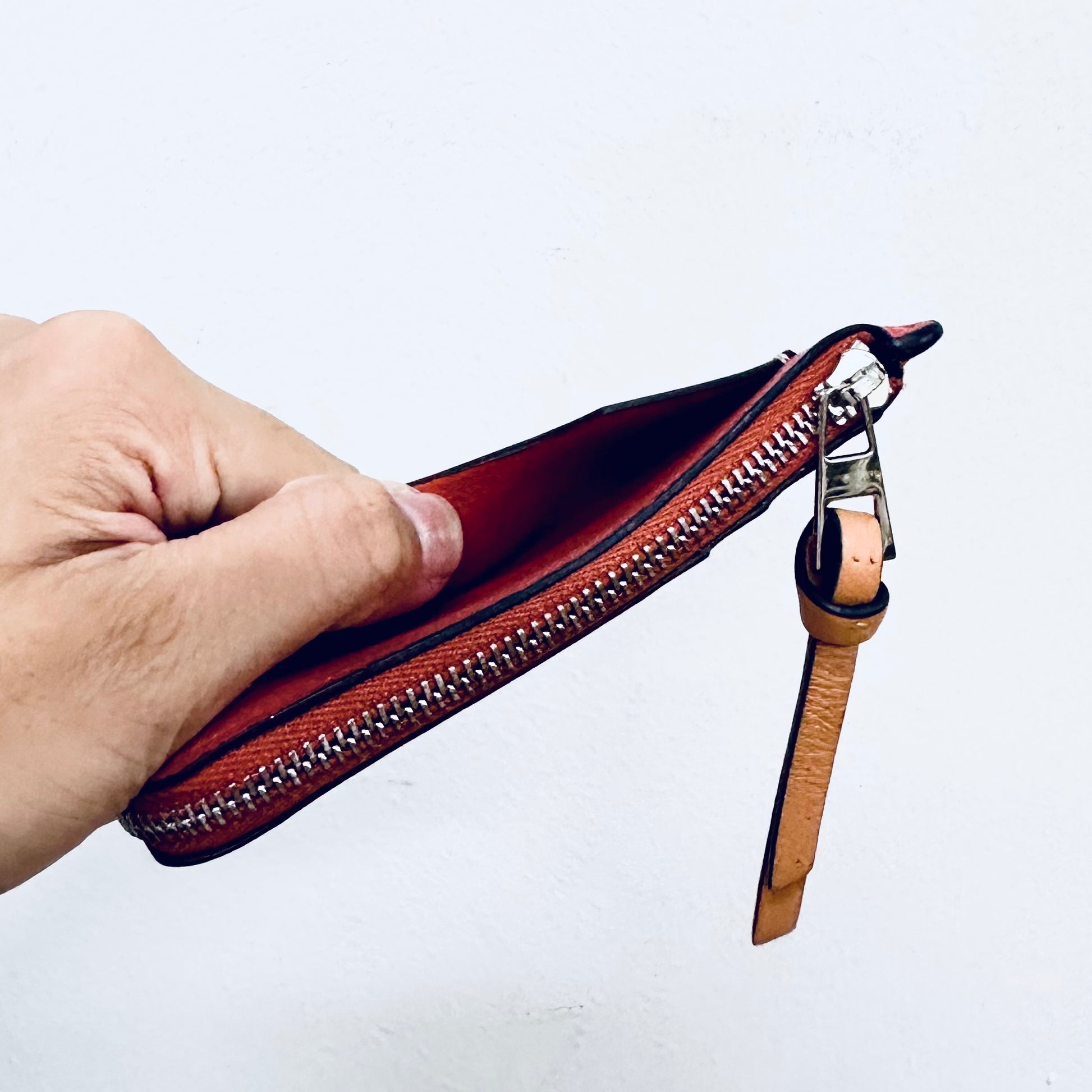 Preloved 9.4/10. This has a front pocket, card slots, zip closure and central compartment. This measures 13x7.5x1cm.