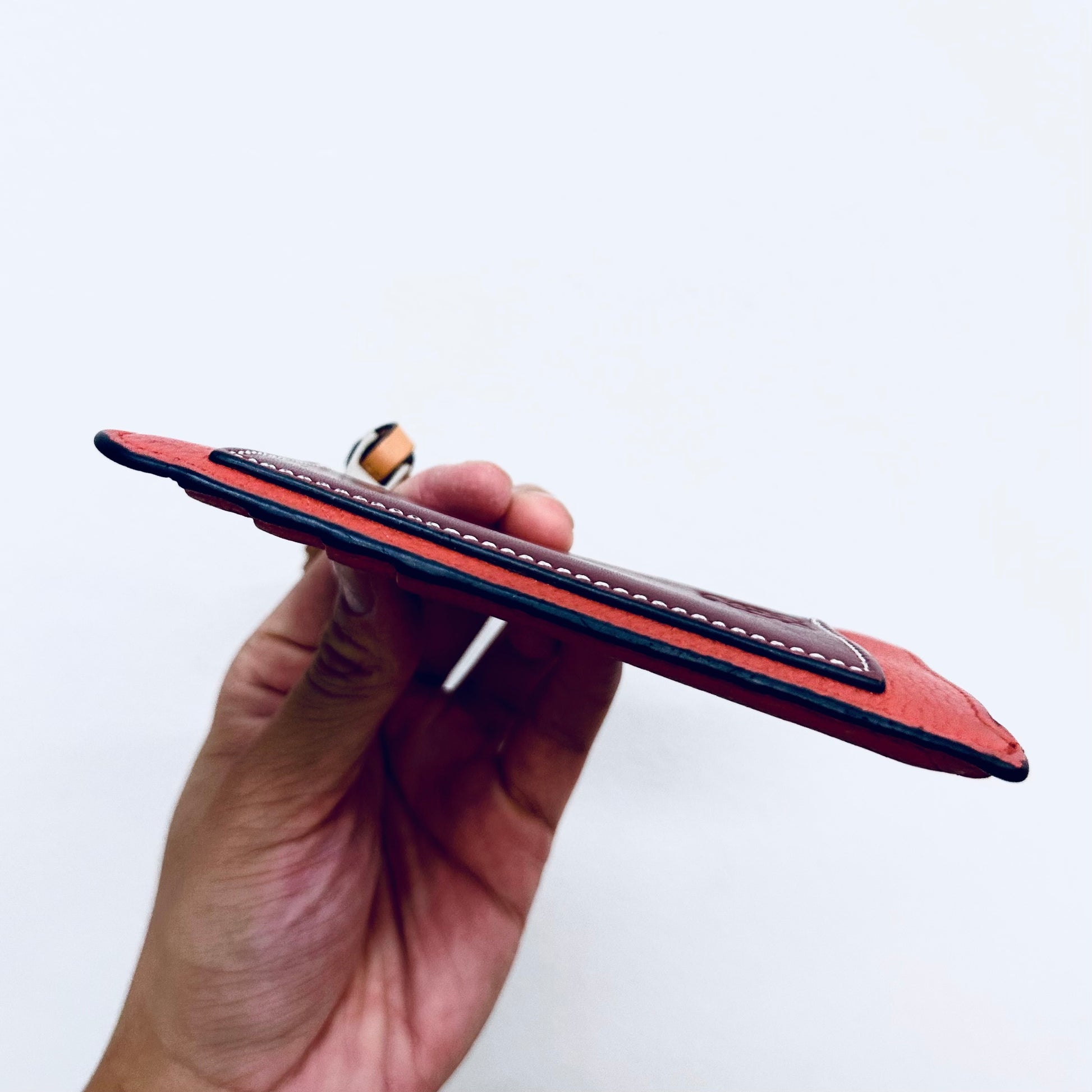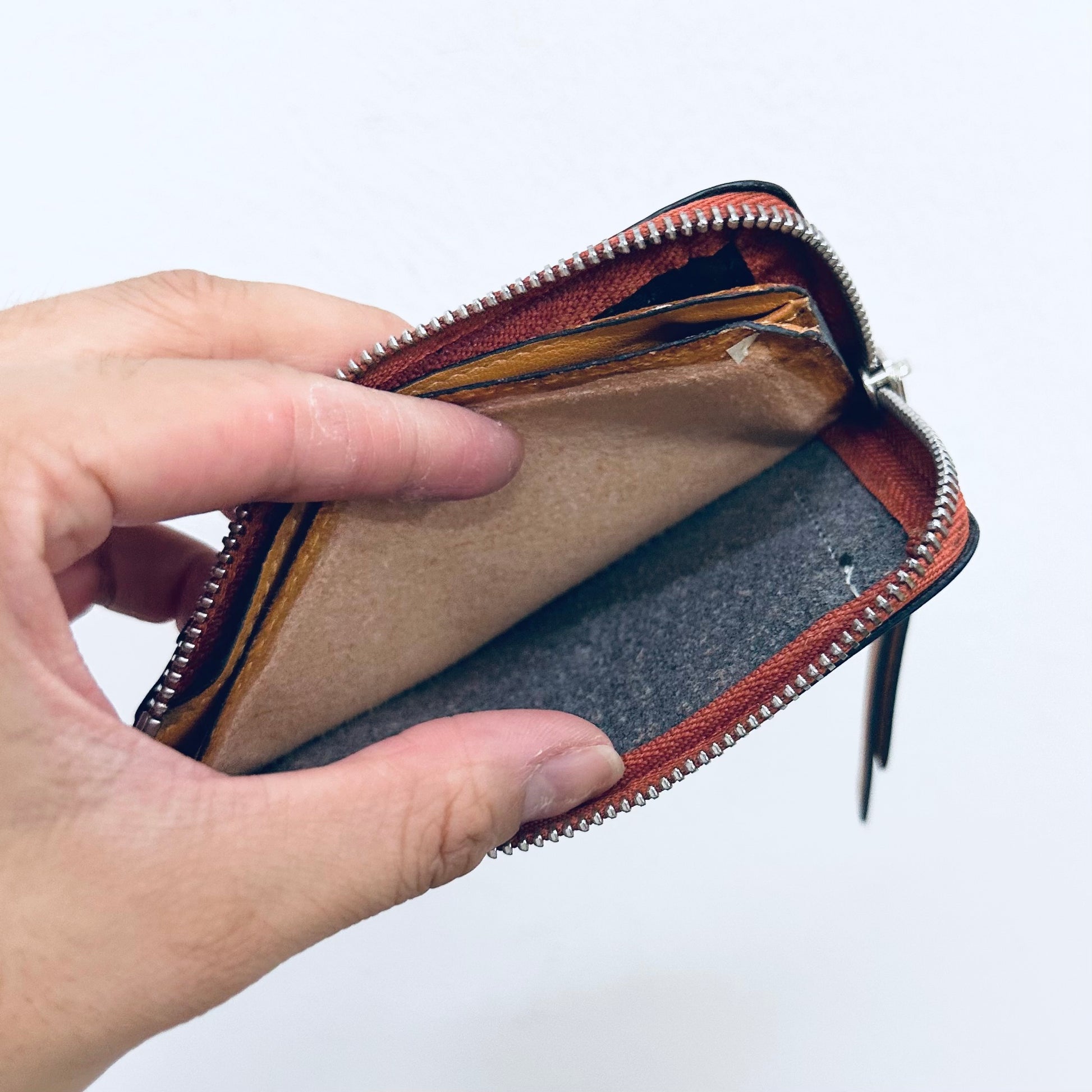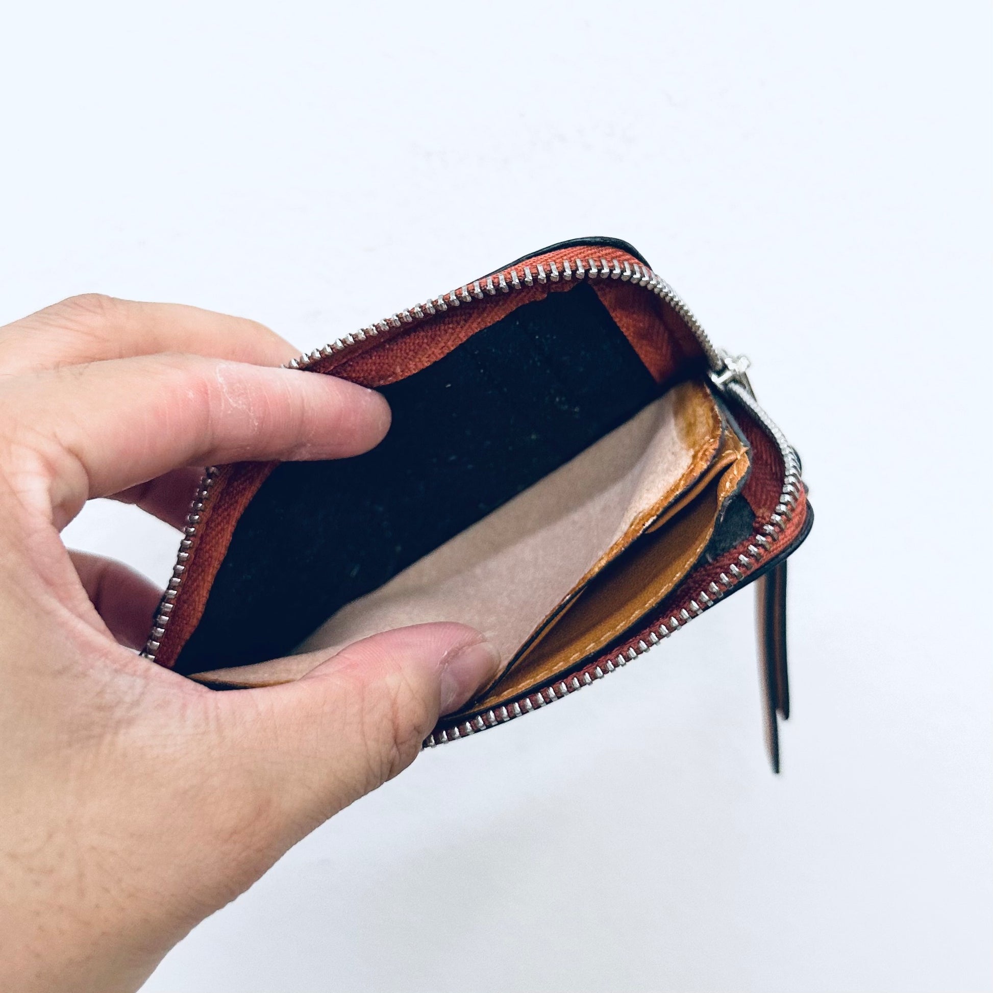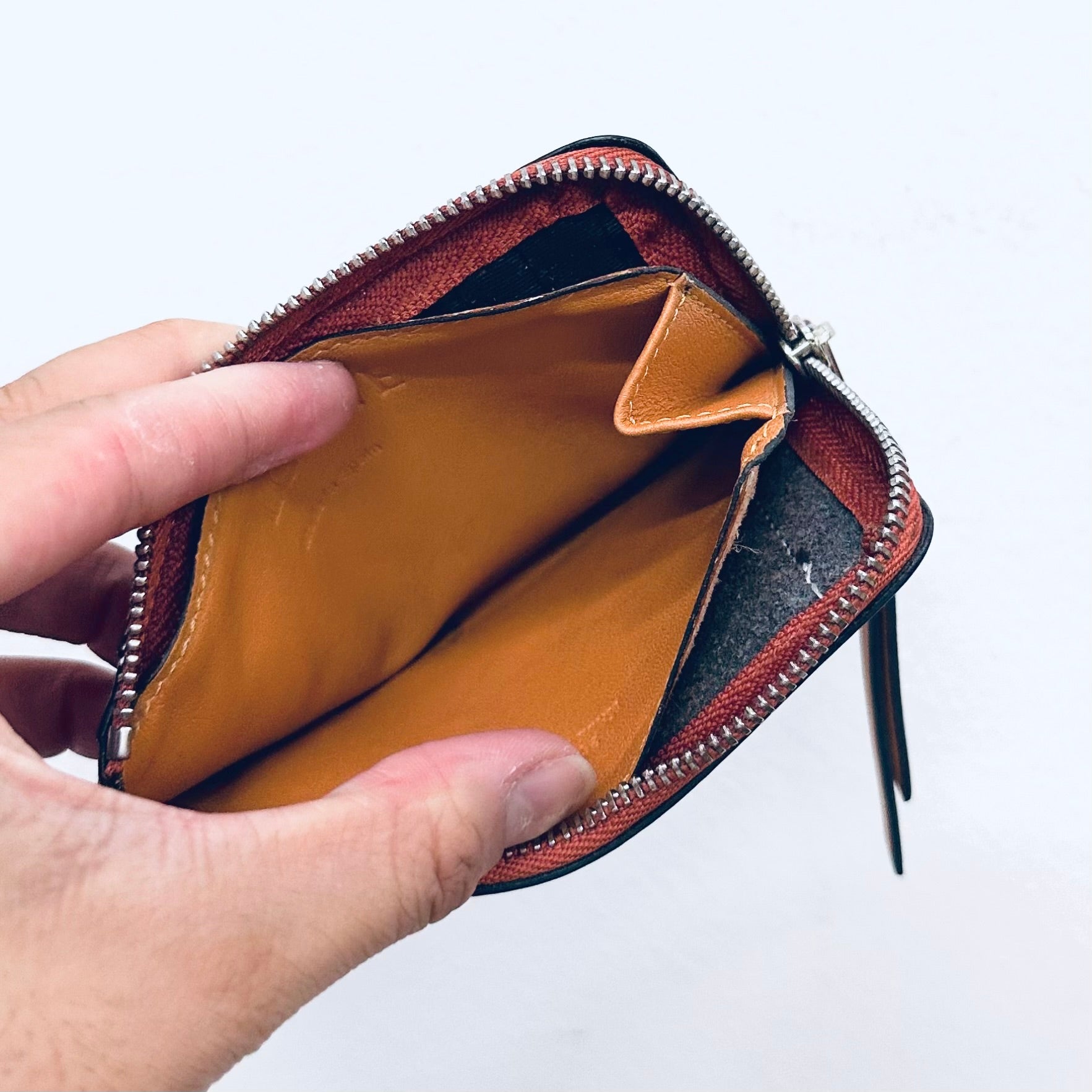 Preloved 9.4/10. This has a front pocket, card slots, zip closure and central compartment. This measures 13x7.5x1cm.