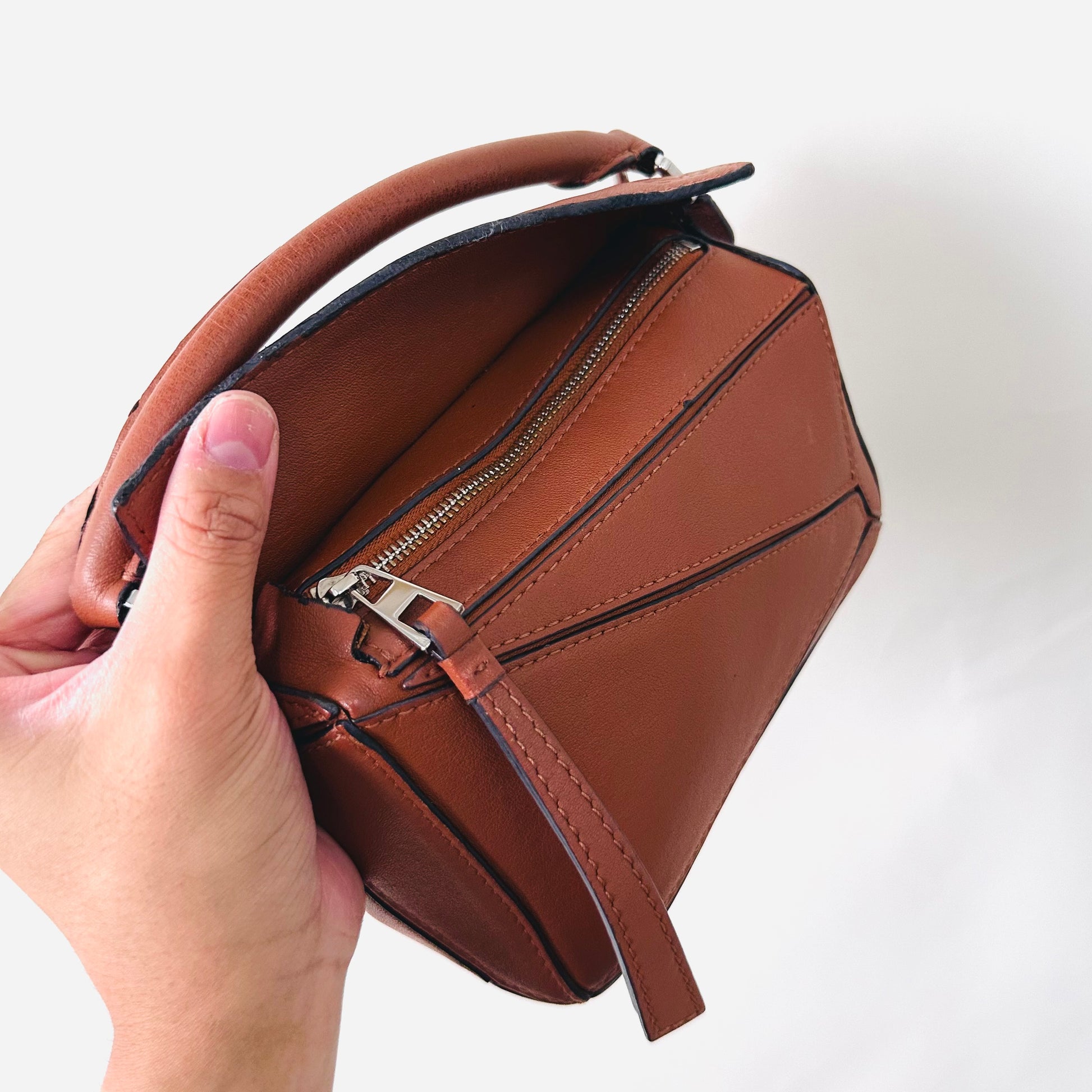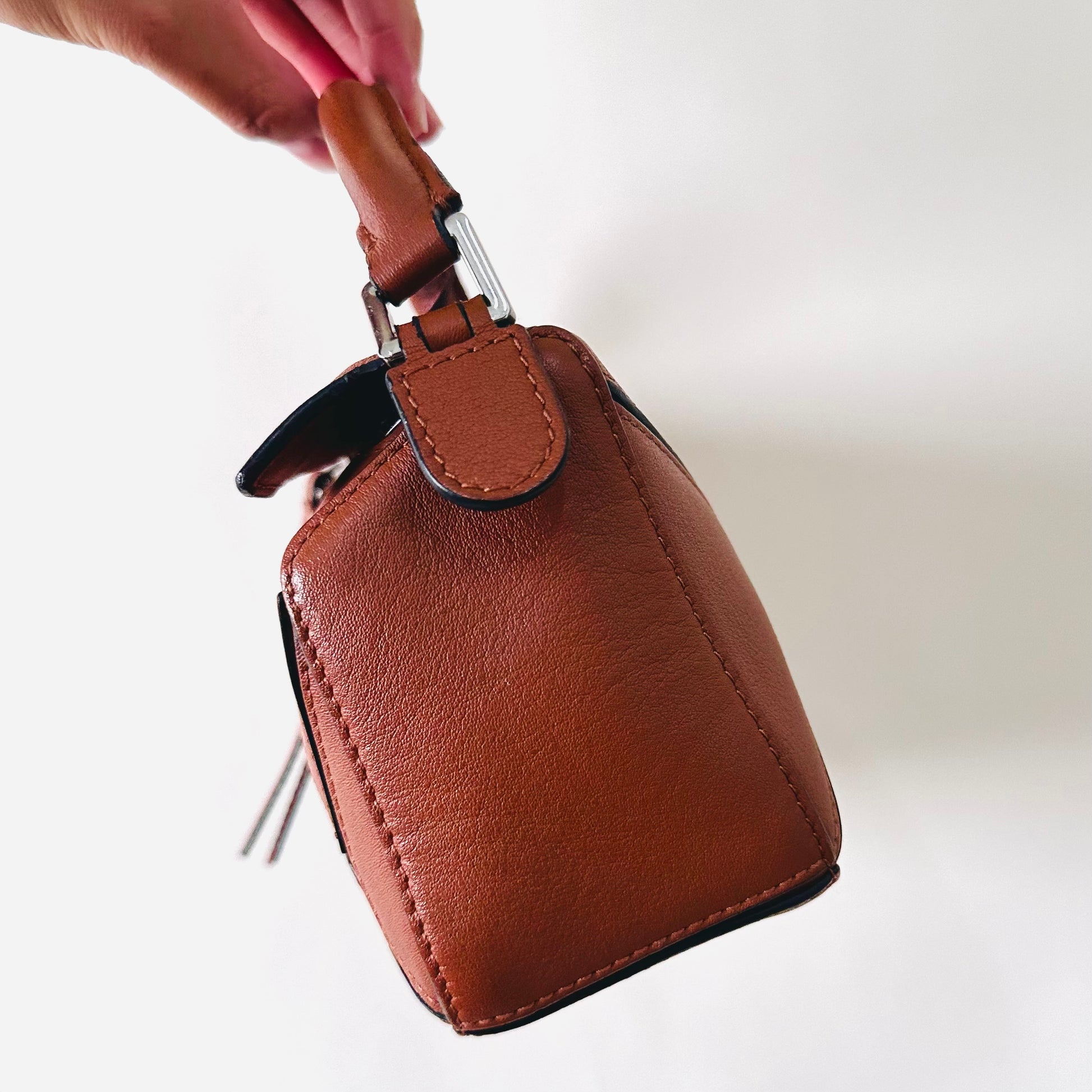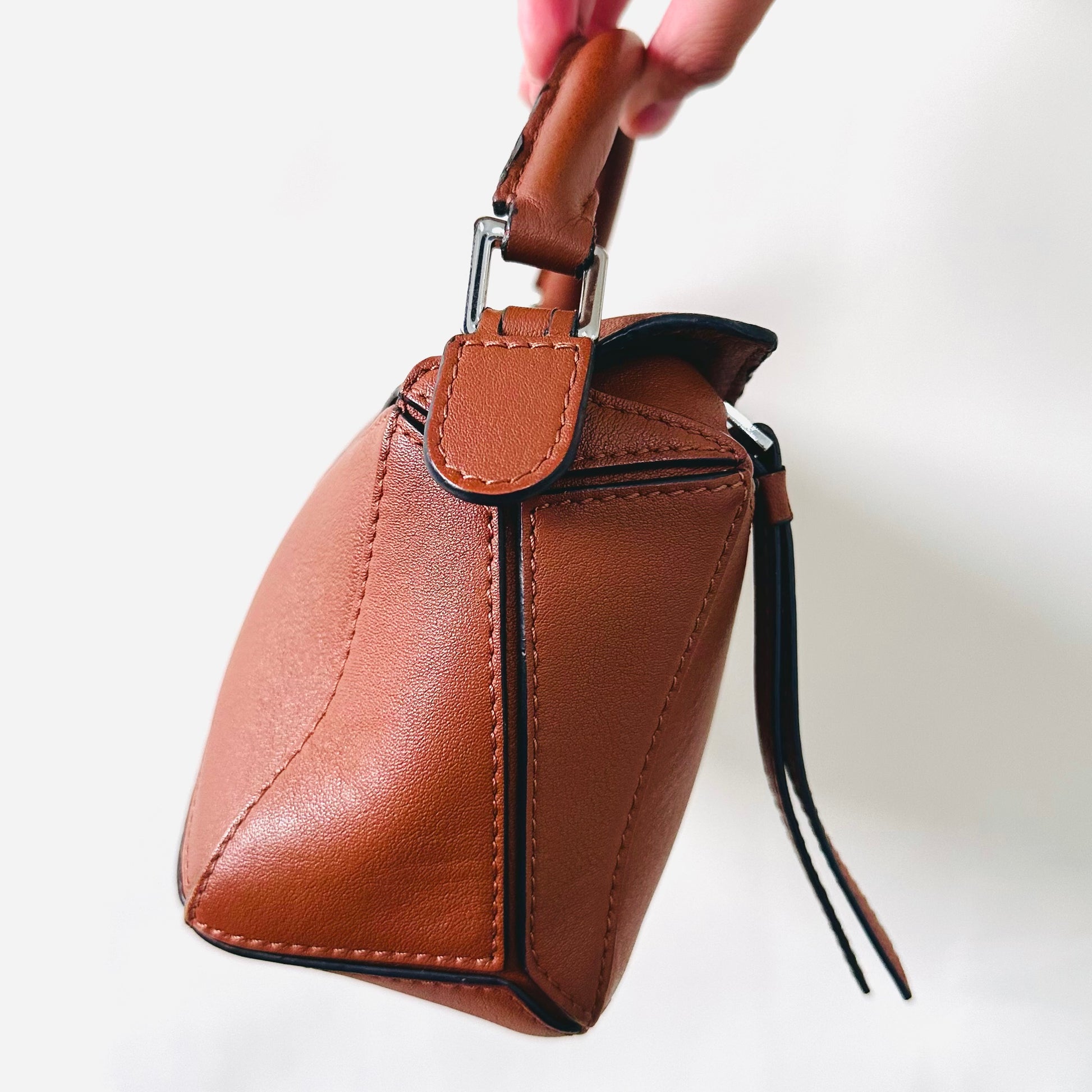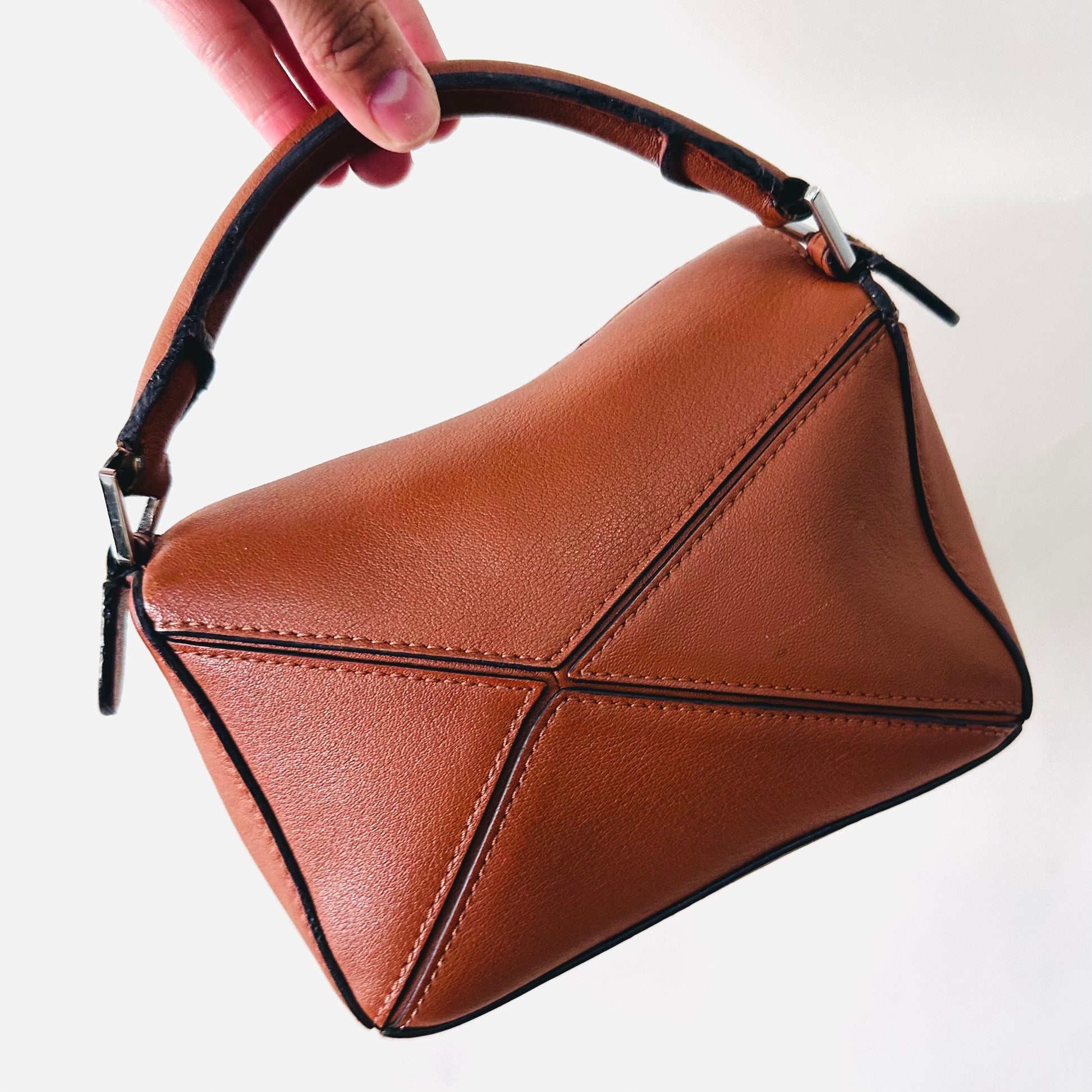 Loewe Tan Brown Mini Puzzle Classic Calfskin Leather Anagram Logo Monogram 2-Way Top Handle Shoulder Sling Bag