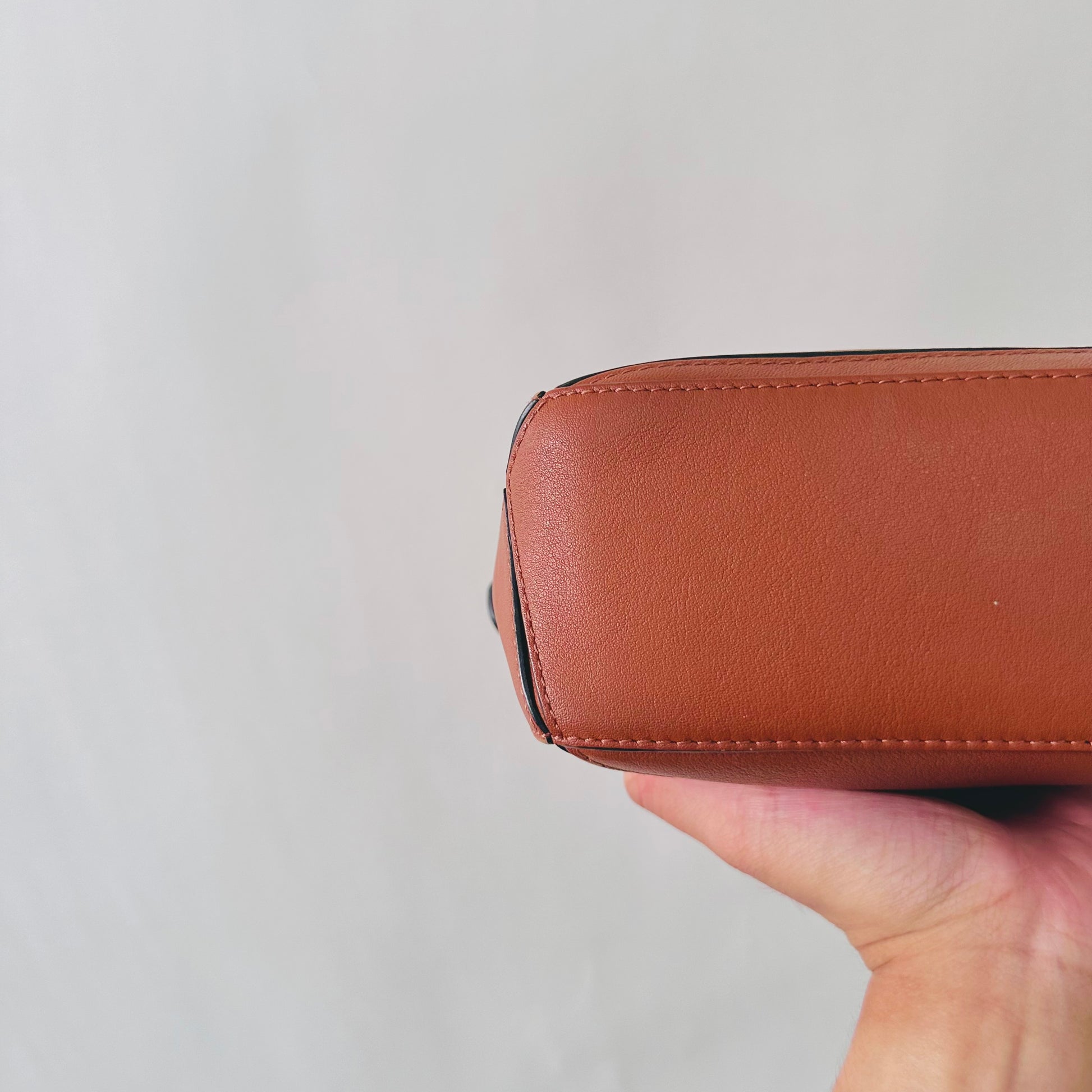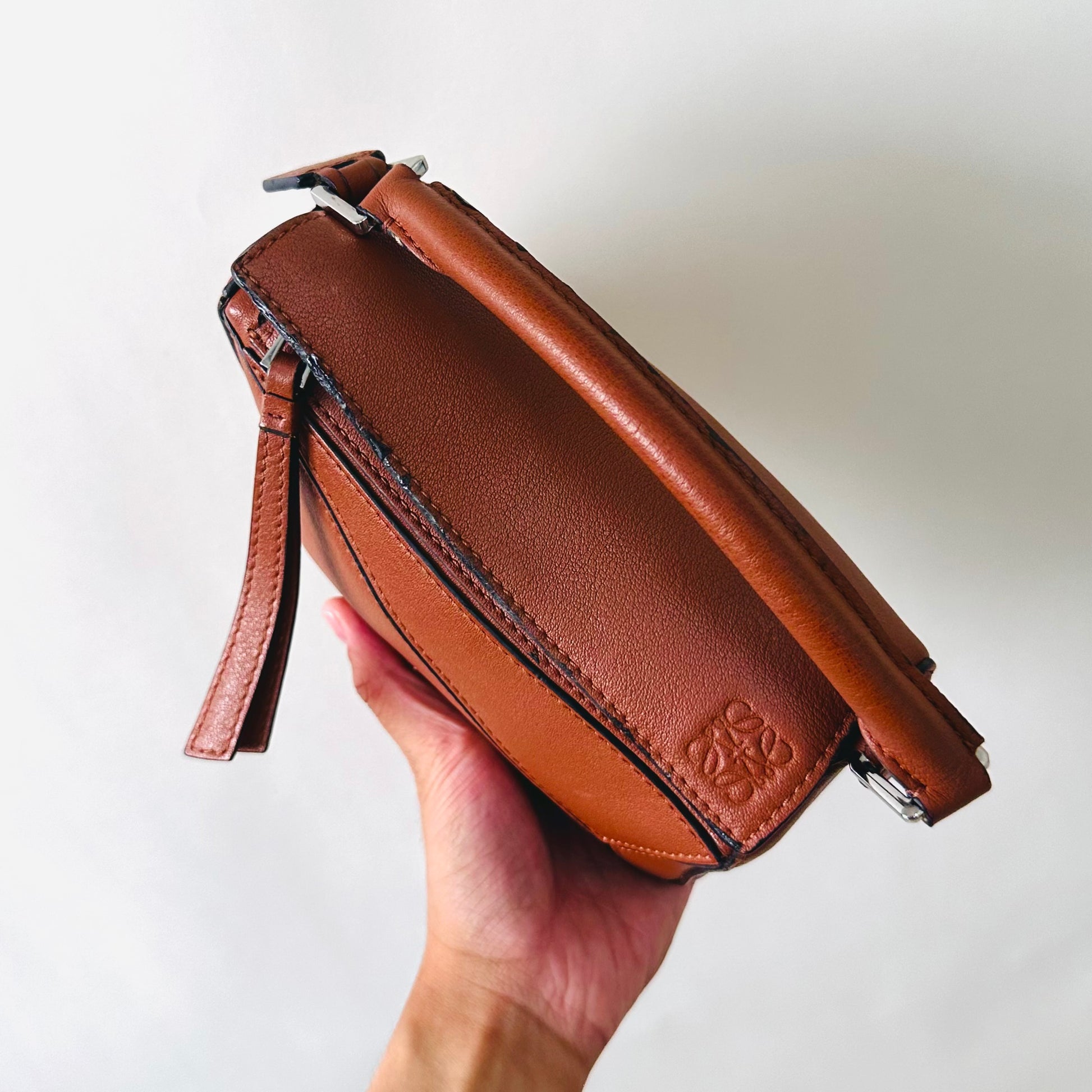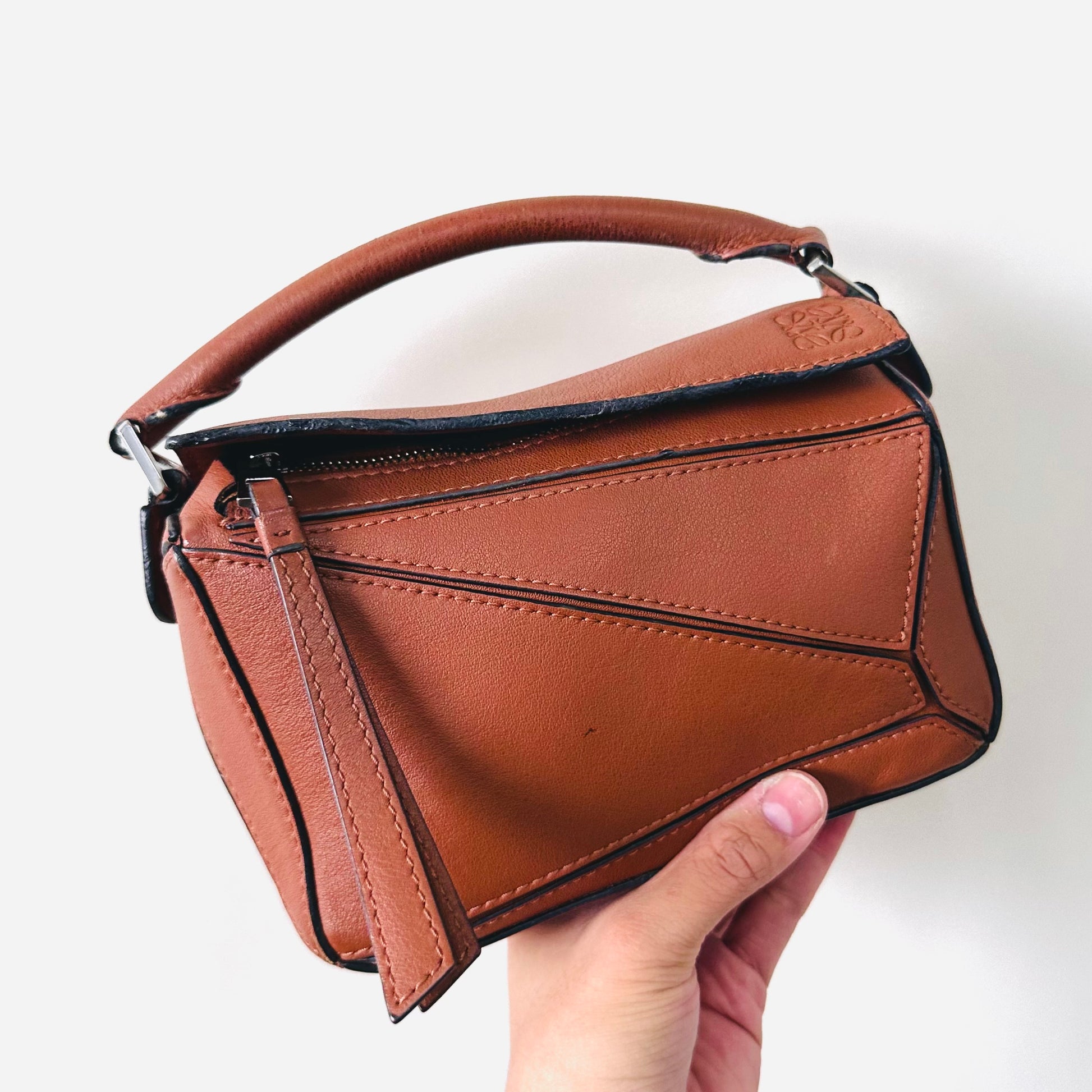 Loewe Tan Brown Mini Puzzle Classic Calfskin Leather Anagram Logo Monogram 2-Way Top Handle Shoulder Sling Bag