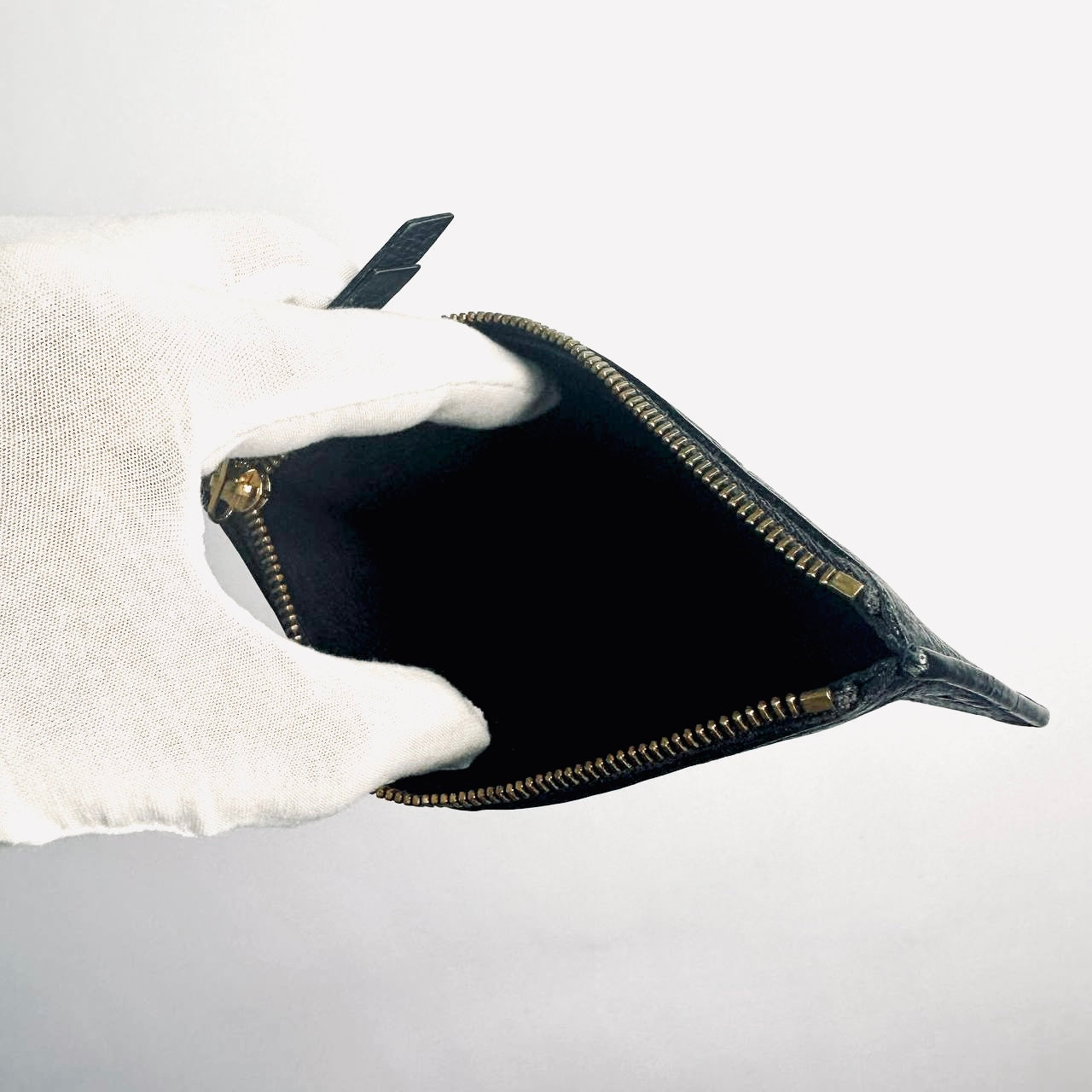 Preloved 9.6/10. This has a zip closure and central compartment. This measures 18x8x0.5cm.