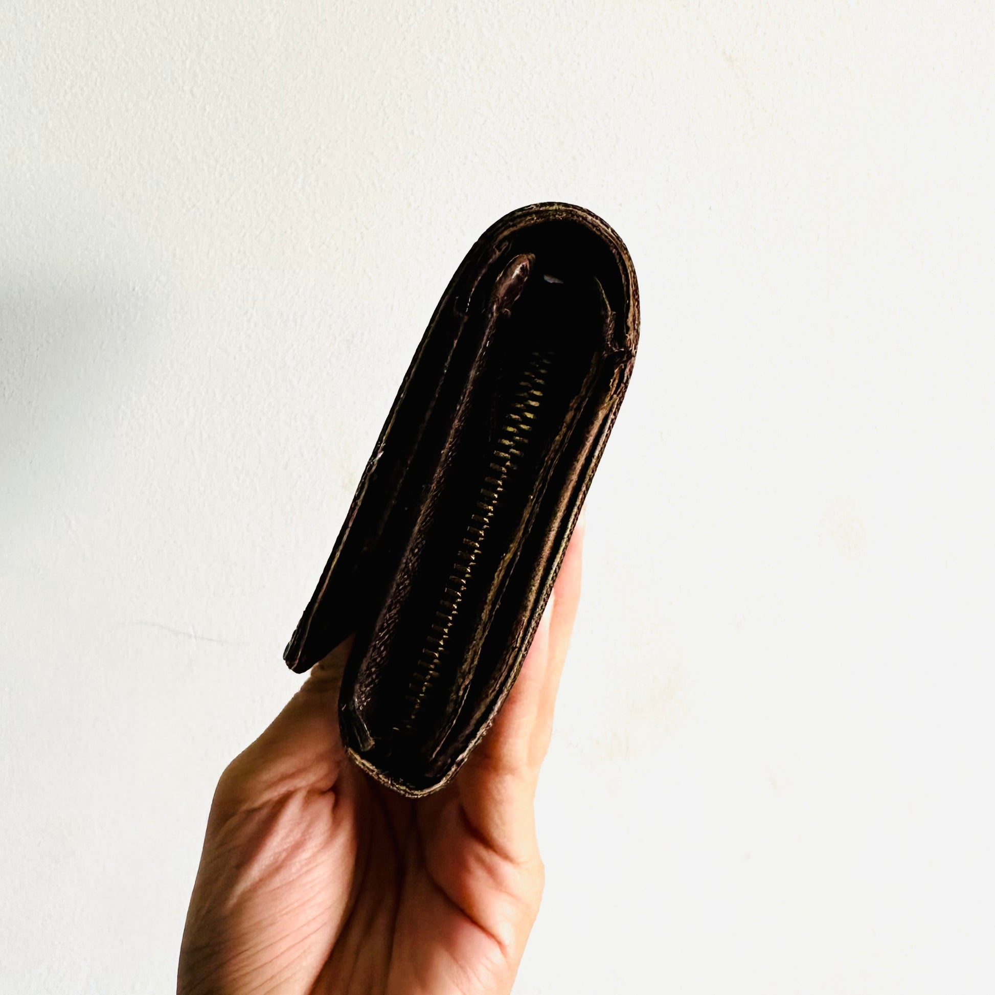 This has a flap button closure, zip coin purse, notes compartment and slip pockets. This measures 14x9x3cm. This comes with clearly engraved hardware, interior stamping and date code.
