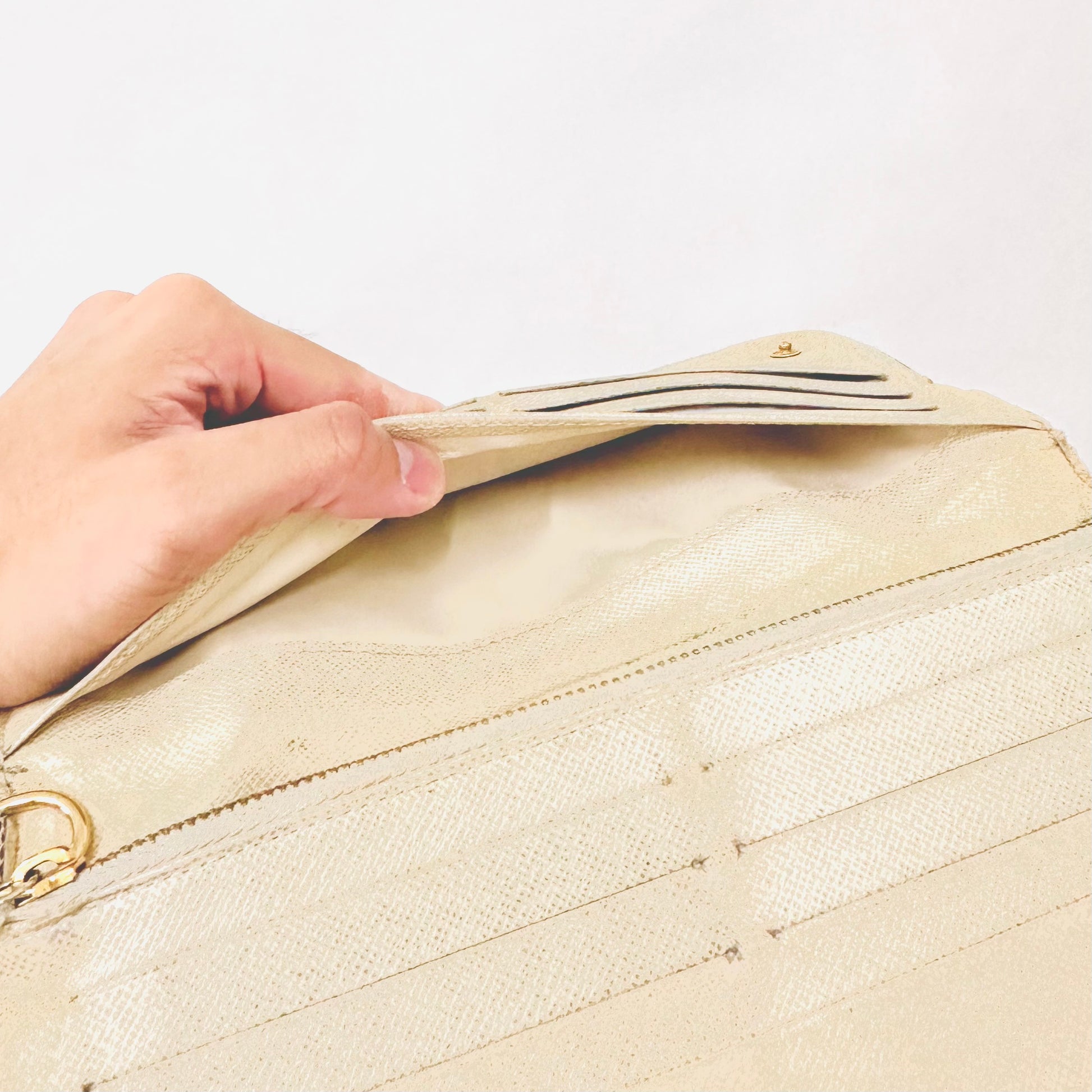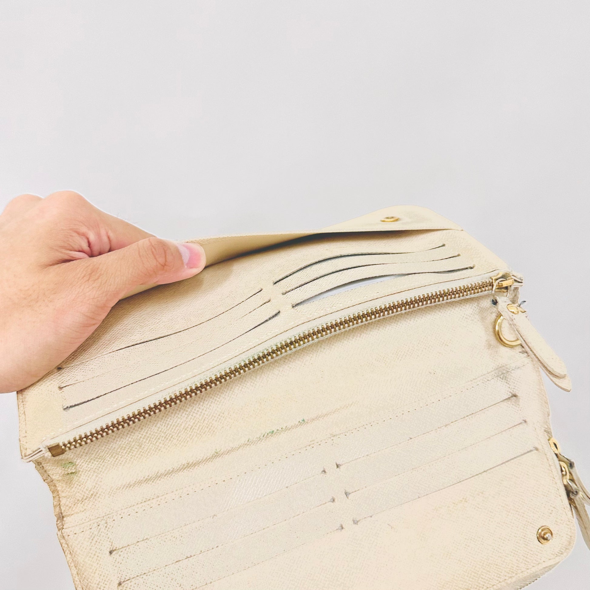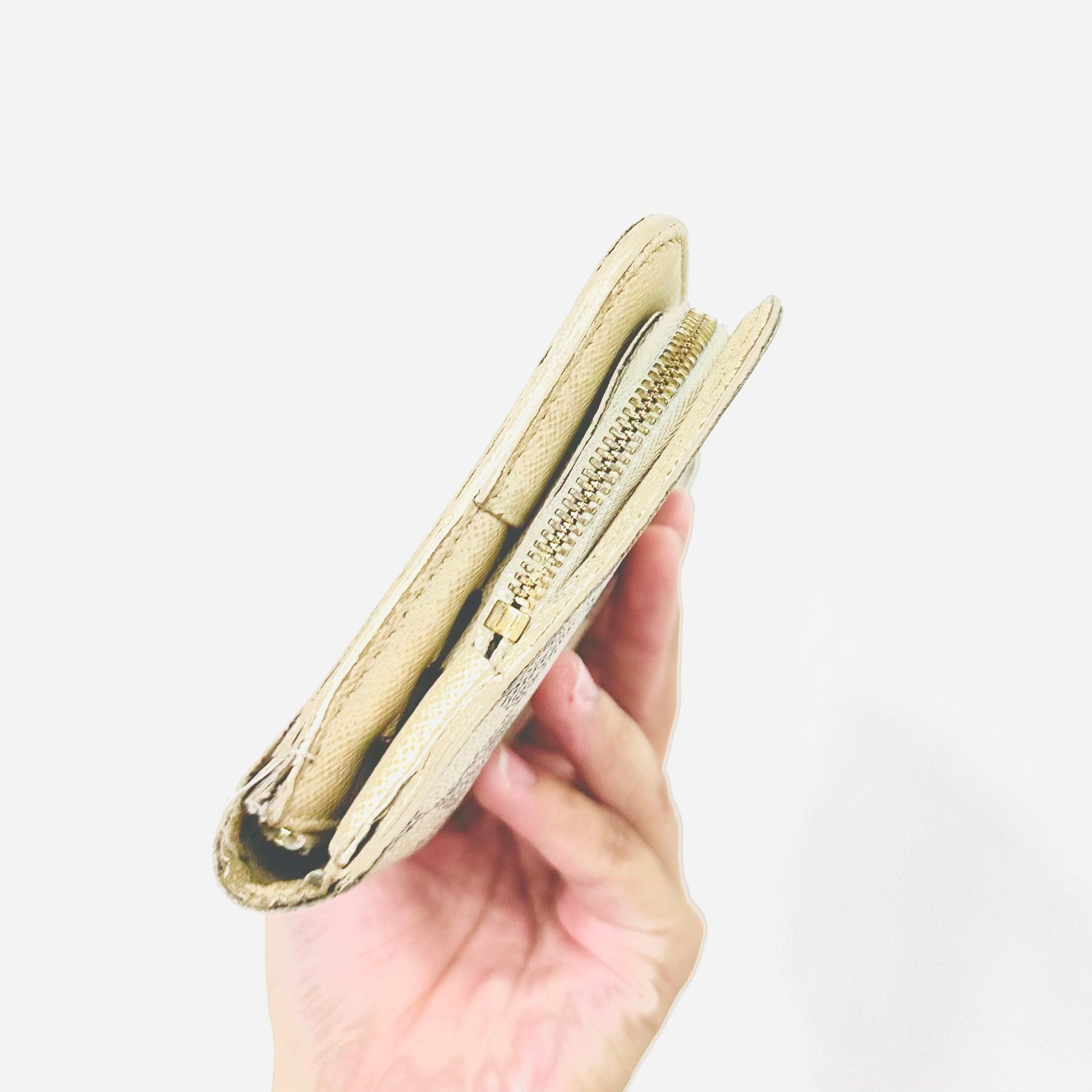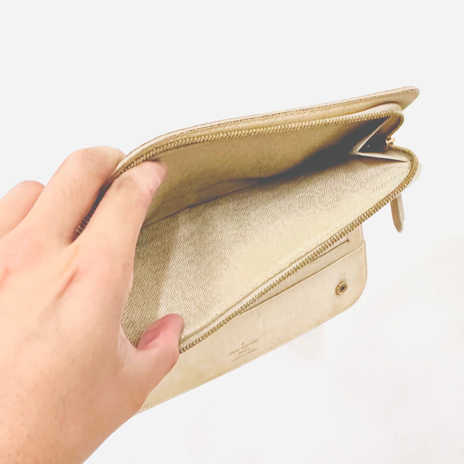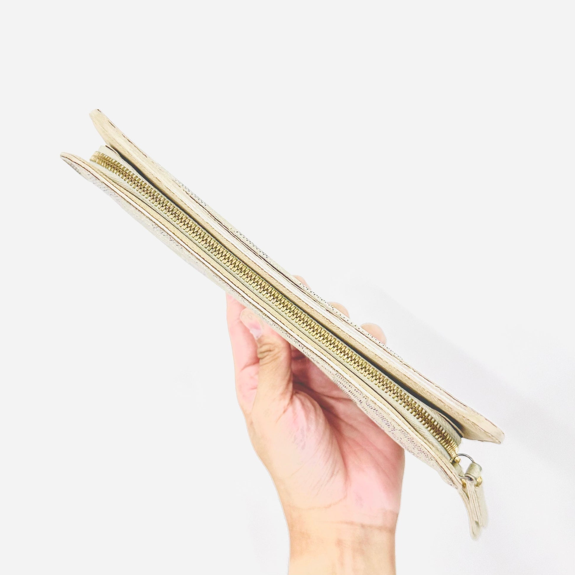 Preloved 9.3/10. This has a zip around closure, button closures, central compartments, zip compartment, slip pockets and card slots. This measures 21x10.5x3xm.