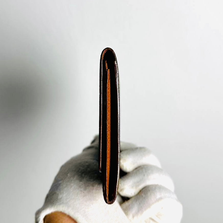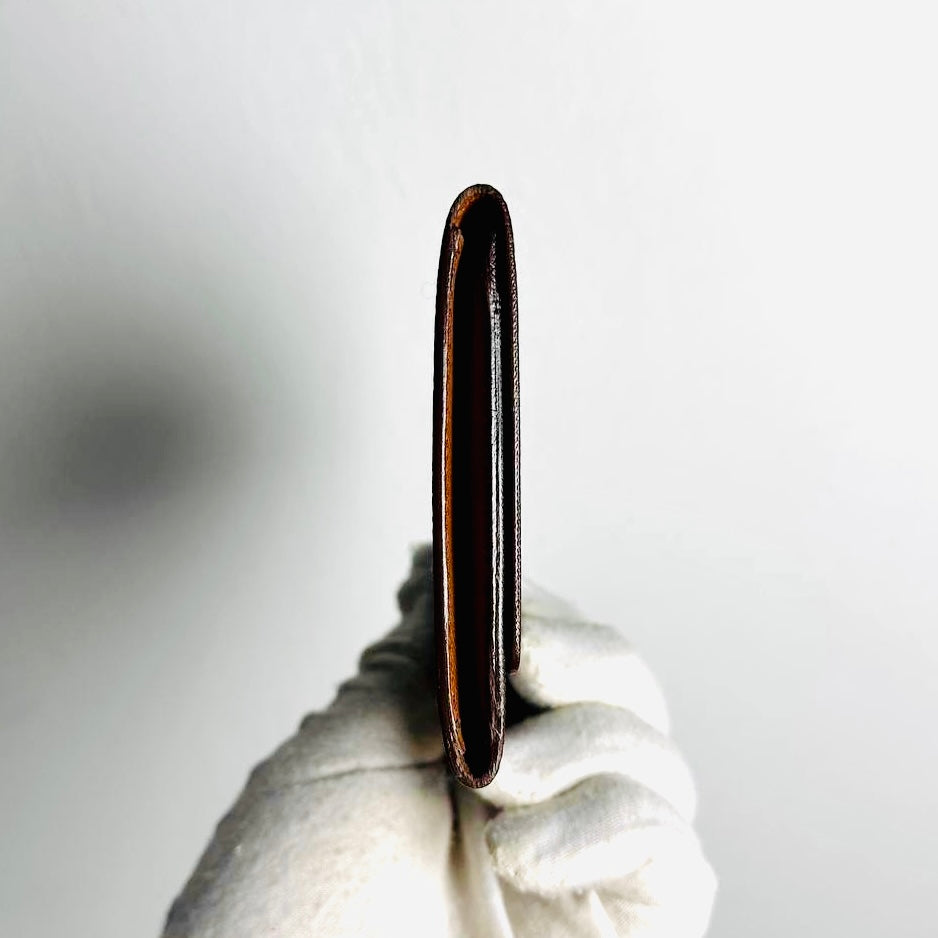 This has a slip pocket and central compartment. This measures 18x9x1cm. This comes with clearly engraved hardware, interior stamping and date code.