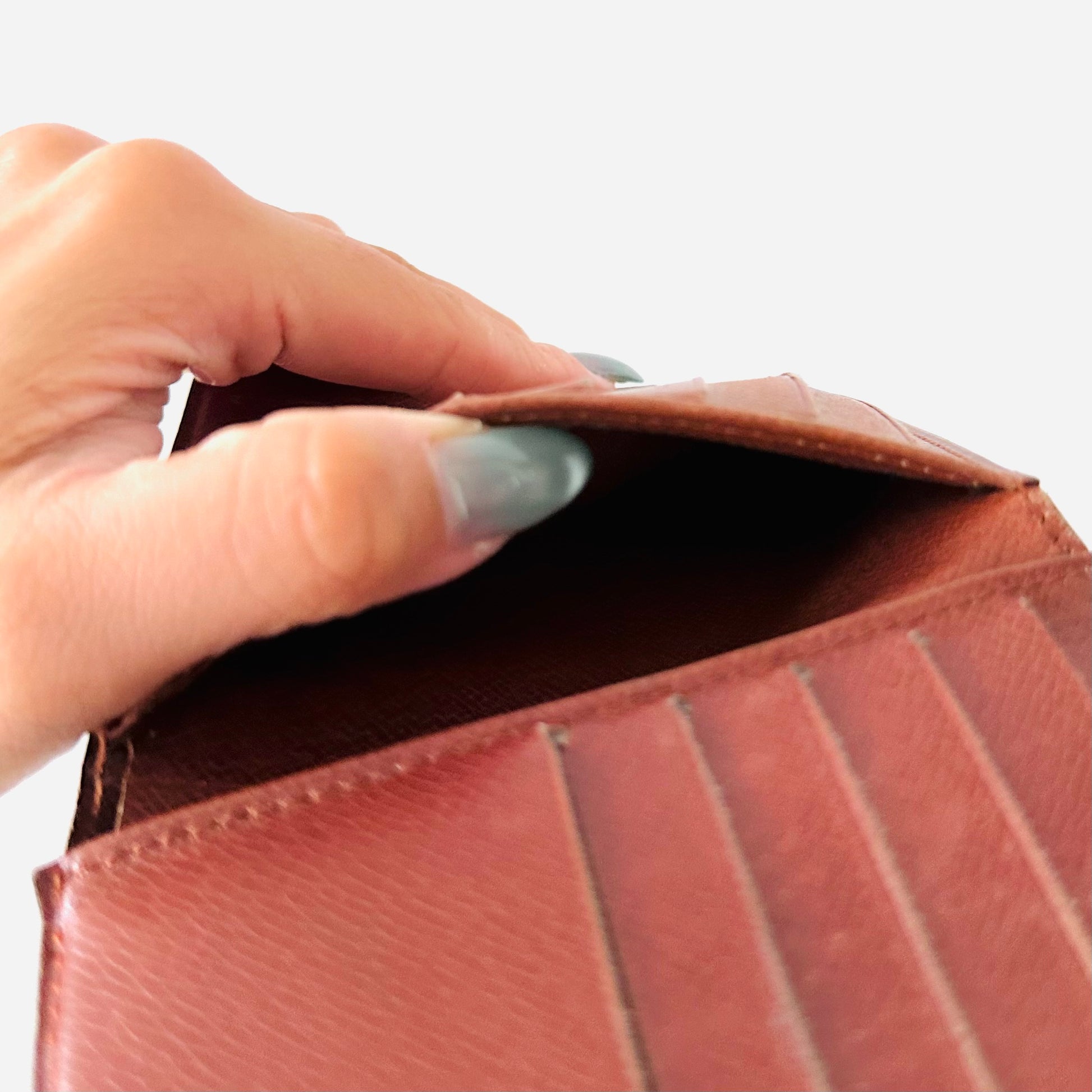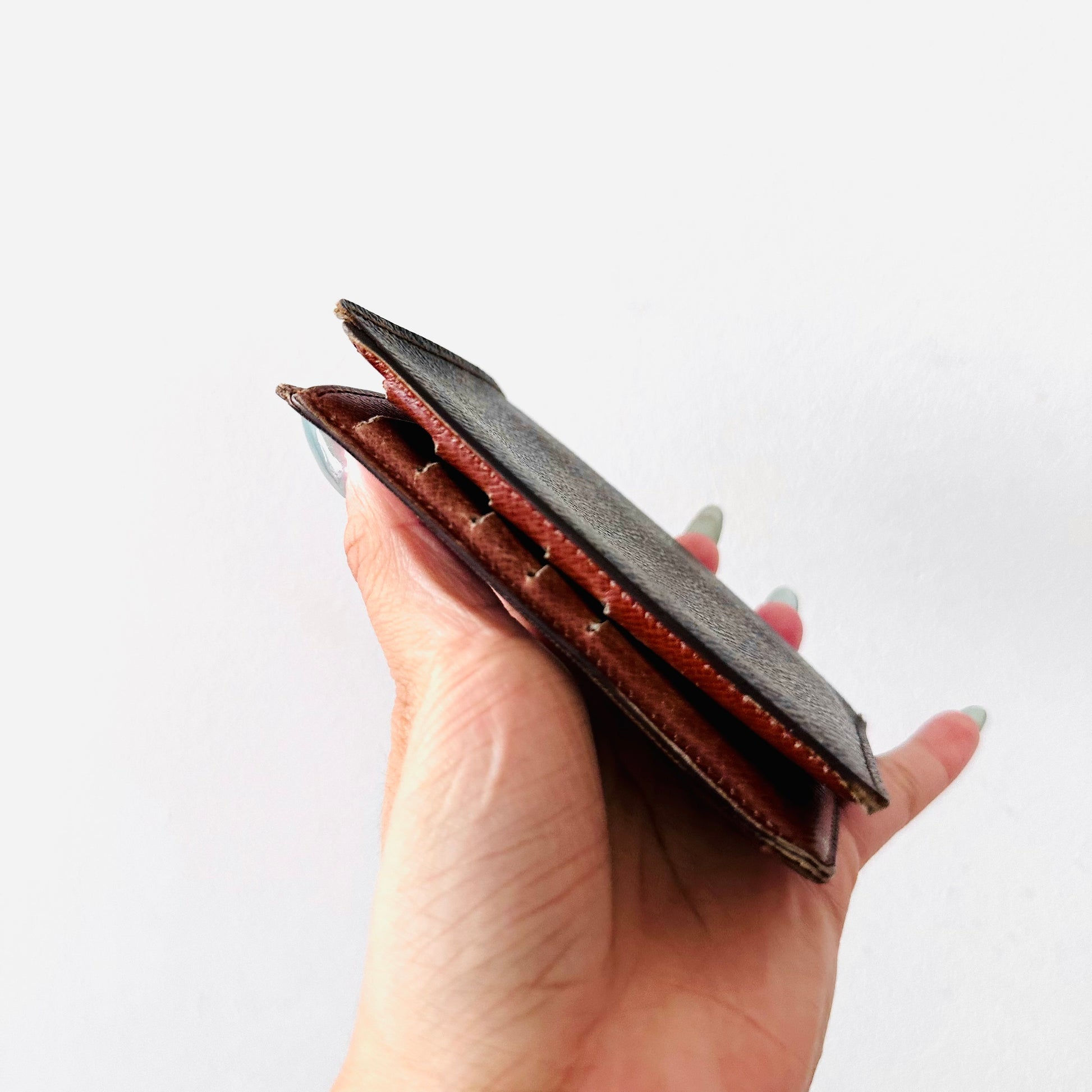 Preloved. This has card slots, slip pockets and central compartments. This measures 11x11x2cm.