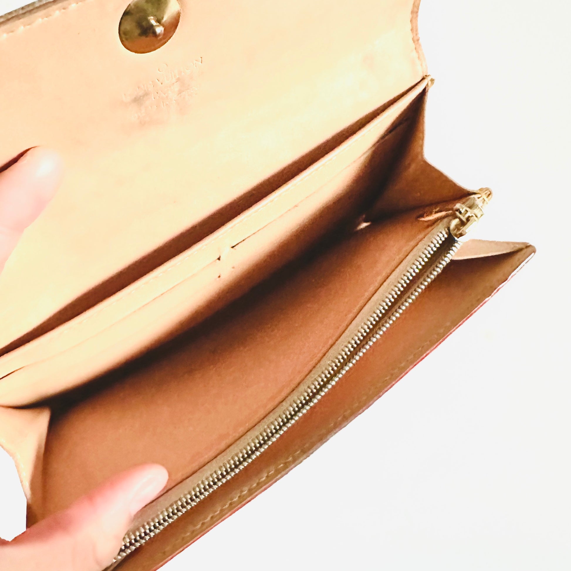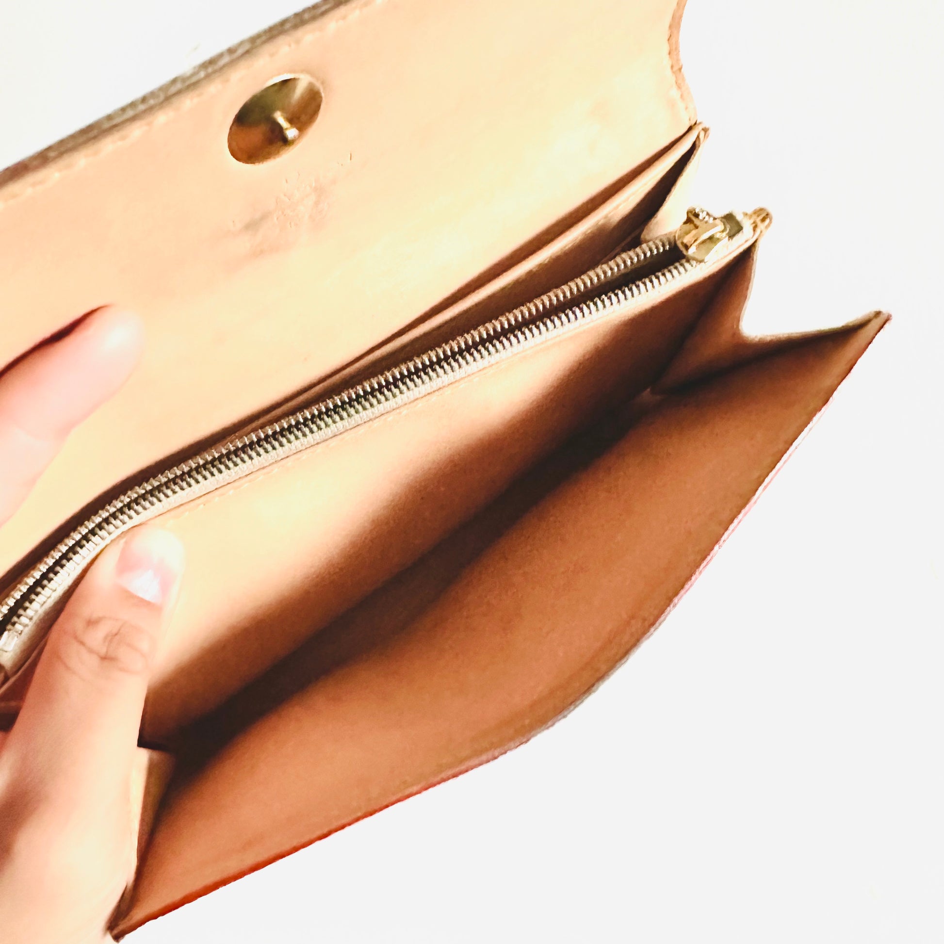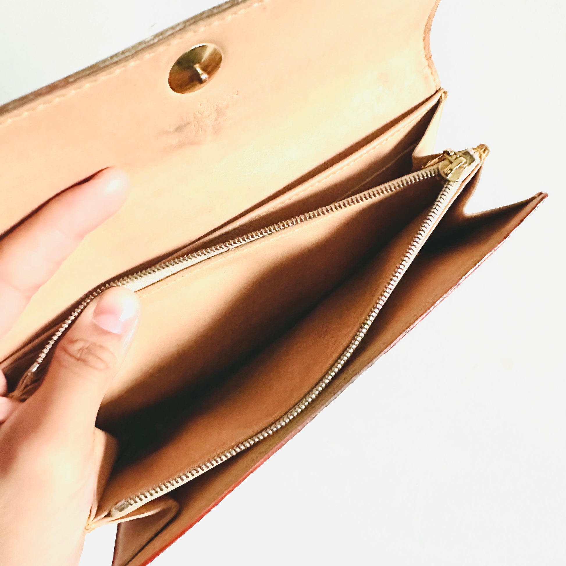 Preloved 9.2/10. This has a flap button closure, zip pocket, notes compartment, slip pockets and card slots. This measures 19x10.5x2.5cm.