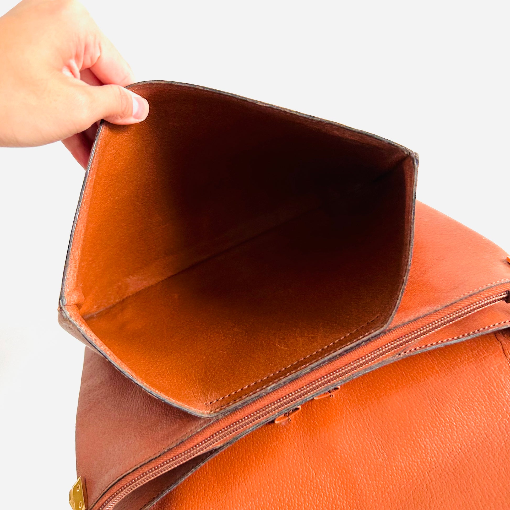 Preloved 9.4/10. This has a flap turnlock closure, front slip pocket, zip pocket, slip pockets and central compartments. This measures 25x19x5cm.