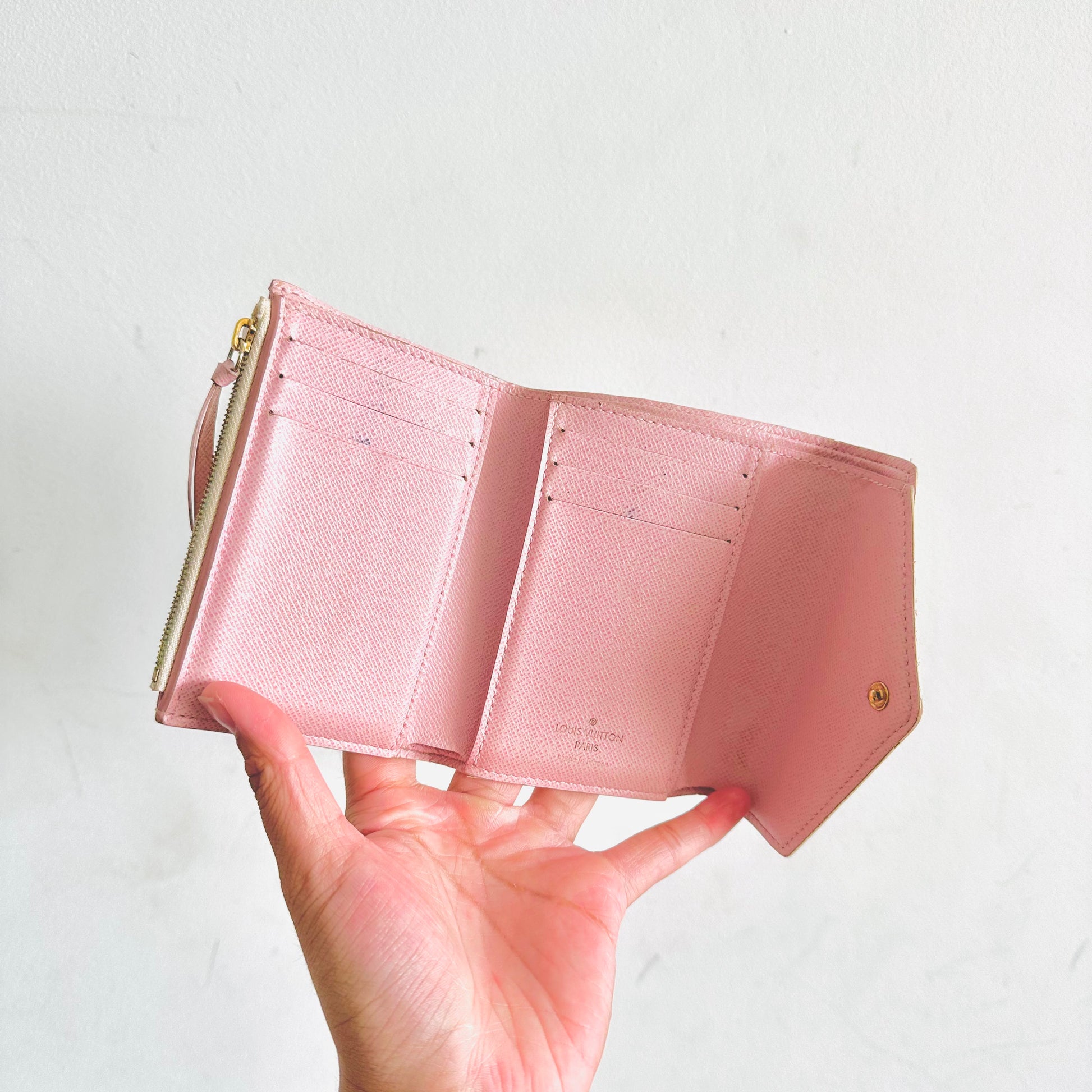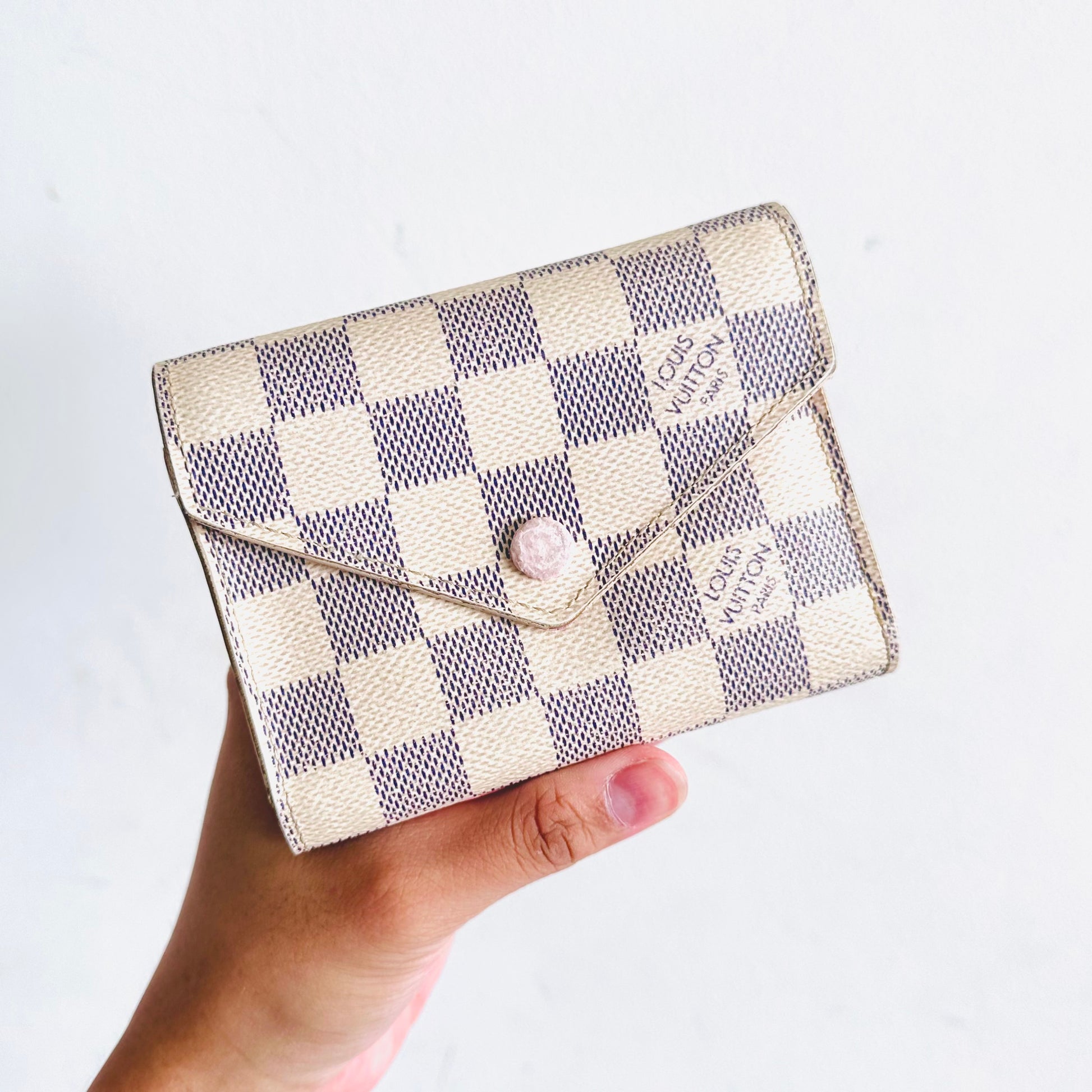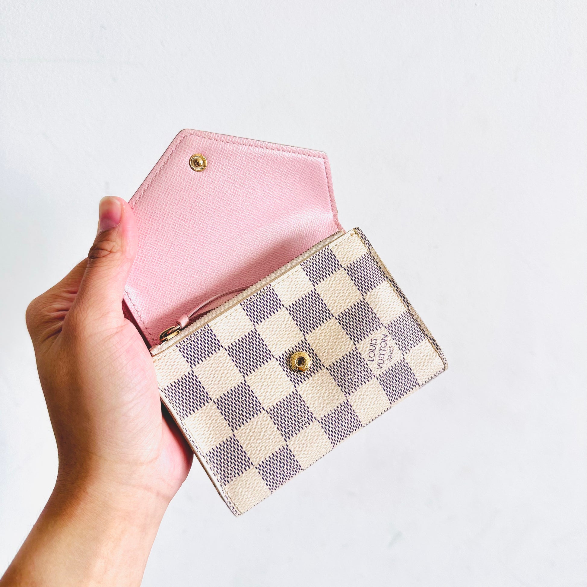 Louis Vuitton LV Victorine Damier Azur DA & Rose Ballerine Pink Monogram Logo GHW Flap Compact Trifold Wallet