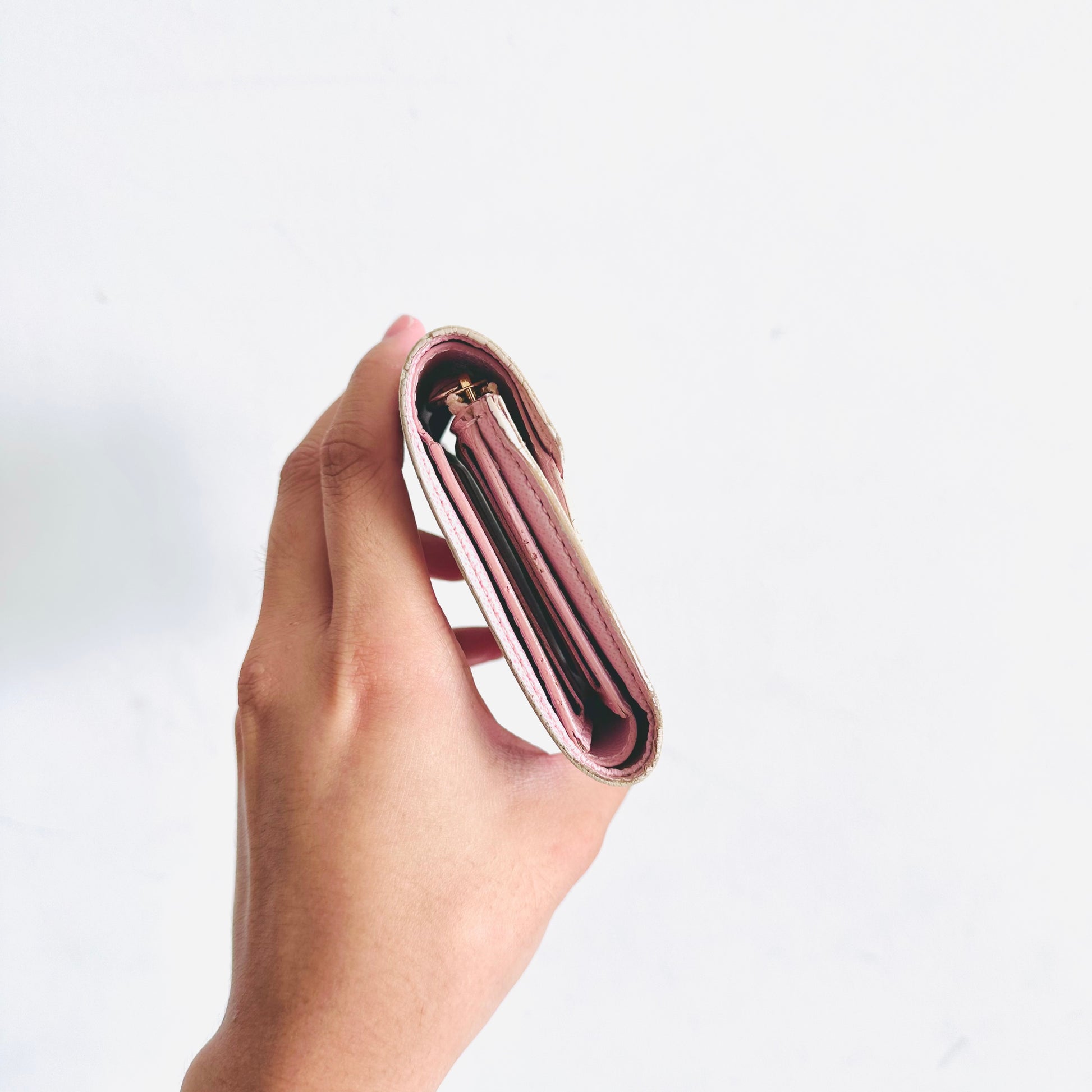 Preloved 9.3/10. This has a flap button closure, zip pocket, notes compartment, slip pockets and card slots. This measures 12x9.5x1.5cm.