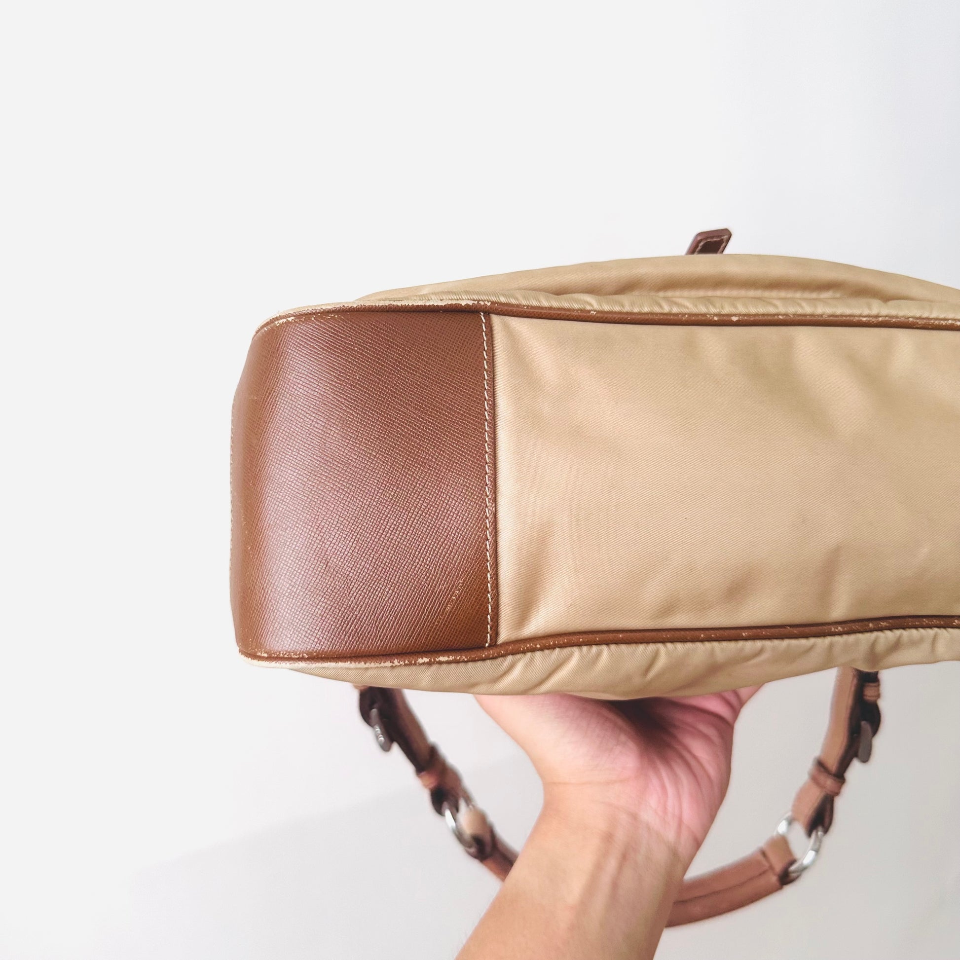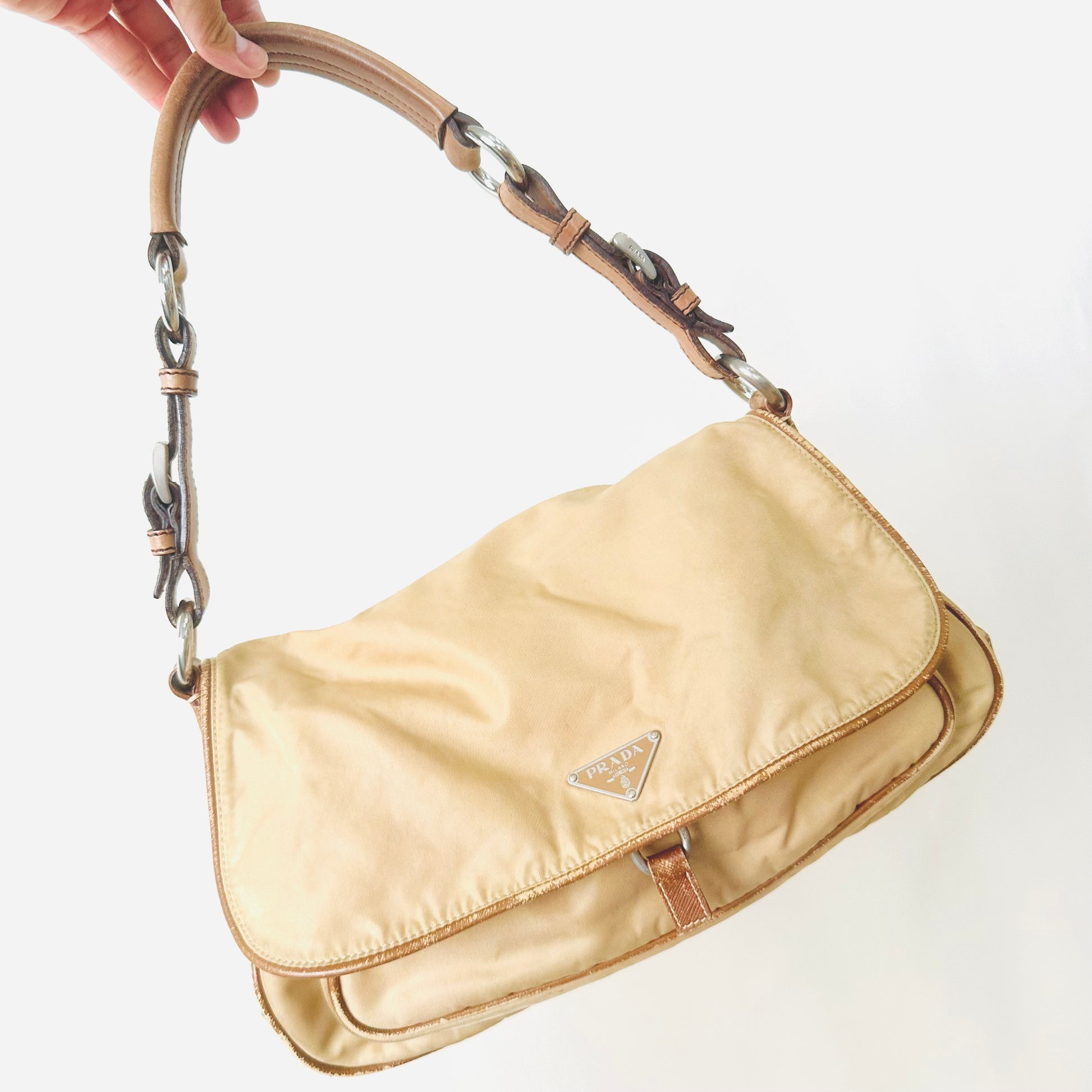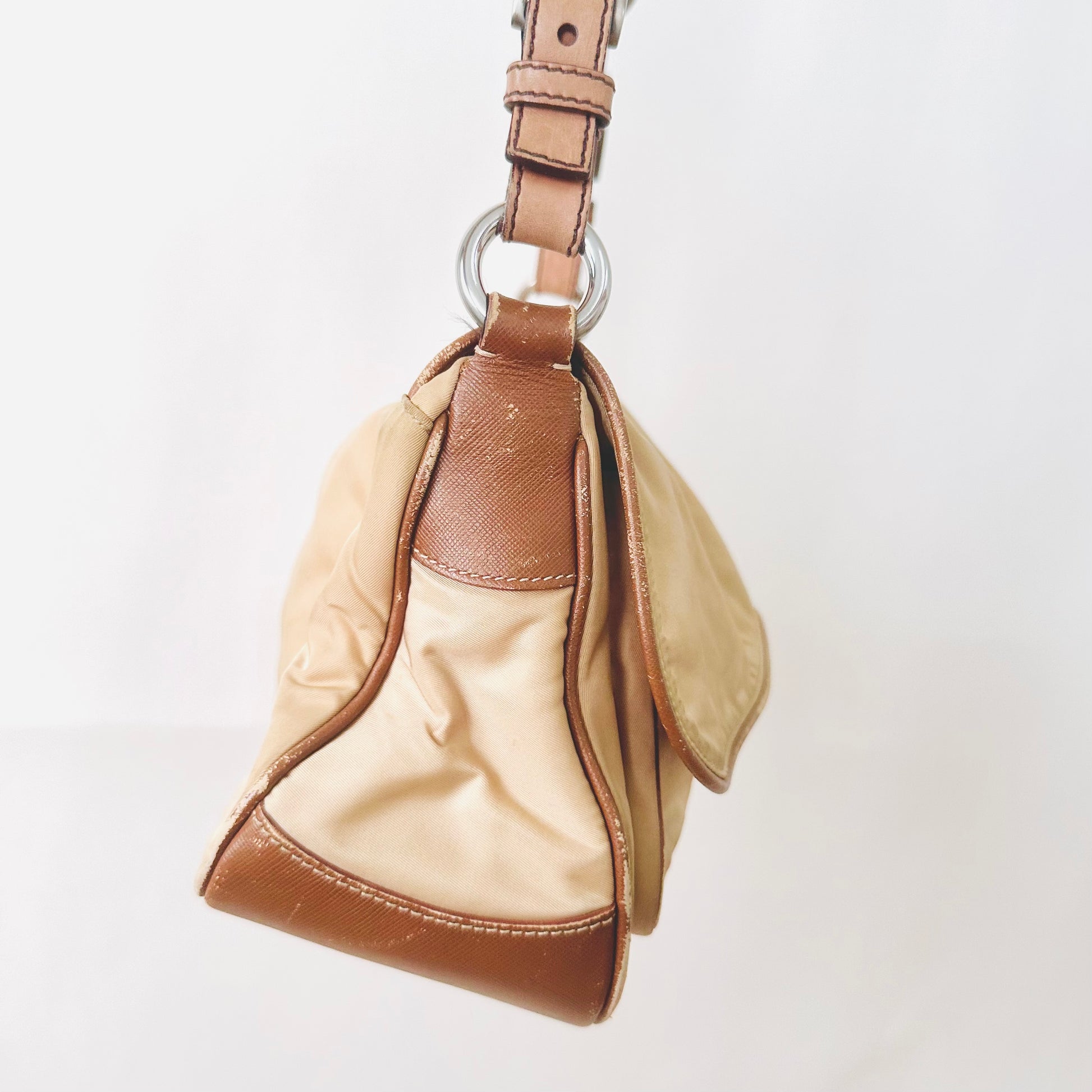Prada Beige Tessuto Classic Logo Nylon Flap Baguette Hobo Pochette Shoulder Bag
