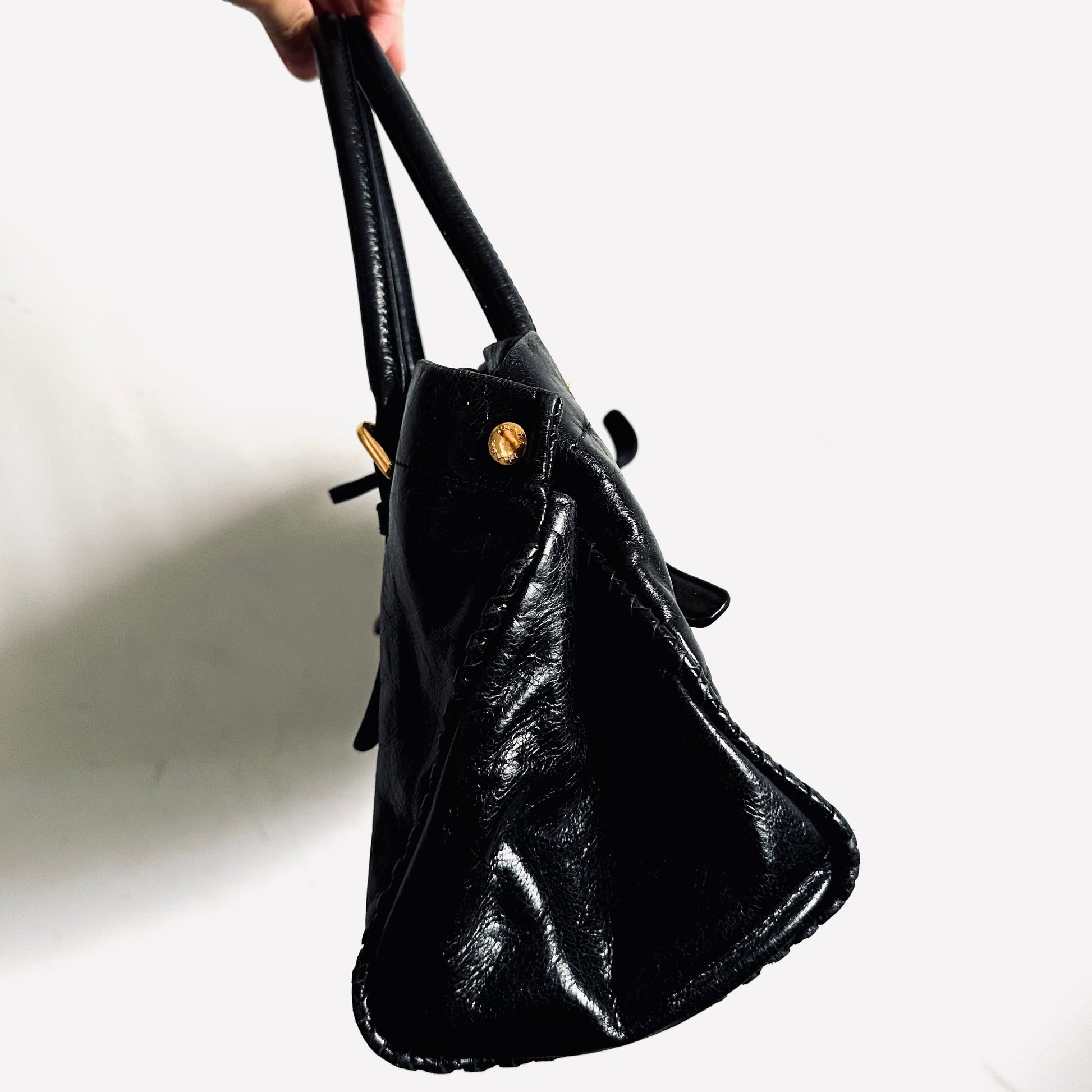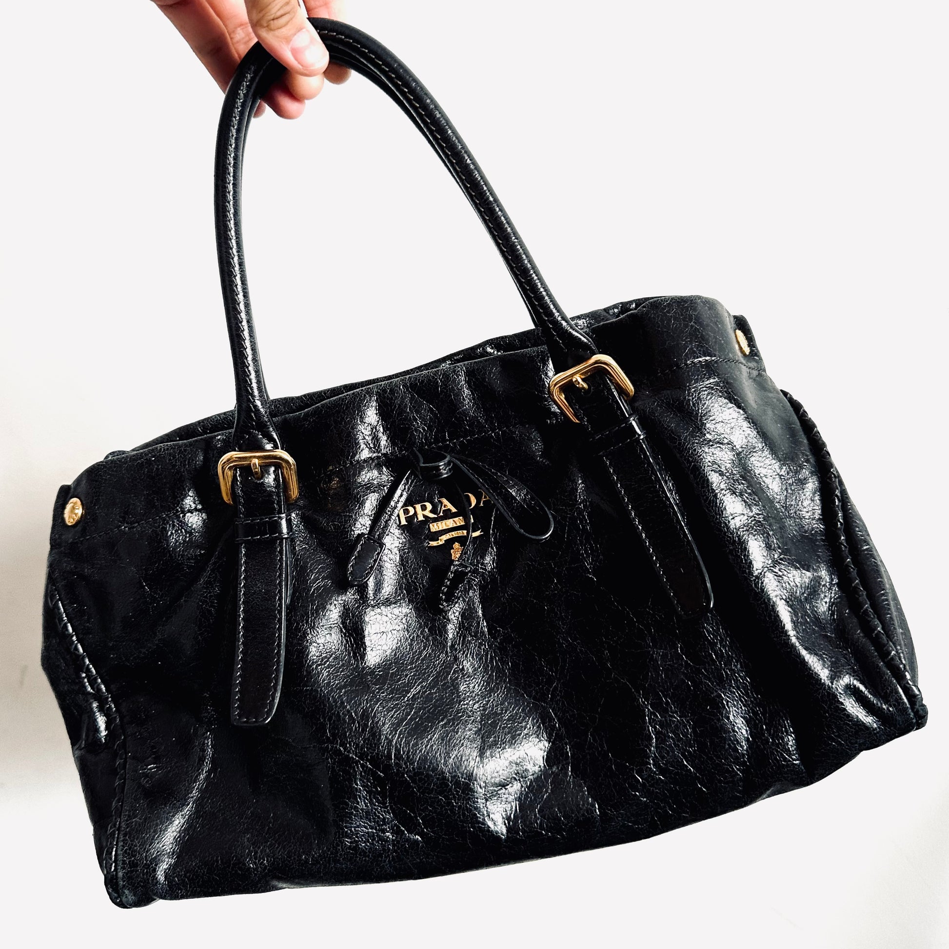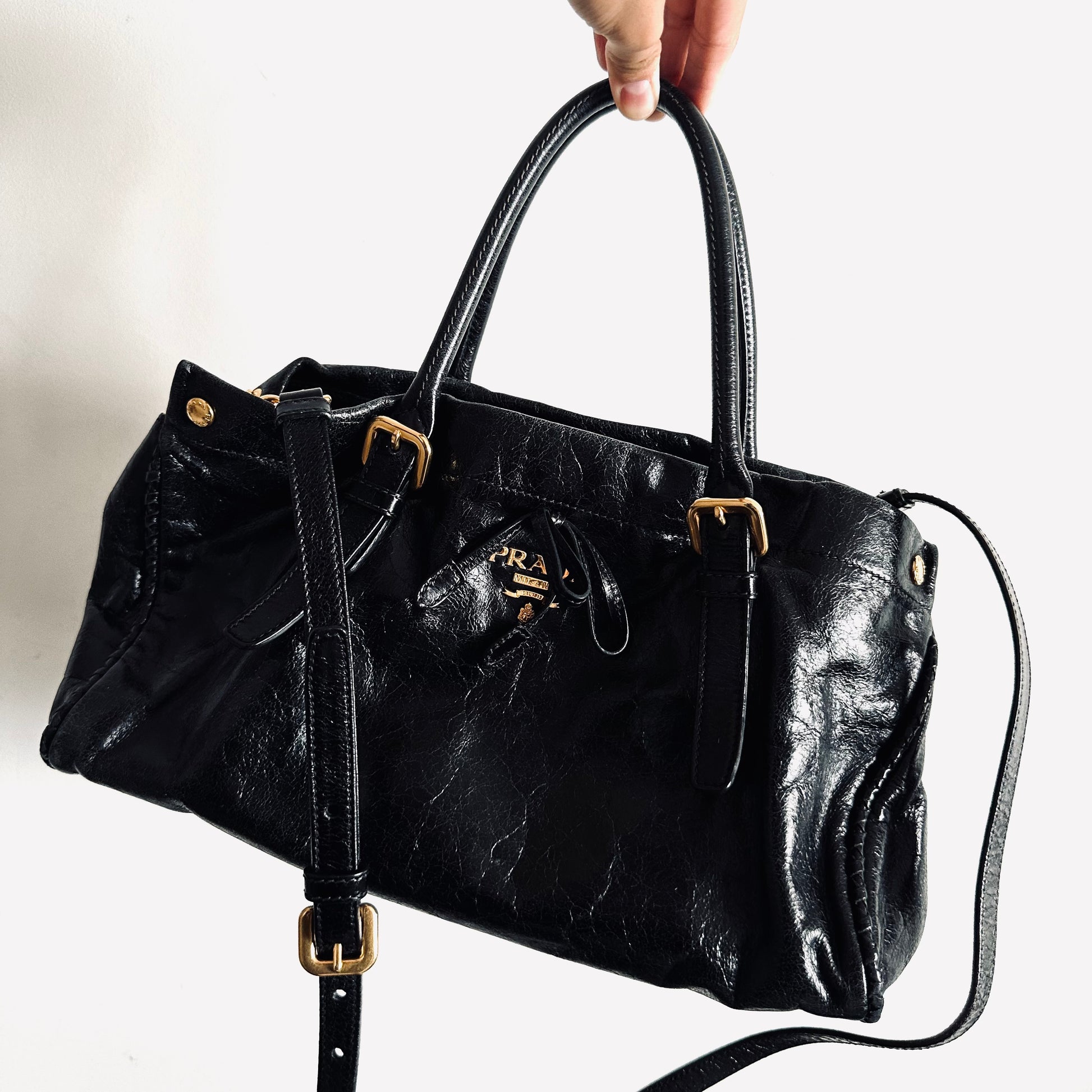 Prada Black GHW Vitello Shine Leather Classic Logo 2-Way Shopper Shoulder Sling Tote Bag