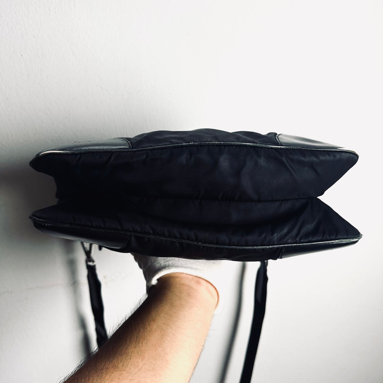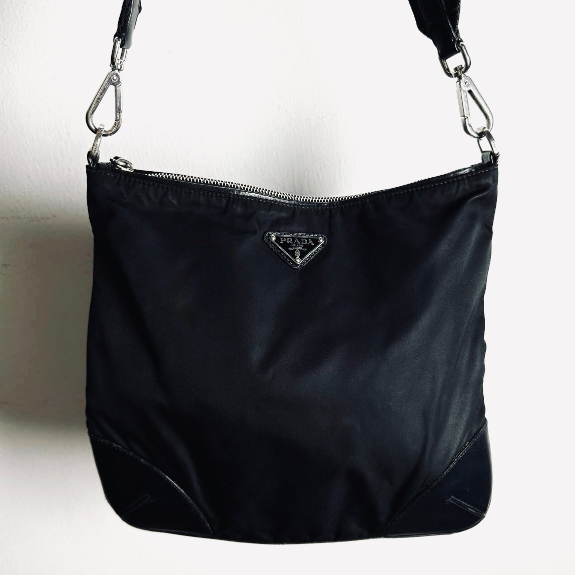 Prada Black Tessuto Monogram Logo Nylon & Leather Hobo Baguette Shoulder Sling Bag