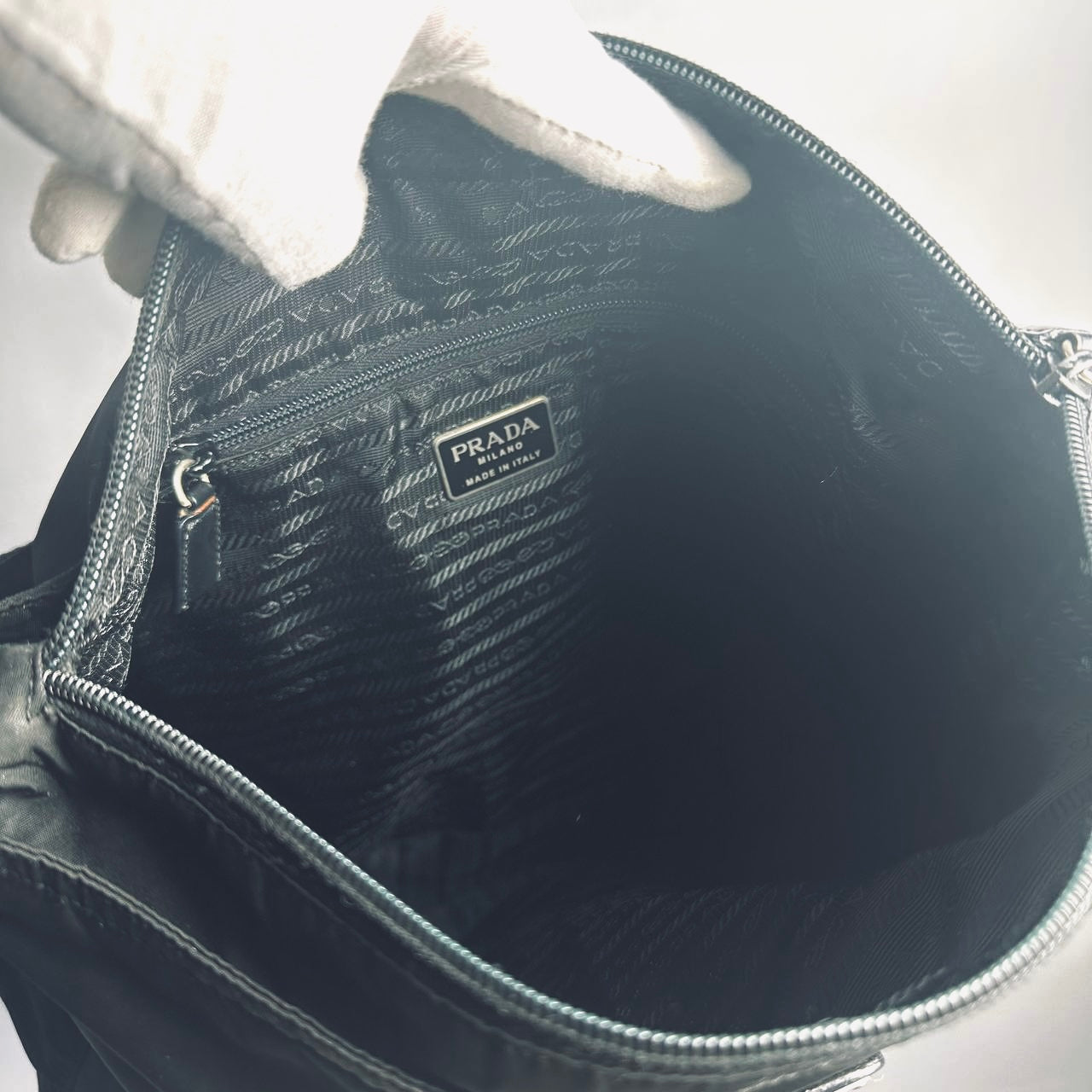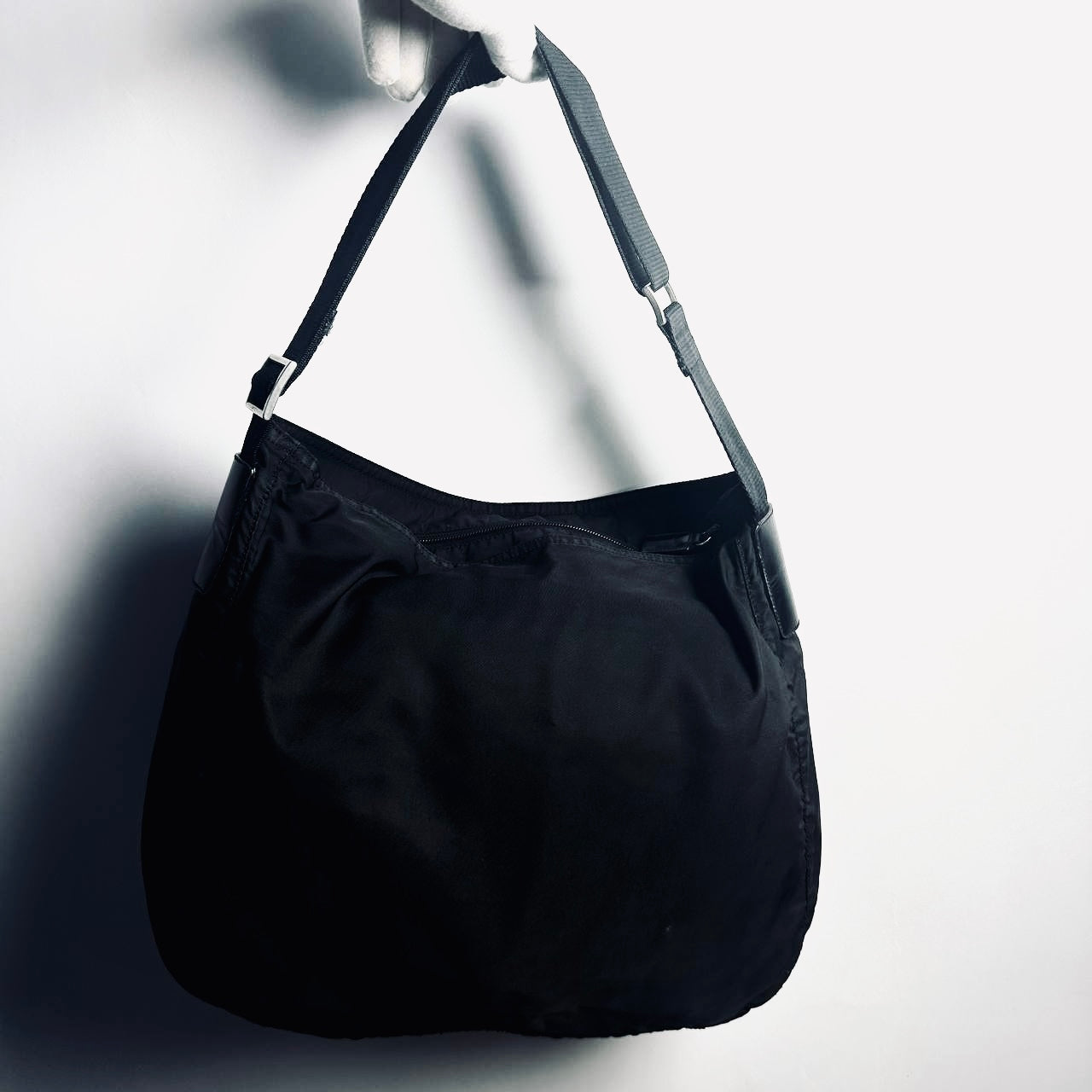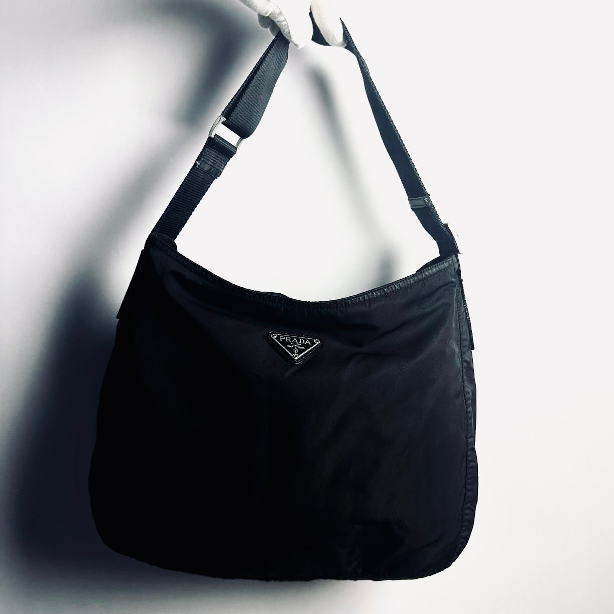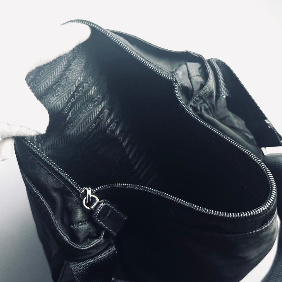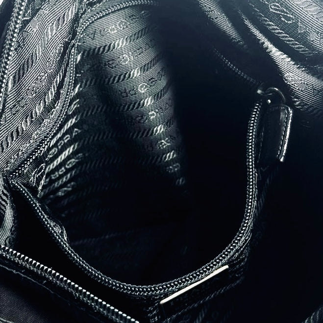 Prada Black Vela Classic Monogram Logo Hobo Baguette Nylon & Leather Shoulder Sling Bag