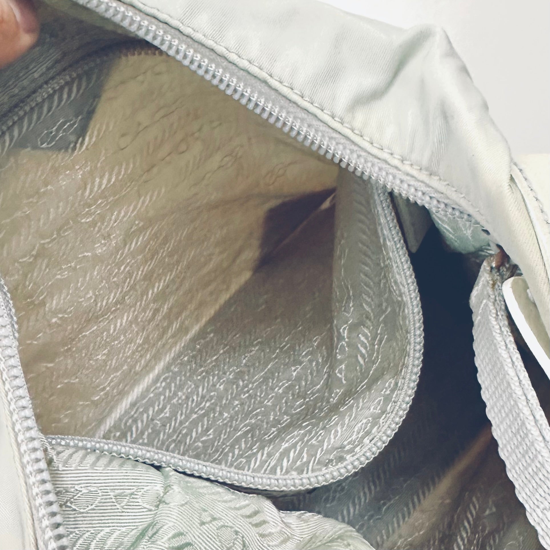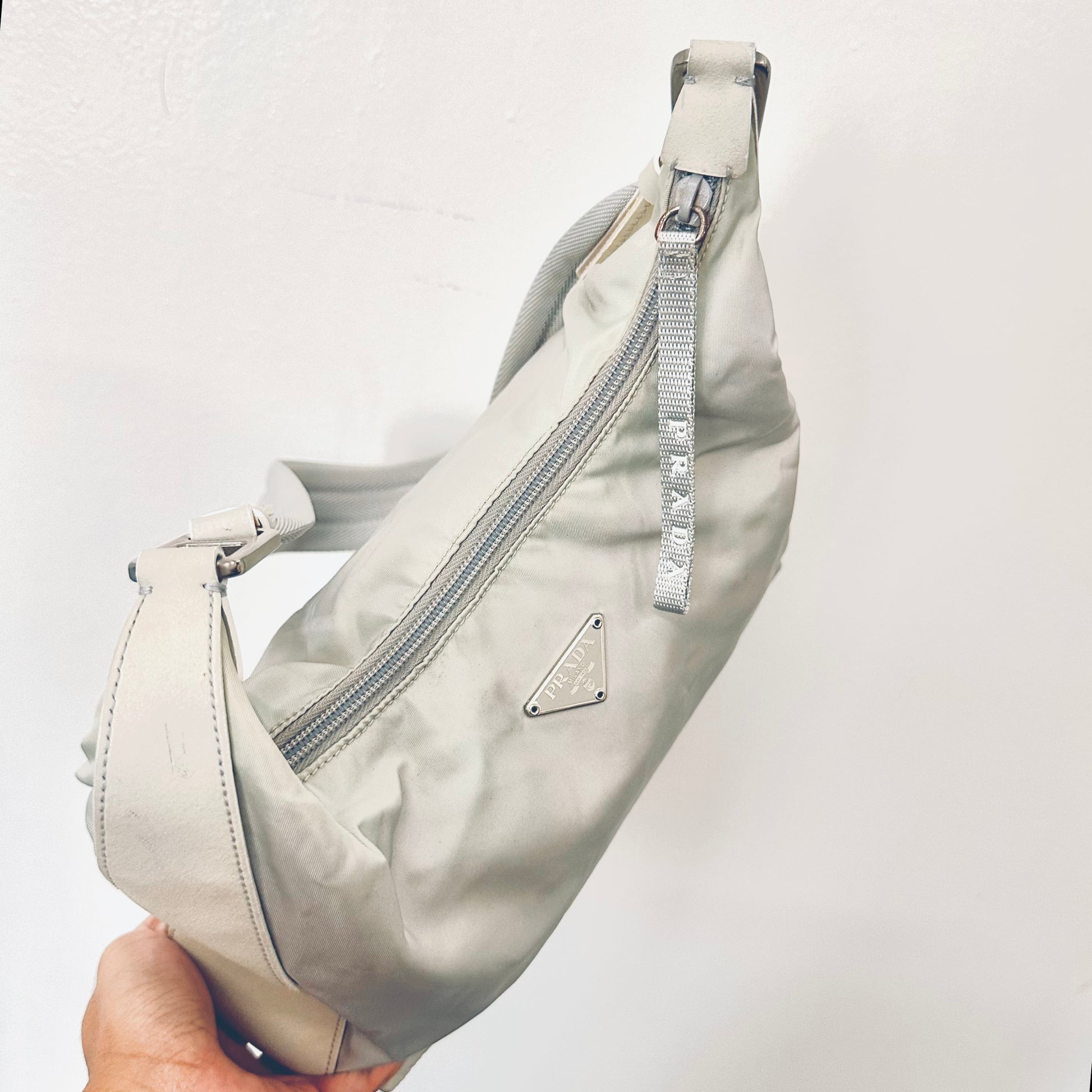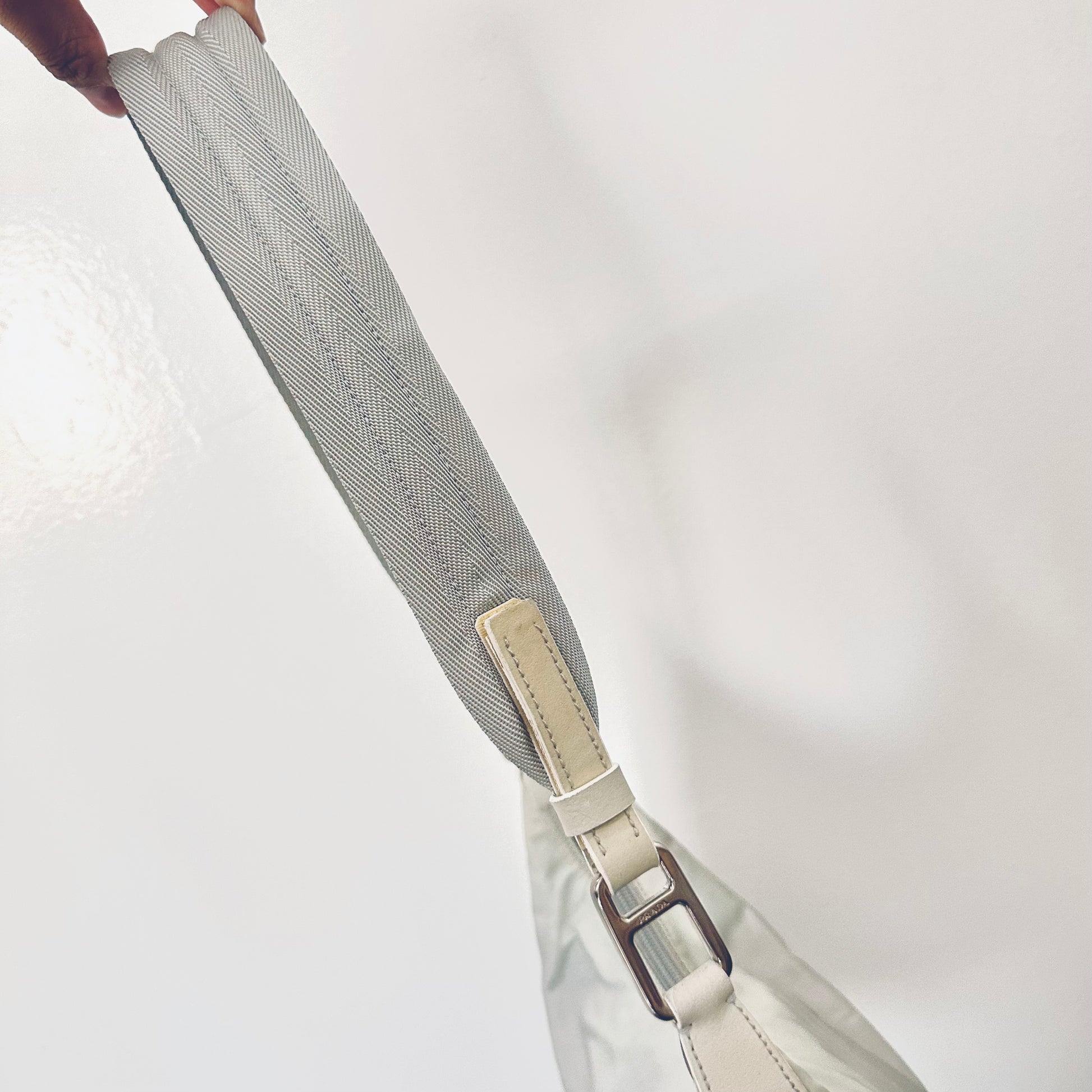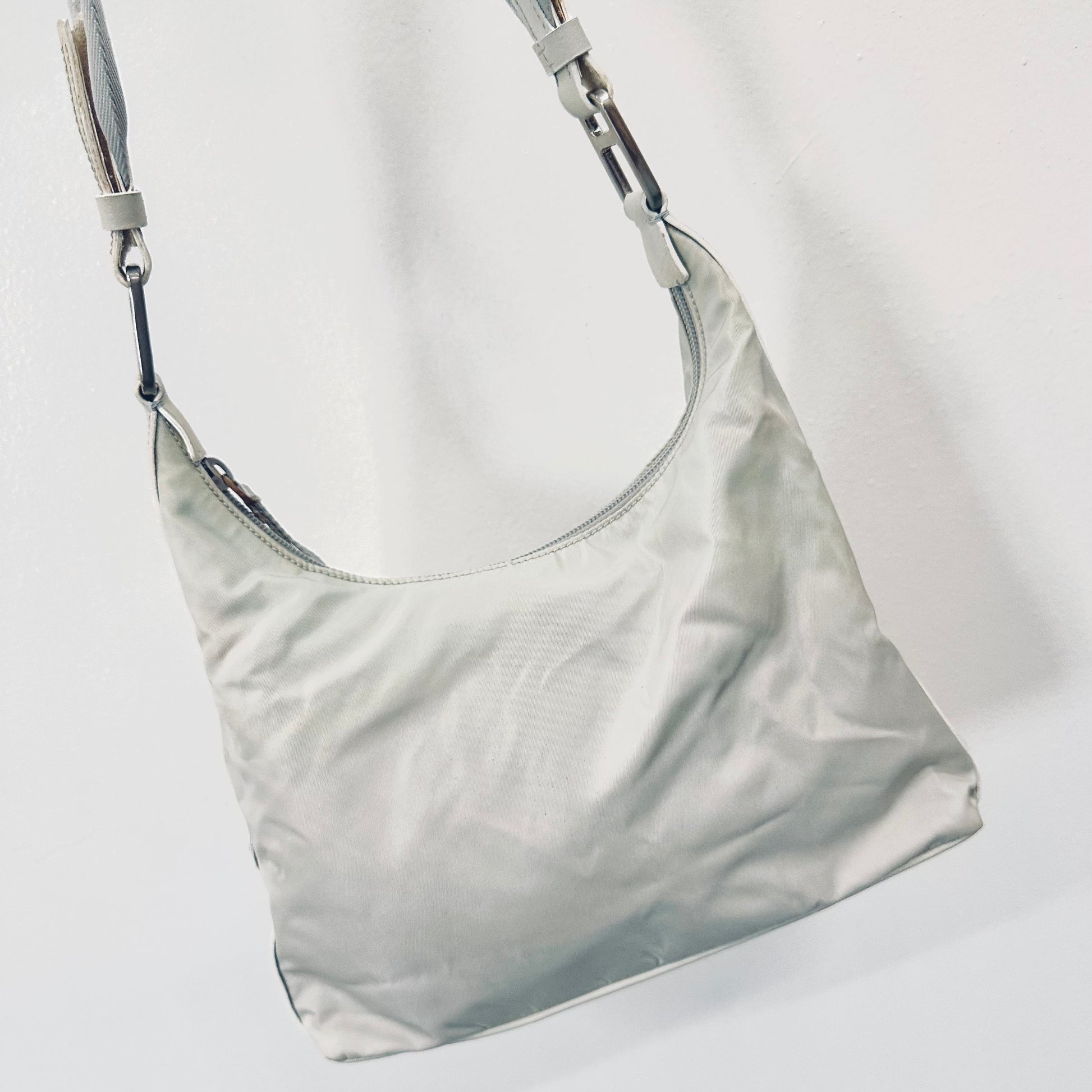 Prada Cristallo Light Grey Tessuto Summer Nylon Classic Logo Hobo Baguette Shoulder Sling Bag