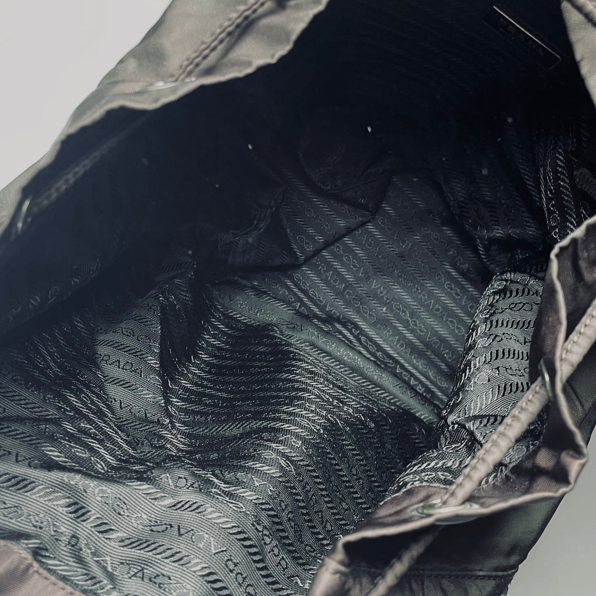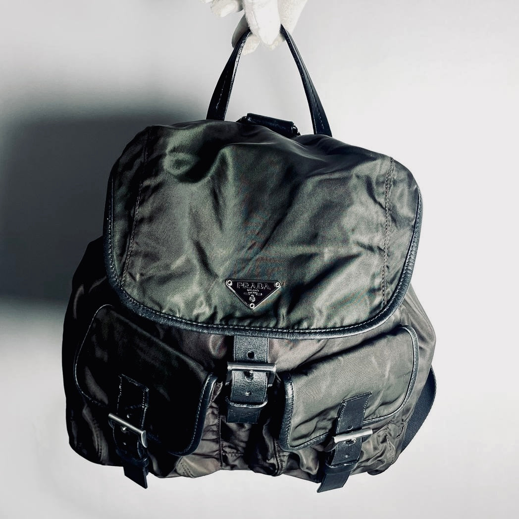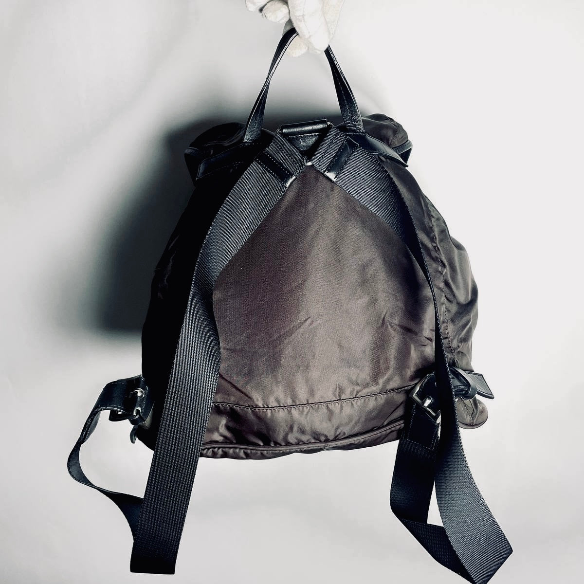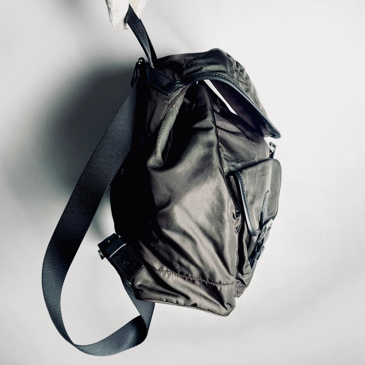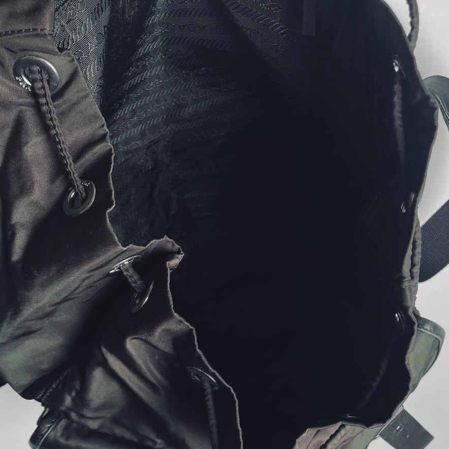 Prada Khaki Brown Tessuto Classic Logo Nylon & Leather Backpack Flap Drawstring Bag