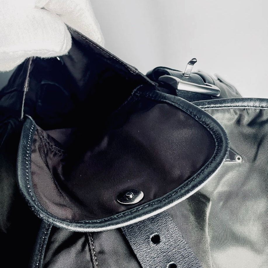 Preloved 9.4/10. This has adjustable straps, magnetic flap buckle front pockets and flap closure (so you can leave them unbuckled and just use the button), drawstring central compartment and zip pocket. This measures 30x29x14cm.