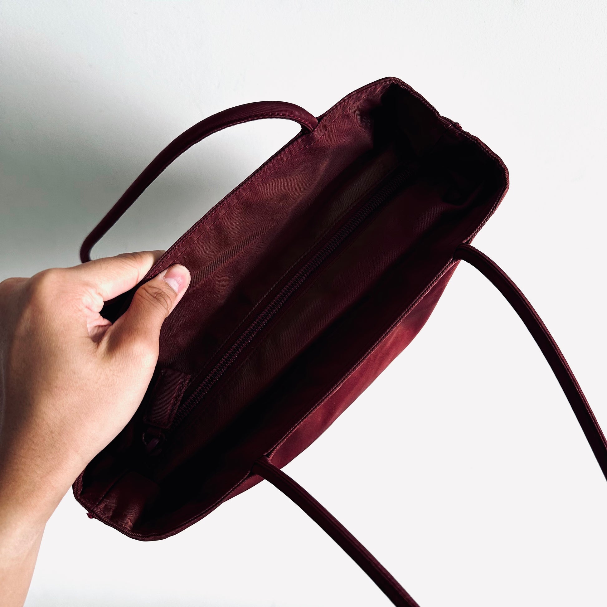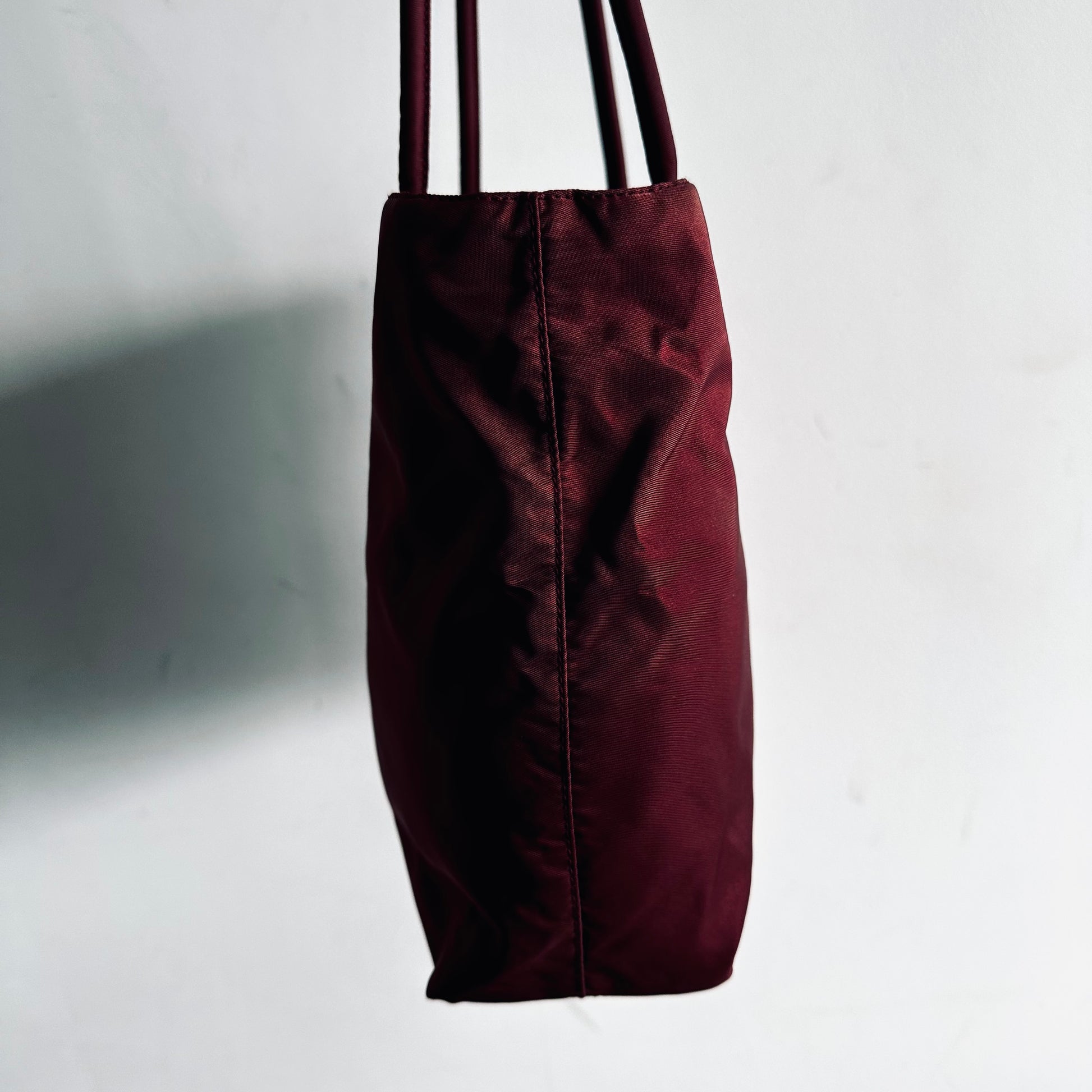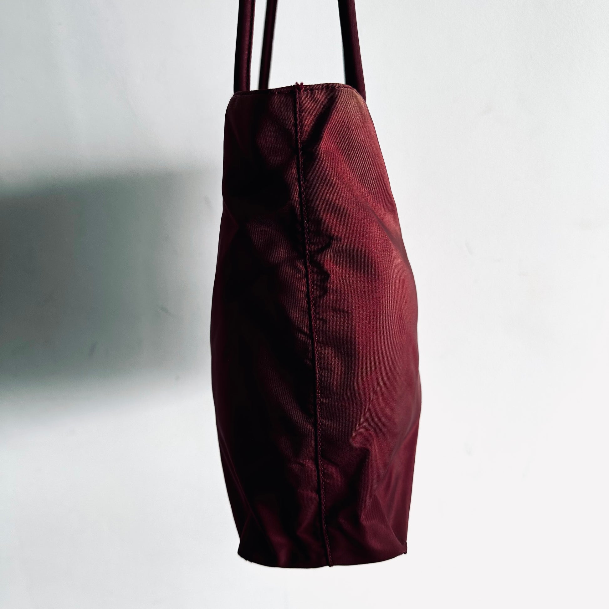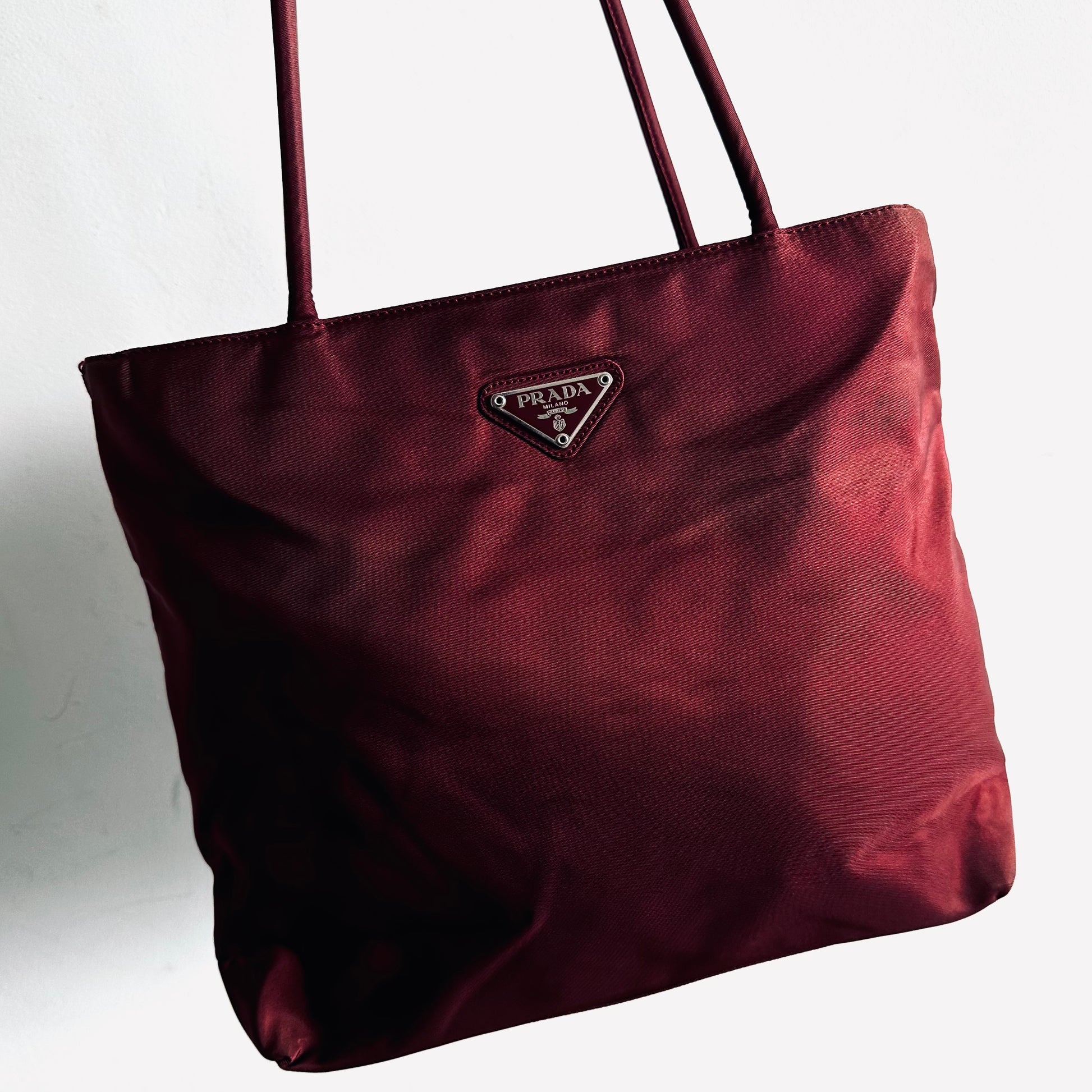 Prada Maroon Burgundy Red Classic Logo Nylon Shopper Zip Shoulder Tote Bag