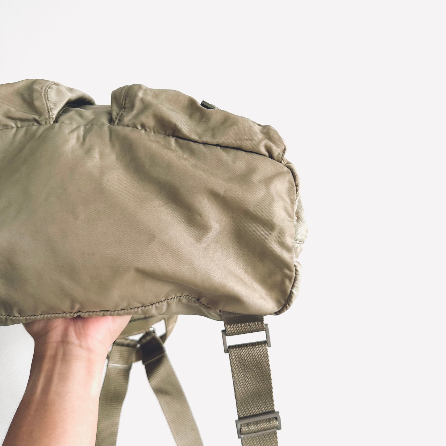 Prada Taupe Beige Tessuto Classic Logo Nylon & Leather Backpack Flap Drawstring Bag