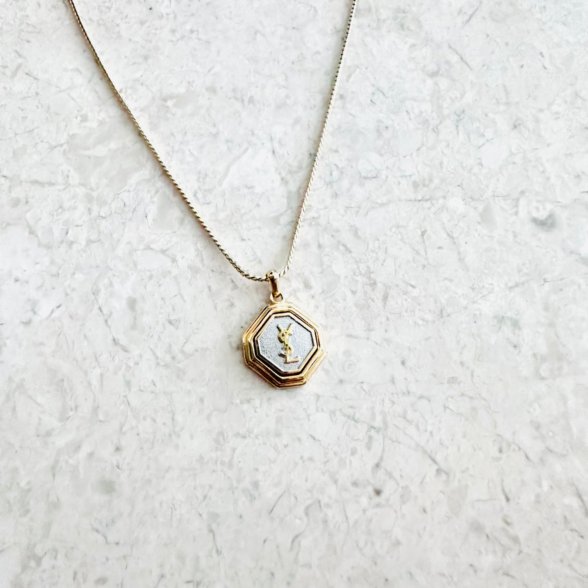 YSL Yves Saint Laurent Grey & Gold Monogram Logo Pendant Chain Necklace